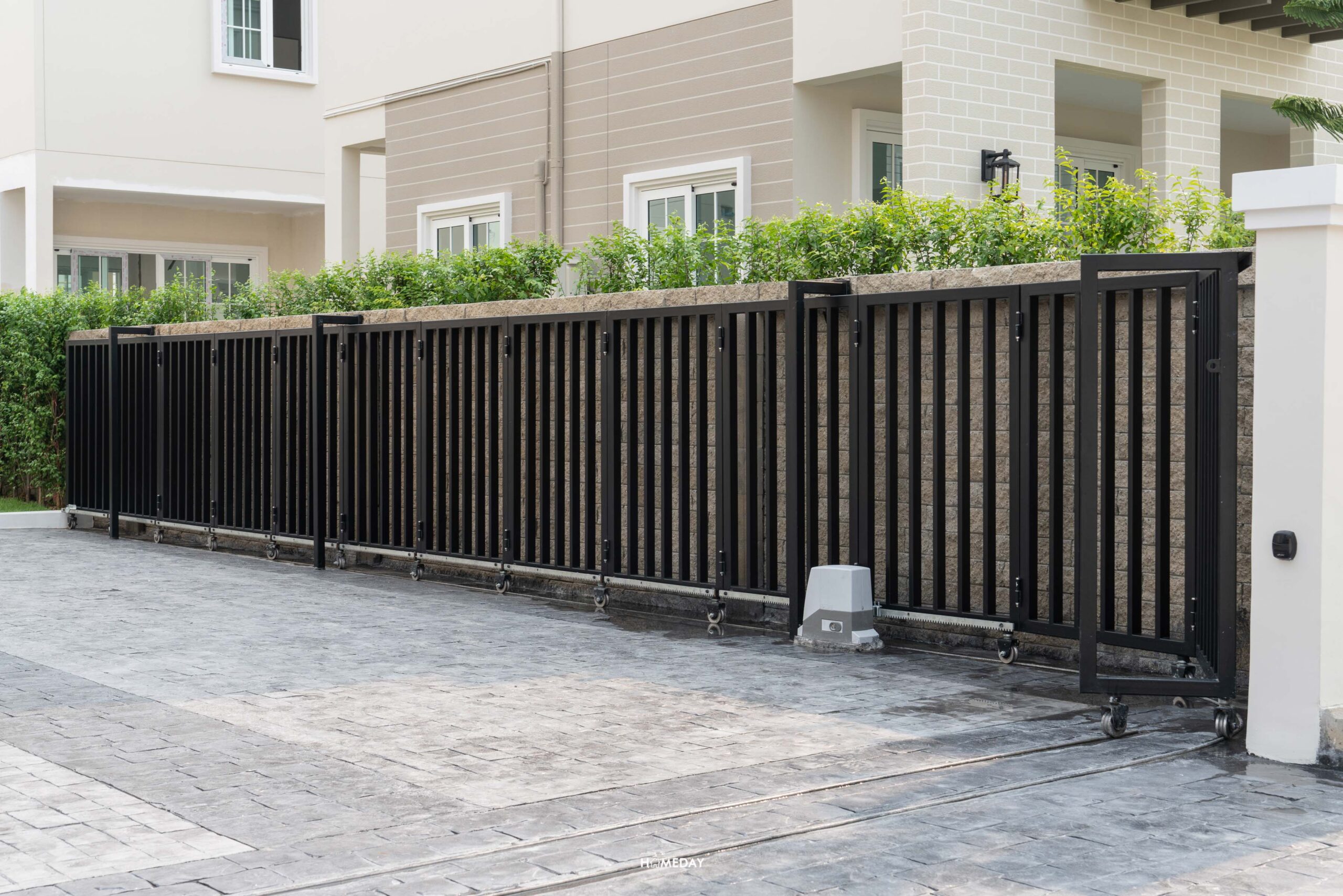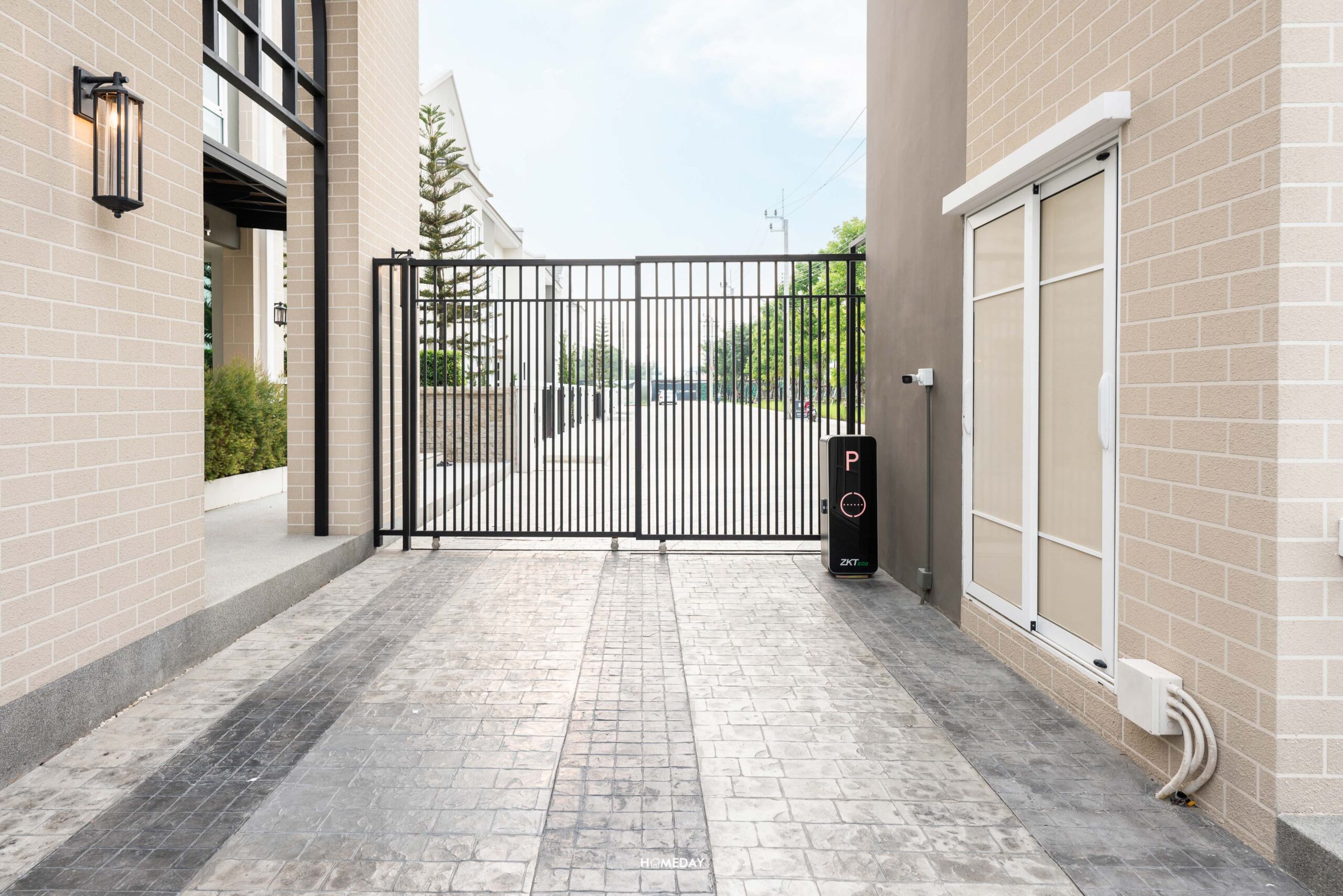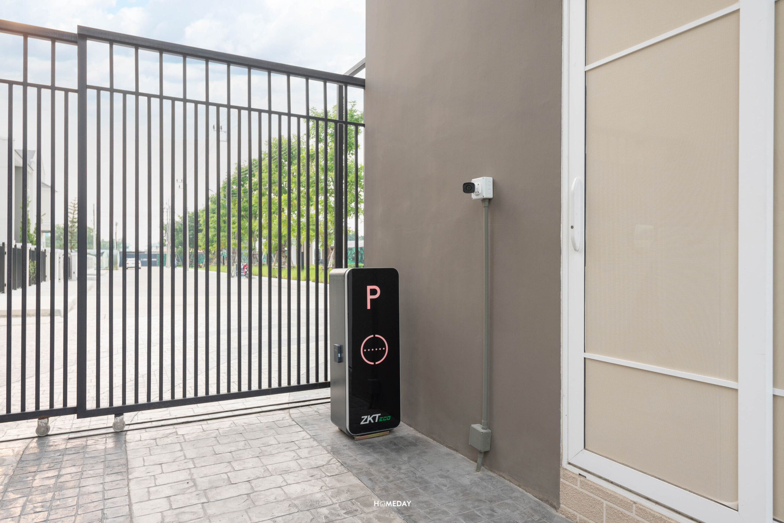 รั้วเหล็กอัตโนมัติ ควบคุมผ่านรีโมต เก็บรางโค้งเข้ากำแพงทำประหยัดพื้นที่ และดูเป็นระเบียบ เรียบร้อย ซึ่งทางโครงการให้เป็นมาตรฐานเหมือนกันครับ