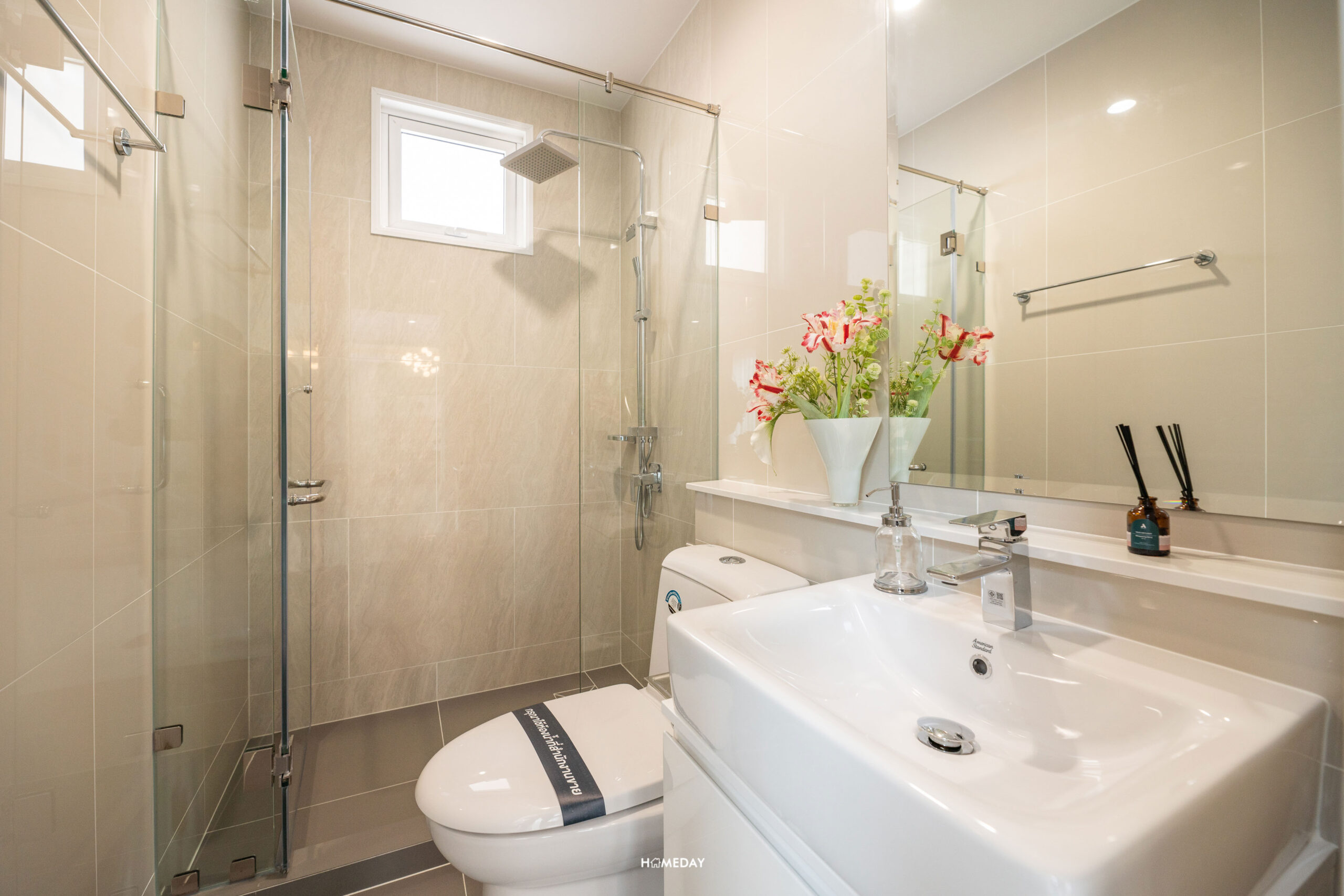 ถัดมาจะเป็นห้องน้ำ ภายในได้ชุดสุขภัณฑ์มาตรฐานของ American Standard พร้อมกั้นกระจกเป็น Shower Box ให้ฝักบัวเป็น Hand Shower และ Rain Shower ลูกบ้านสามารถติดตั้งเครื่องทำน้ำอุ่นได้เลย เพราะทางโครงการวางระบบไฟไว้ให้แล้ว มีหน้าต่างบานกระทุ้งมาให้ ช่วยระบายอากาศ ลดความชื้นและเชื้อราภายในห้องน้ำ ทางโครงการทำ Low Wall มาให้หลังอ่างล้างหน้าและโถสุขภัณฑ์ มีเต้าเสียบปลั๊กพร้อมฝาปิดกันน้ำมาให้ สามารถใช้งานอุปกรณ์ทำผมต่าง ๆ ได้สะดวก