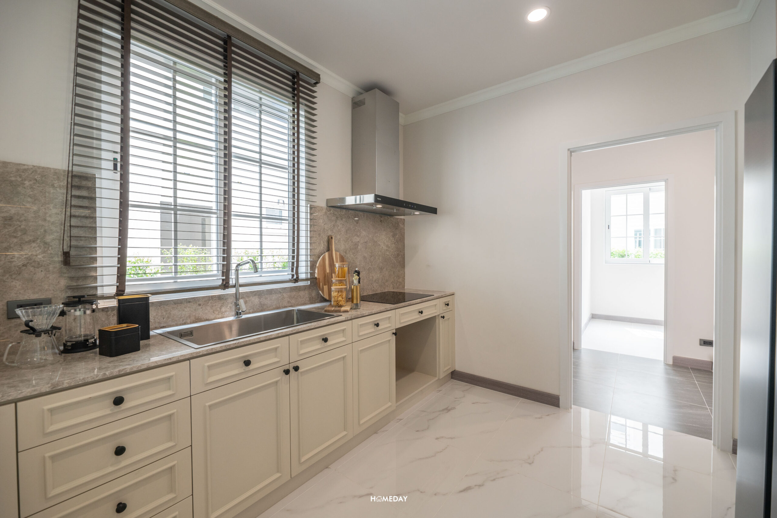 เชื่อมต่อ Pantry เข้าสู่ห้องครัวไทย ภายในมีช่องแสงเป็นหน้าต่างบานเลื่อนมาให้ 1 บาน เปิดระบายอากาศและความชื้นได้ สามารถ Built-in ตู้เก็บเครื่องใช้ในครัวเรือนและชุดเคาน์เตอร์ครัว โดยยังมีพื้นที่เหลืออีกฝั่ง ให้วางตู้เย็นขนาดใหญ่ได้สบาย ๆ บ้านเปล่าทางโครงการมีการวางระบบน้ำและไฟไว้ให้เป็นมาตรฐานอยู่แล้วครับ