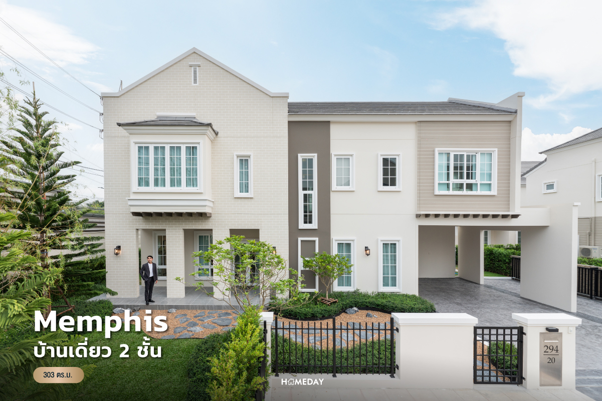 แบบบ้าน Memphis เป็นขนาดแบบบ้านเริ่มต้นของโครงการ ที่ยังคงคอนเซ็ปต์ “บ้านเดี่ยวหรู ที่ดินเริ่มต้น 100 ตร.ว. ในแบบ Dutch Colonial Style” ผสมผสานความโมเดิร์นไว้อย่างลงตัว Facade หน้าบ้านมีเอกลักษณ์ด้วย หน้าจั่วทรงสูง และ Bay Window เพื่อเพิ่มพื้นที่ใช้สอยภายในบ้าน และยังมีระแนงไม้ข้างใต้ เพิ่มร่มเงาให้กับทางเข้าบ้านได้อีกด้วย