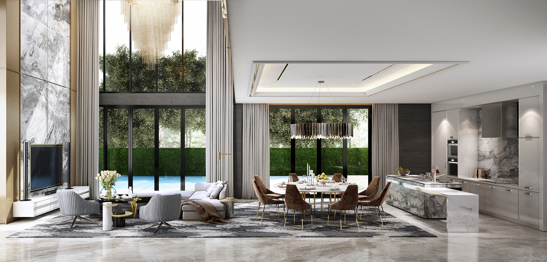 แบบบ้าน : A-VERY modern luxury series พื้นที่ใช้สอย 715 ตร.ม. ขนาดที่ดิน 170 ตร.ว. 5 Bedroom 6 Bathroom 5 Parking Lot 1 Double Volume Living 2 Multi – purpose Room 1 Maid Room 1 Swimming Pool (Option)