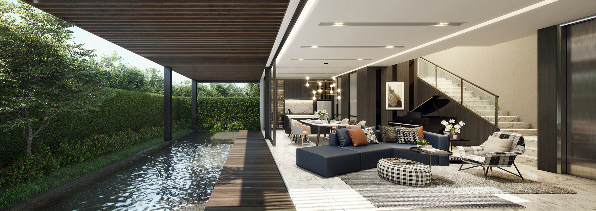 แบบบ้าน : A-VERY minimal series พื้นที่ใช้สอย 715 ตร.ม. ขนาดที่ดิน 170 ตร.ว. 5 Bedroom 6 Bathroom 5 Parking Lot 1 Double Volume Living 2 Multi – purpose Room 1 Maid Room 1 Swimming Pool (Option)