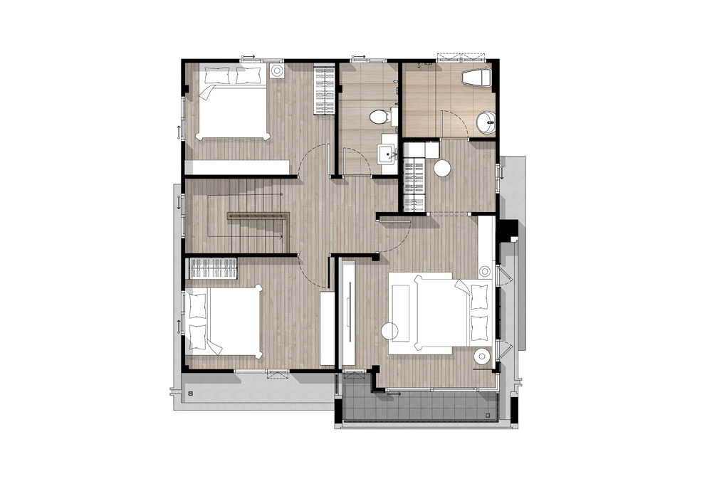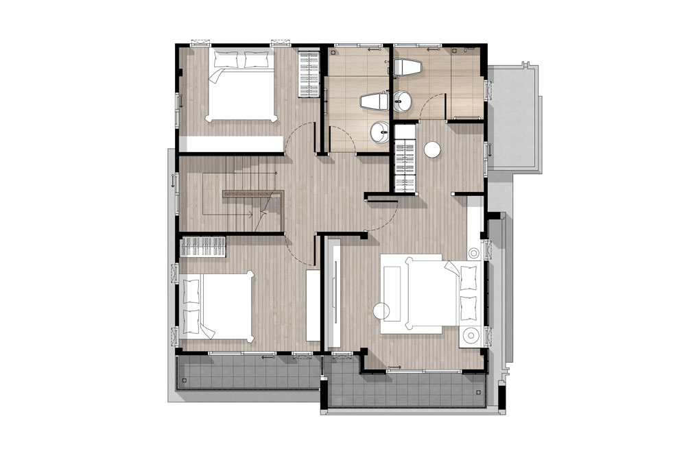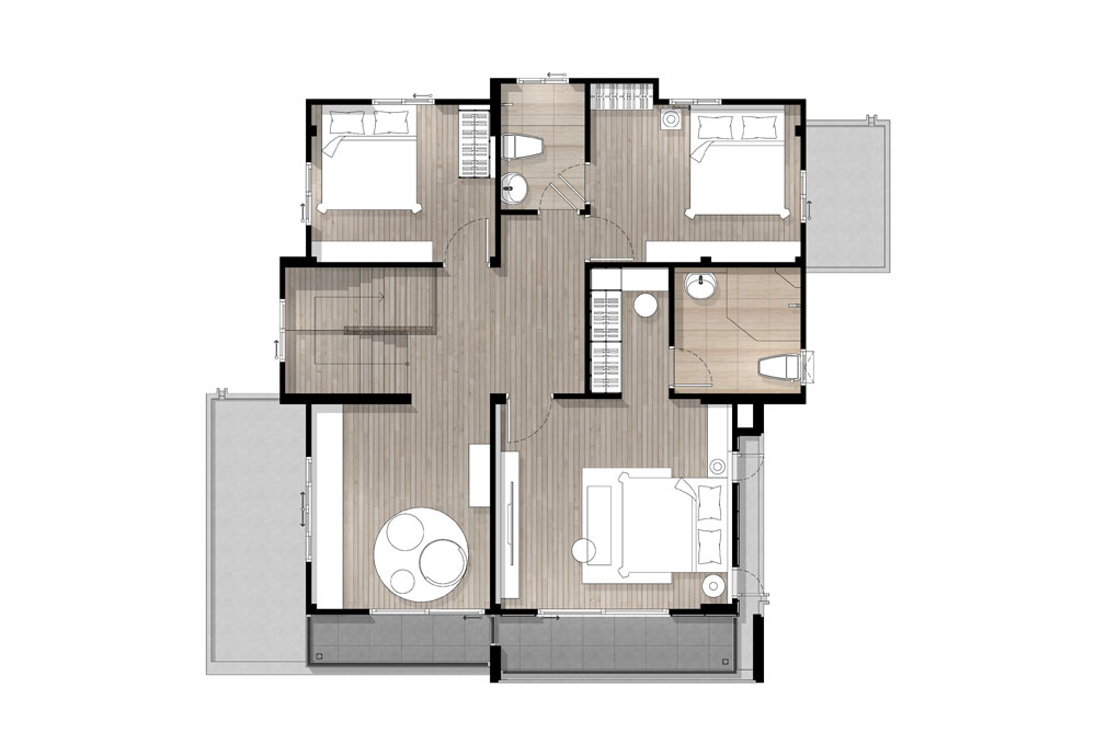 RESIDENCES SIZE I: พื้นที่ใช้สอย 369 ตร.ม. 5 ห้องนอน, 6 ห้องน้ำ, 2 ห้องนั่งเล่น, 4 ที่จอดรถ และ 1 ห้องแม่บ้าน Residence I (Type L) แปลนบ้านแบบ L-Shape