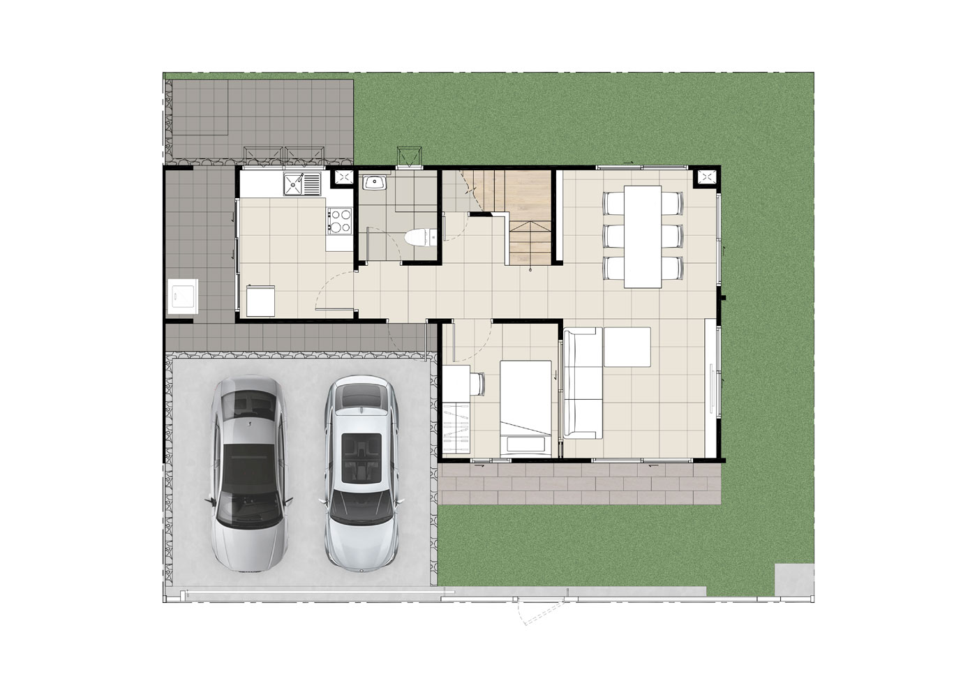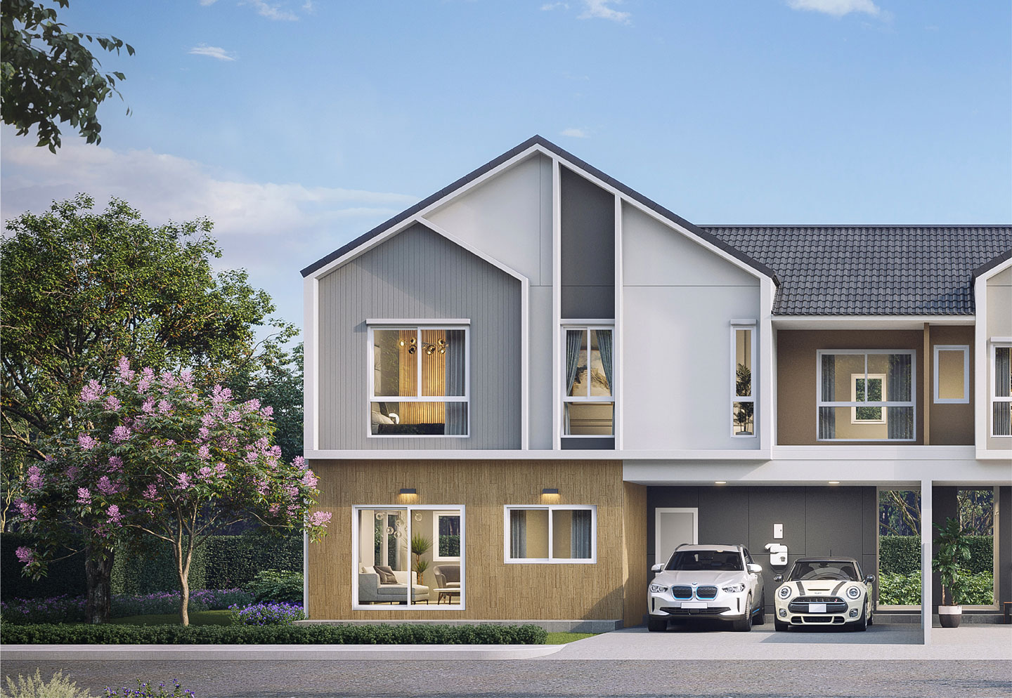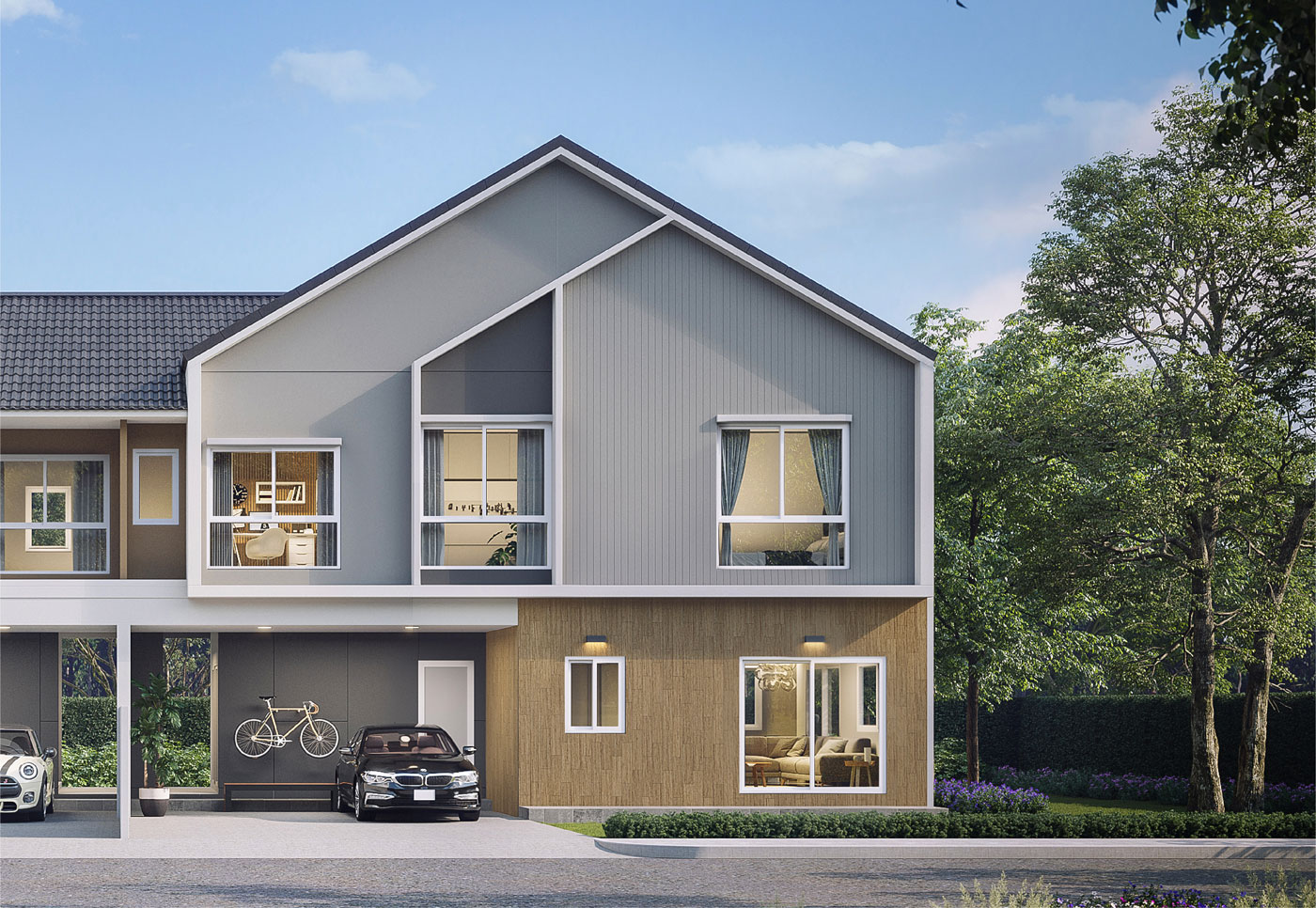 แบบบ้าน : CANE พื้นที่ใช้สอย 180 ตารางเมตร 4 ห้องนอน 3 ห้องน้ำ 1 ห้องรับแขก 1 ห้องรับประทานอาหาร ครัวแยกสัดส่วน เคาน์เตอร์เตรียมอาหาร ระเบียงชมวิว ที่จอดรถ 2 คัน