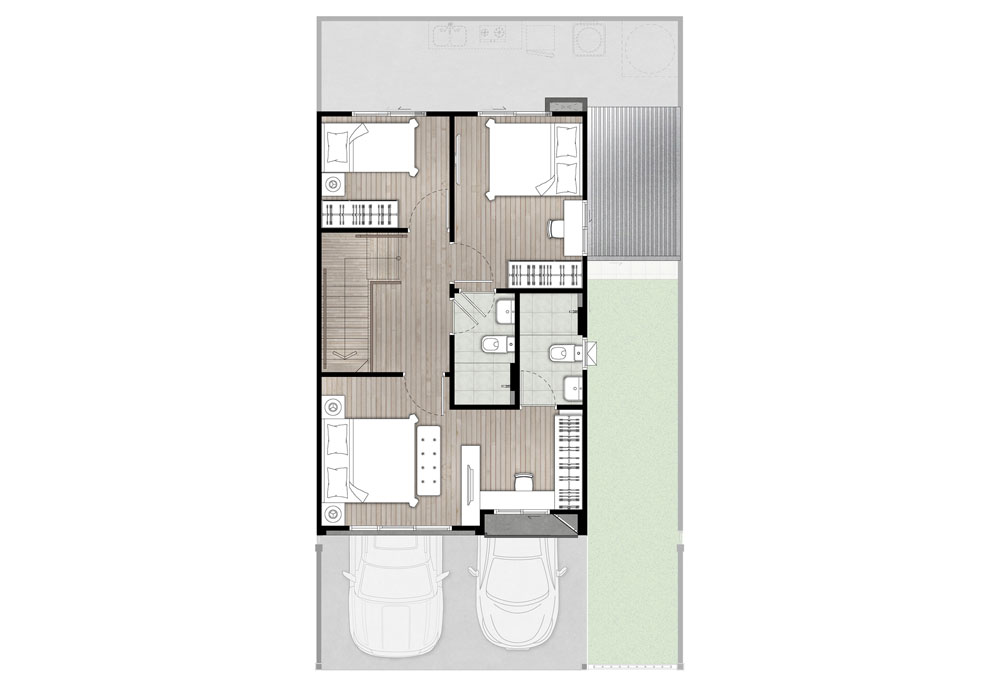 แบบบ้าน : เลซิน่า พื้นที่ใช้สอย 120 ตร.ม. 4 ห้องนอน 3 ห้องน้ำ 1 ห้องรับแขก 1 ห้องรับประทานอาหาร 1 ห้องครัว 1 ห้องเอนกประสงค์ 2 ที่จอดรถ แบบบ้าน : มิลาโน