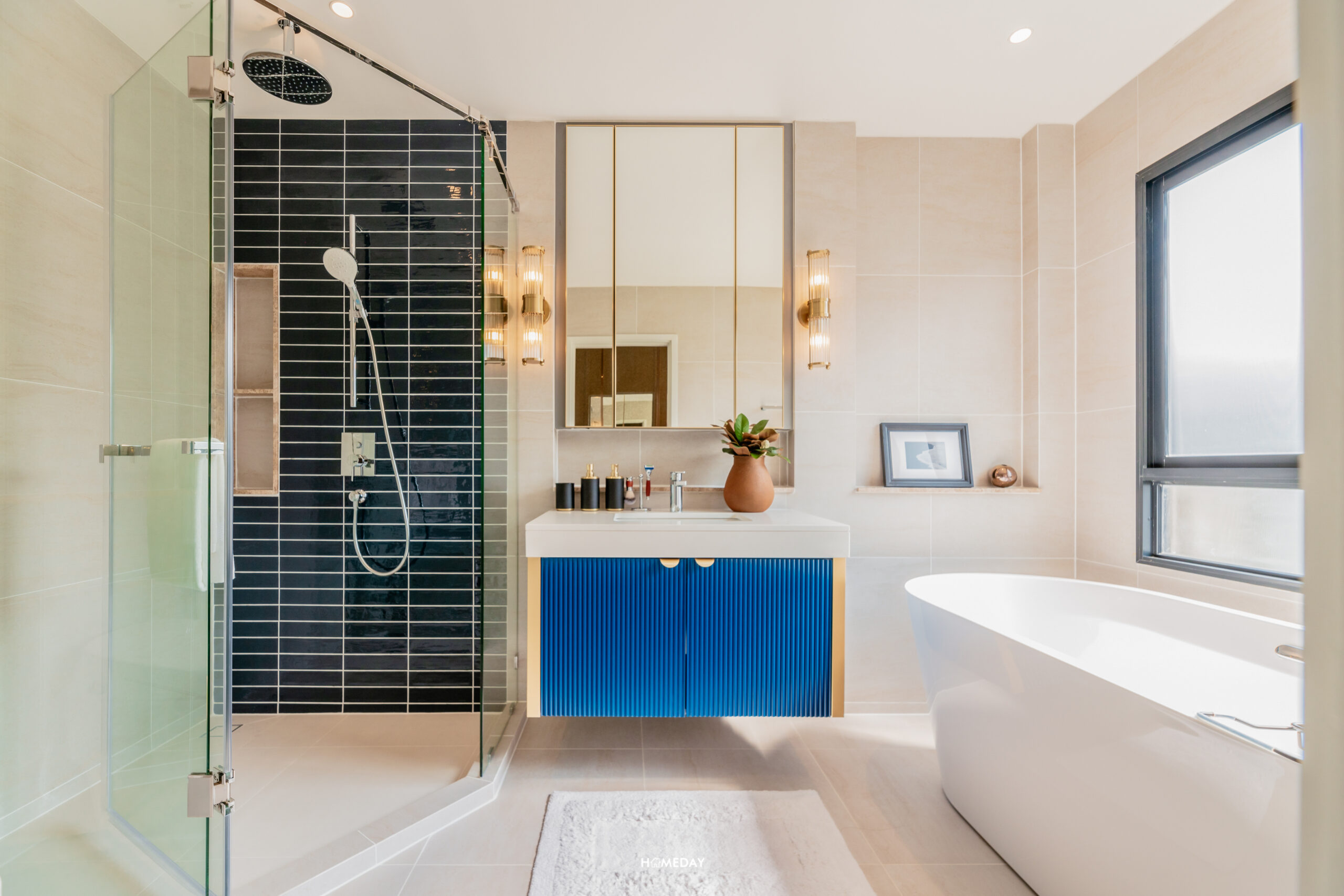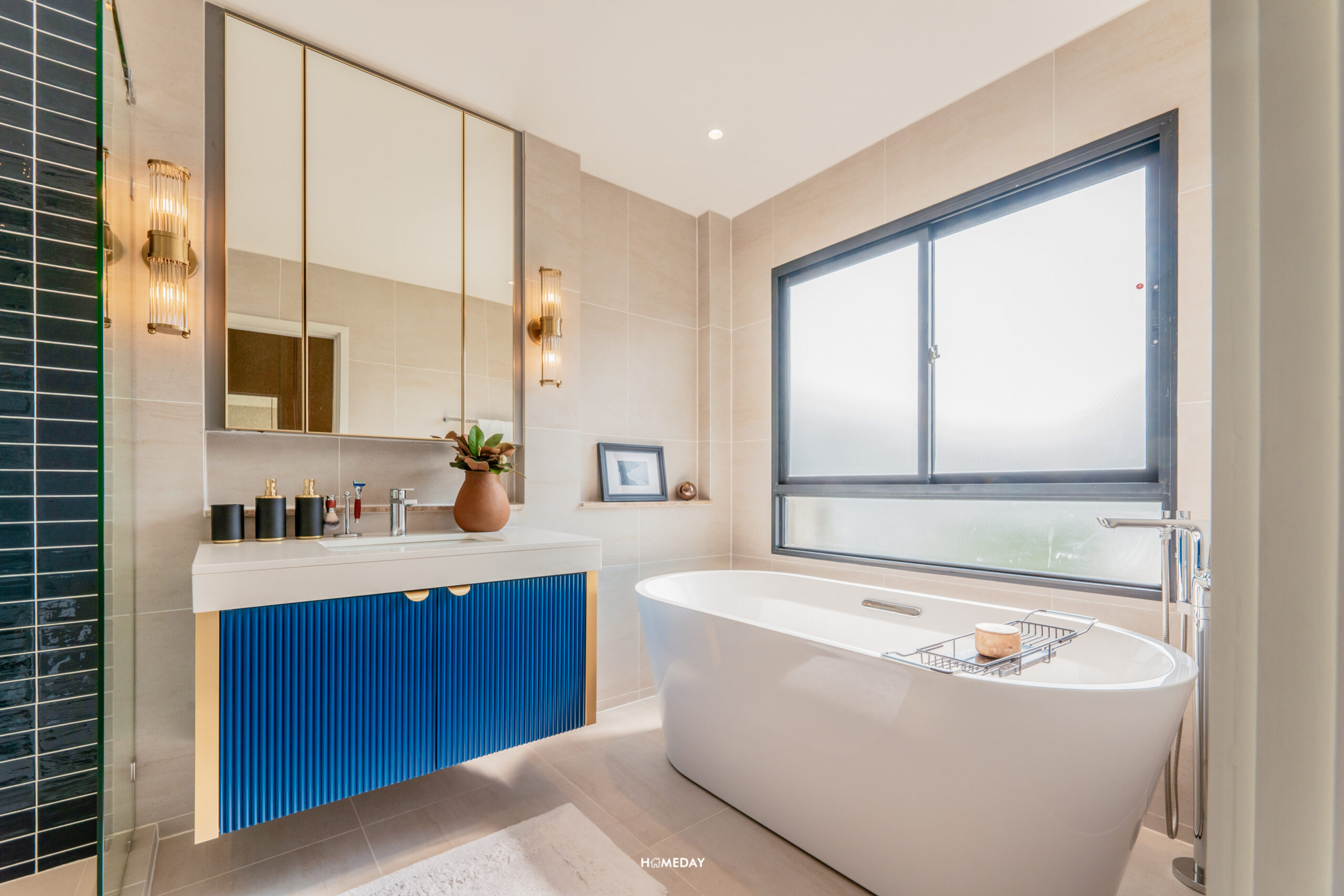 ในส่วนของ Master Bathroom แน่นอนว่าได้พื้นที่ขนาดใหญ่พิเศษแตกต่างจากห้องนอนอื่น ๆ อยู่แล้วครับ โดยห้องนี้จะได้เพิ่มมาในส่วนของอ่างอาบน้ำ อยู่ชิดติดริมหน้าต่าง รับแสงและระบายอากาศได้เป็นอย่างดี มี Drop Wall สำหรับวางของมาให้ด้วยเช่นกัน
