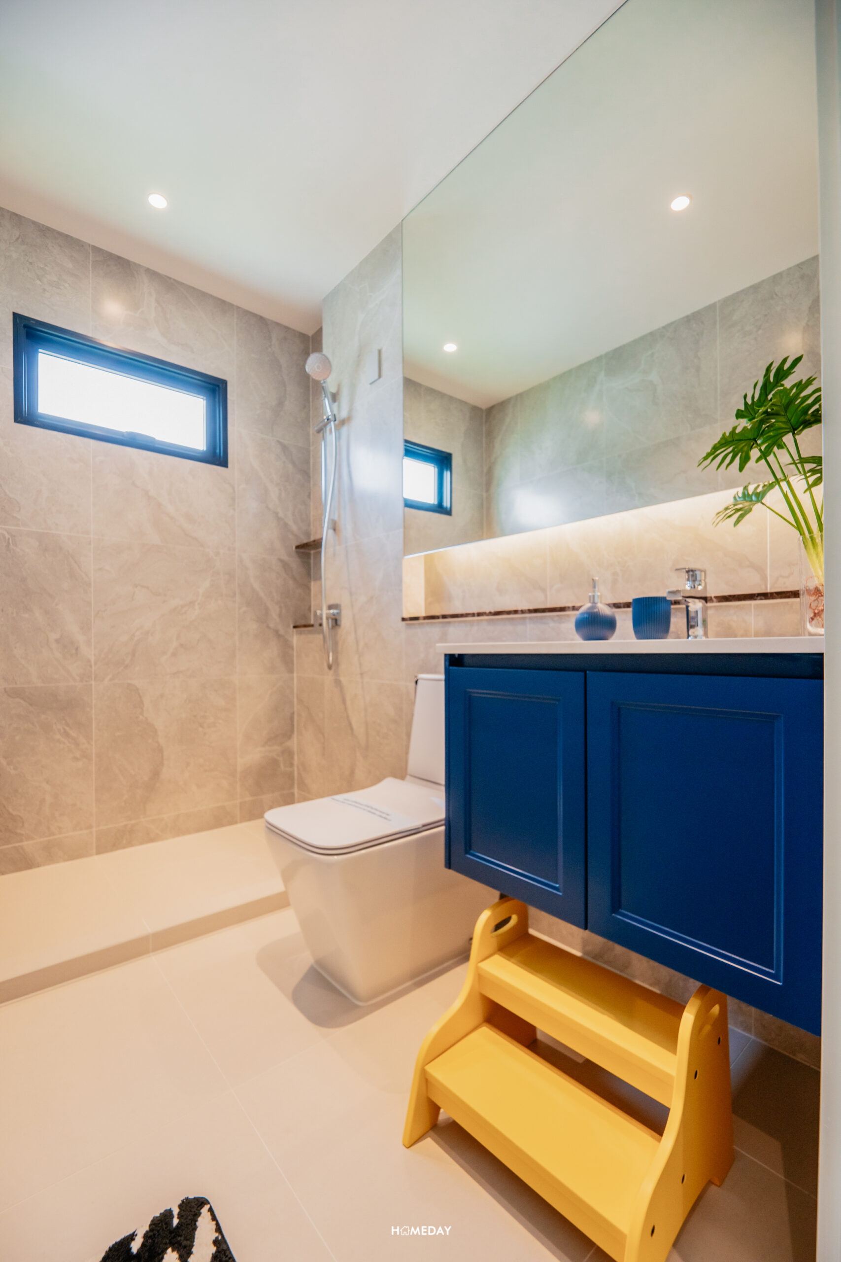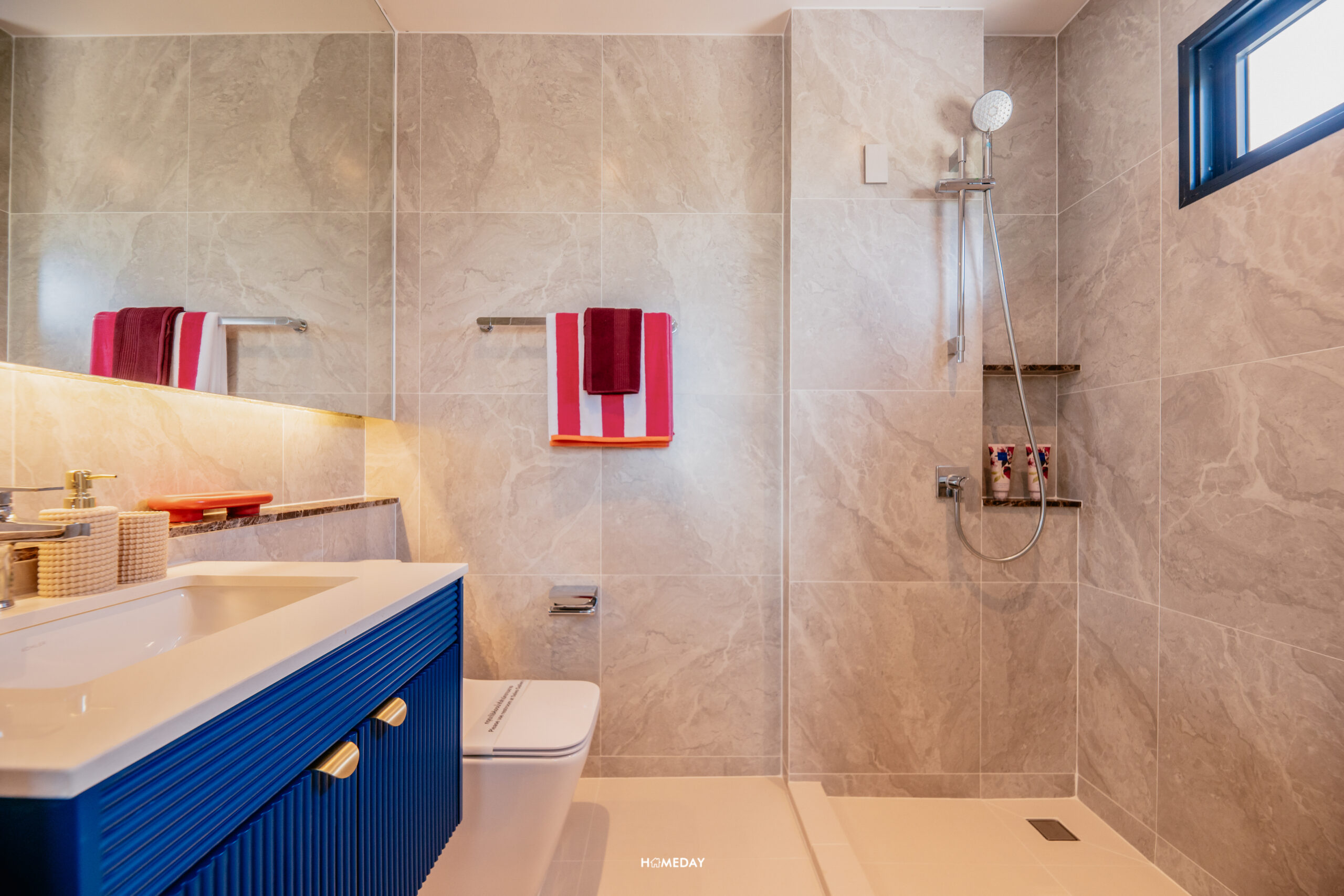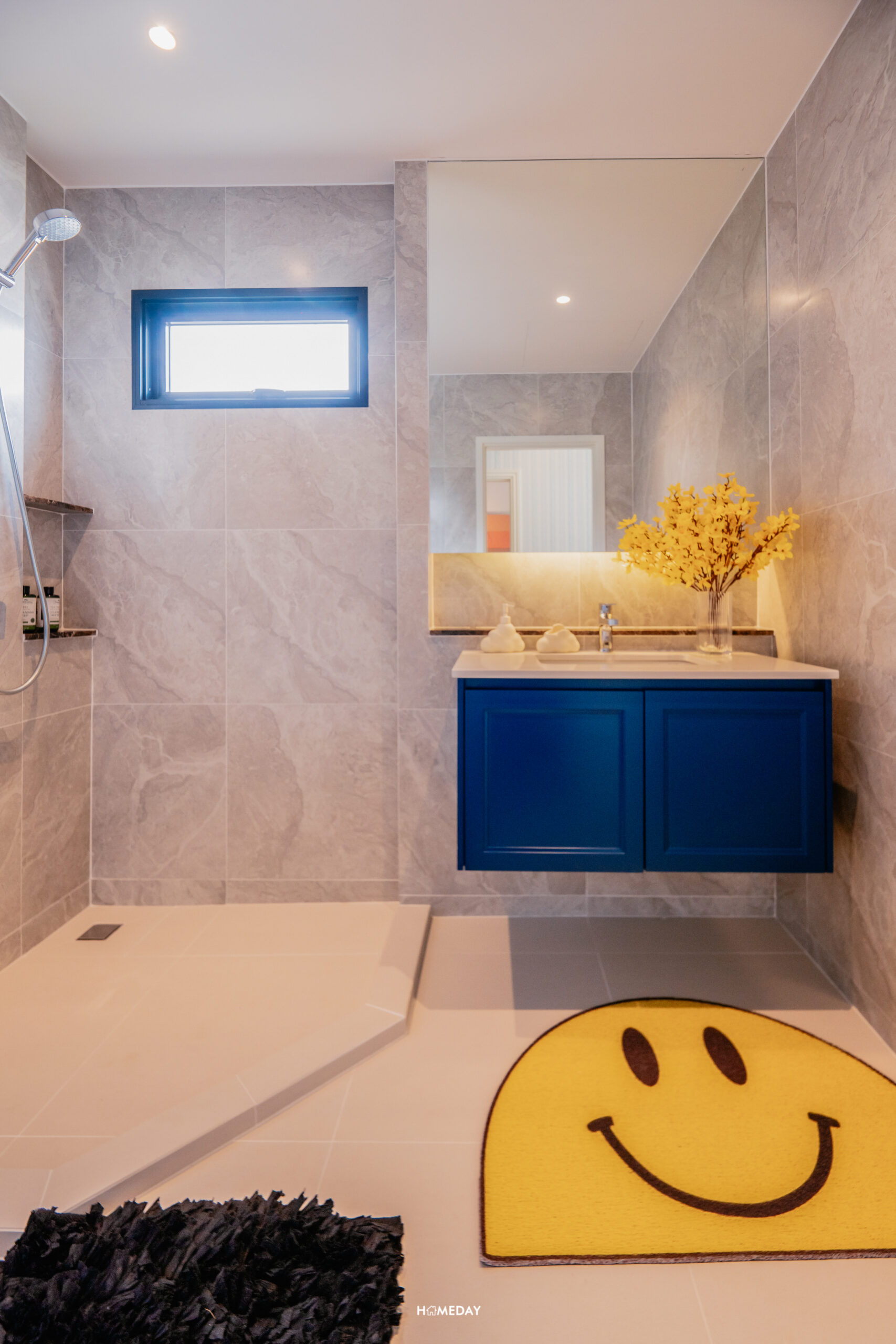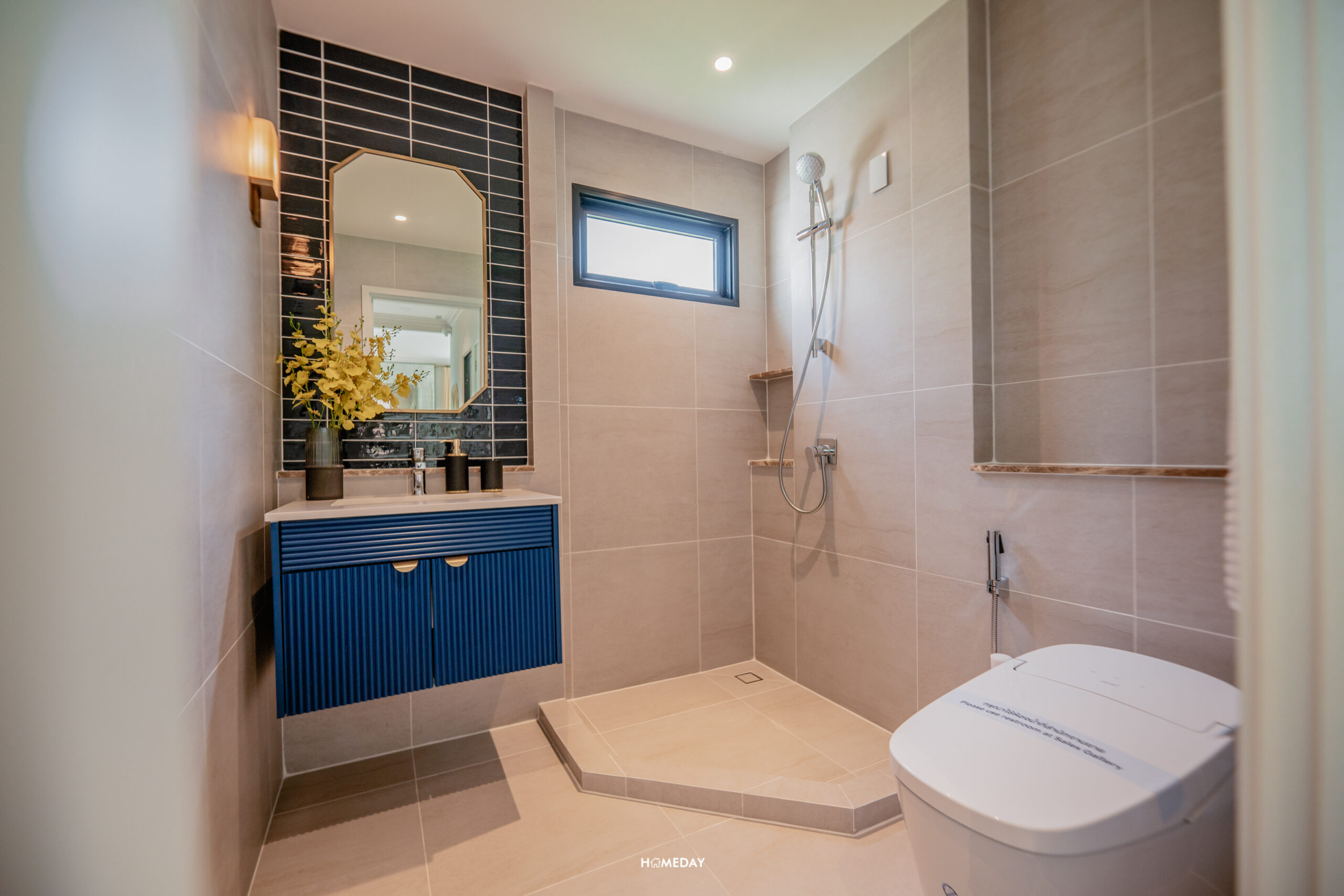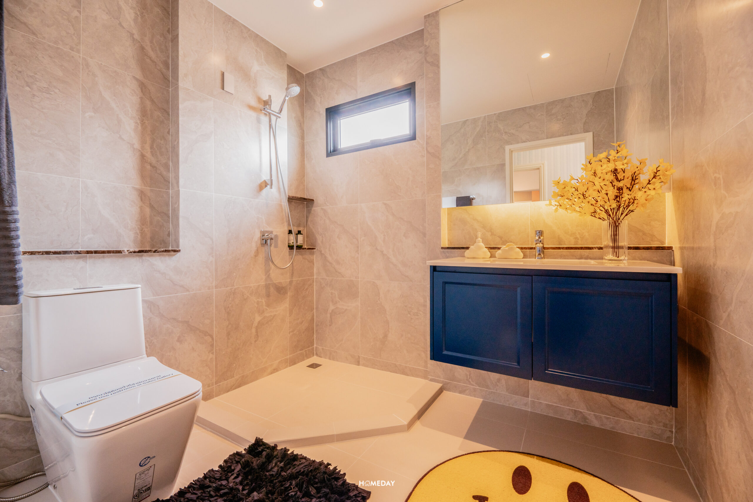 ห้องน้ำชั้นล่างก็อยู่ถัดไปจาก Bedroom 4 เลยครับ ขั้นกลางด้วยประตูทางเข้าเชื่อมโรงรถ ภายในห้องน้ำได้ตามแบบบ้านตัวอย่างทุกประการเลยครับ งานบิลต์อินต้องบอกเลยว่าทำออกมาได้ดีมาก ๆ ทำ Drop Wall และ Low Wall มาให้เกือบทุกจุด ทั้งบริเวณอ่างล้างหน้า, ด้านหลังโถสุขภัณฑ์ และโซน Shower Box ใช้วางของได้สบายเลยครับ ท็อปอ่างล้างหน้าก็มีพื้นที่ให้วางของได้พอสมควร แถมยังมีบานตู้เก็บของด้านใต้มาให้ด้วย มุม Shower ถ้าอยากให้มีความเป็นสัดส่วนมากขึ้นก็สามารถเพิ่ม Partition กระจกนิรภัยได้เองเลยครับ