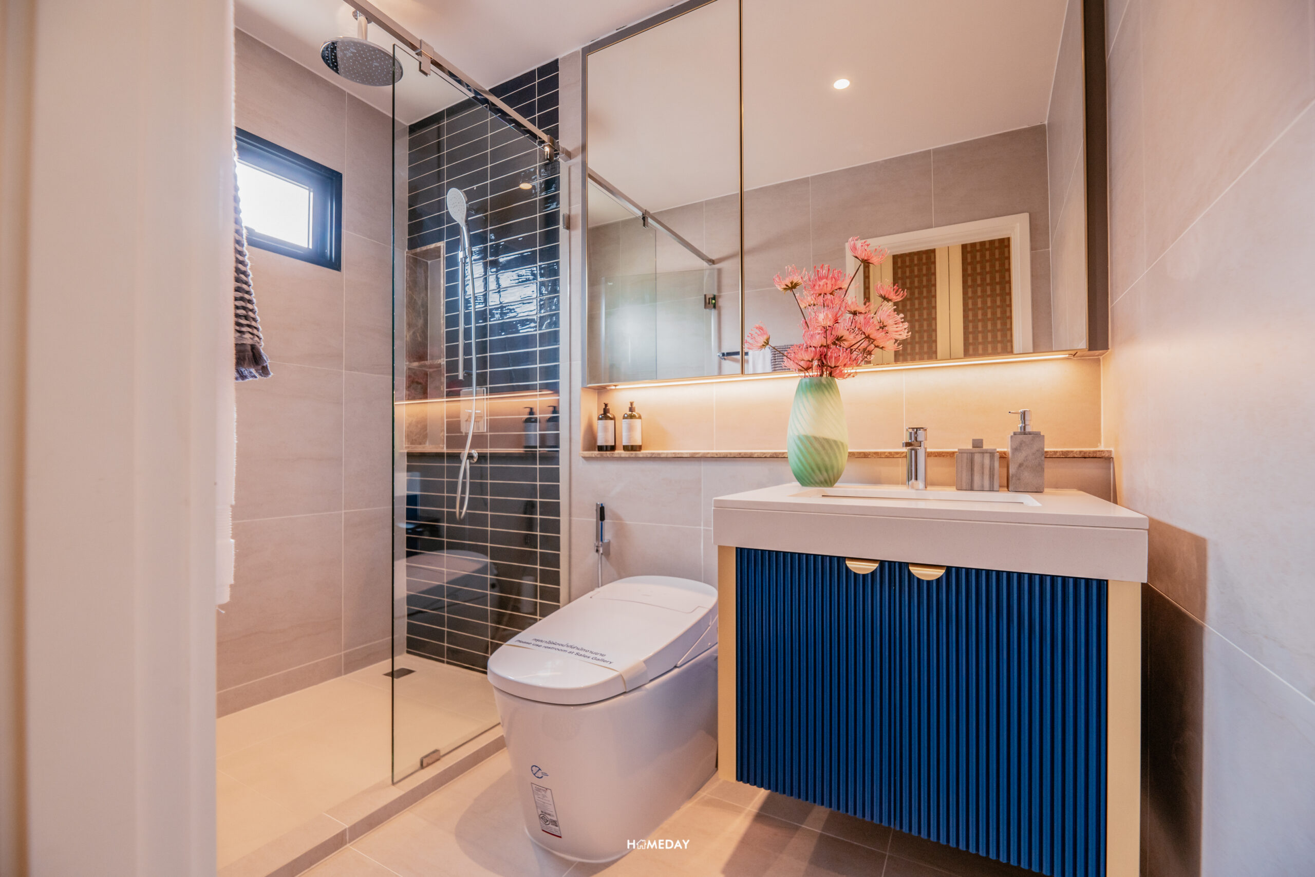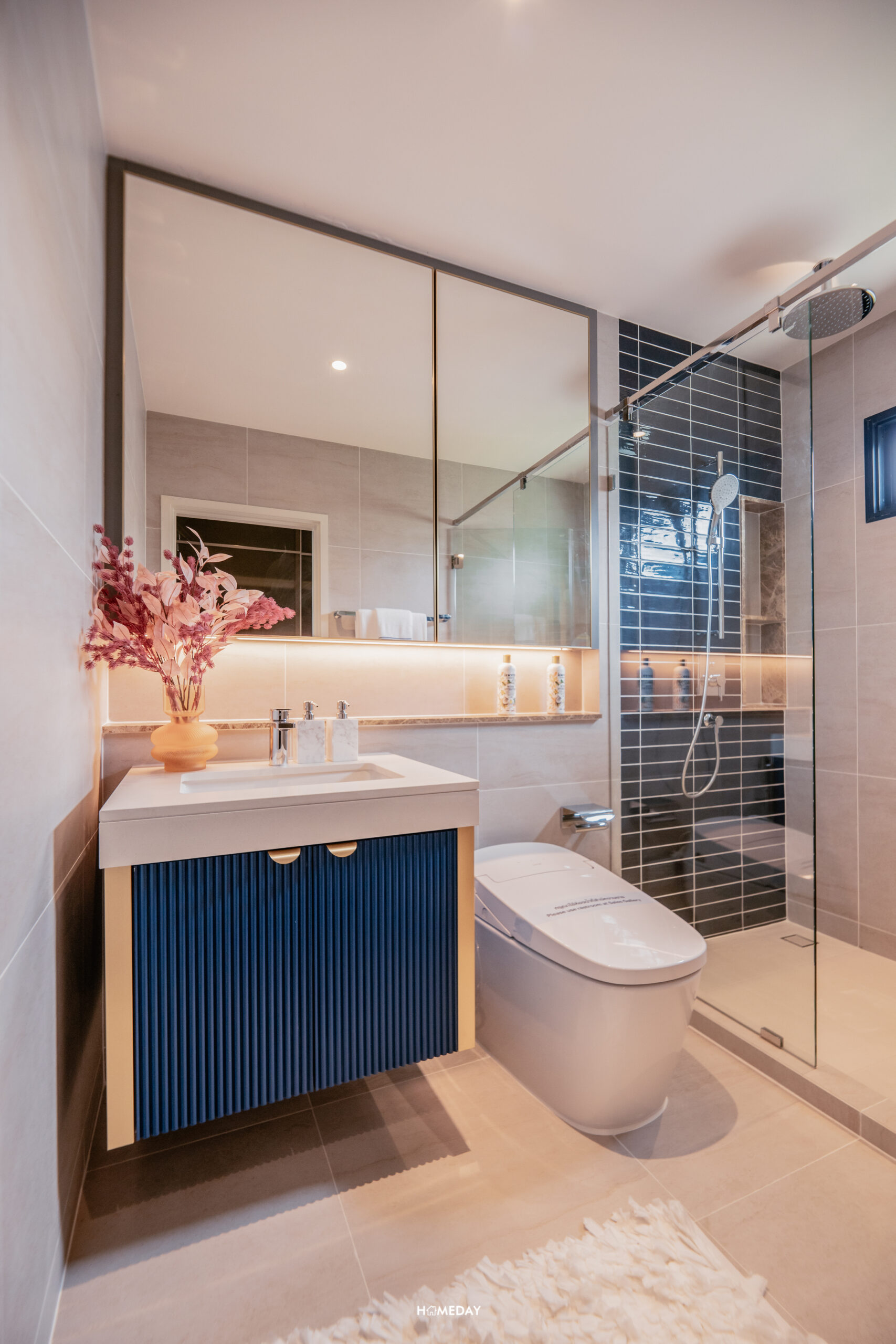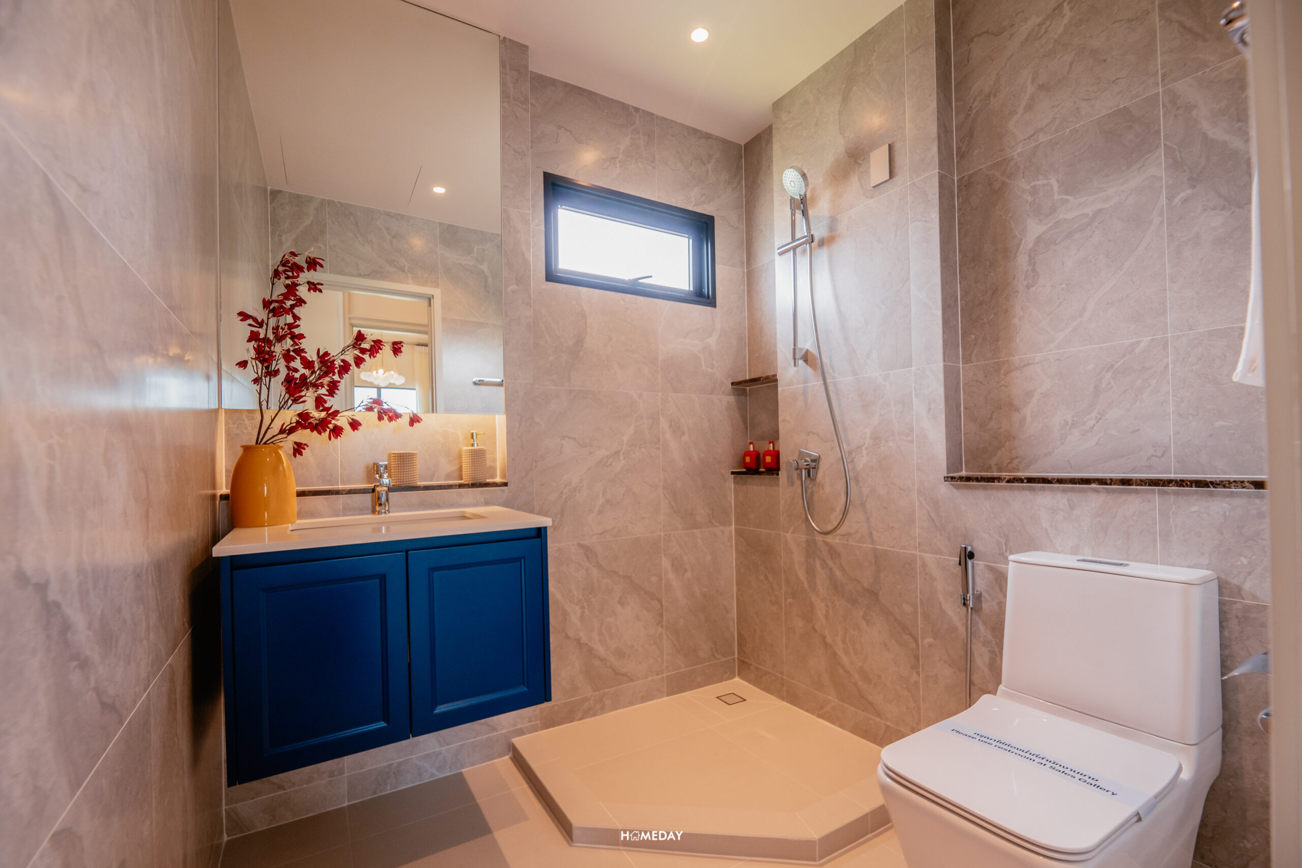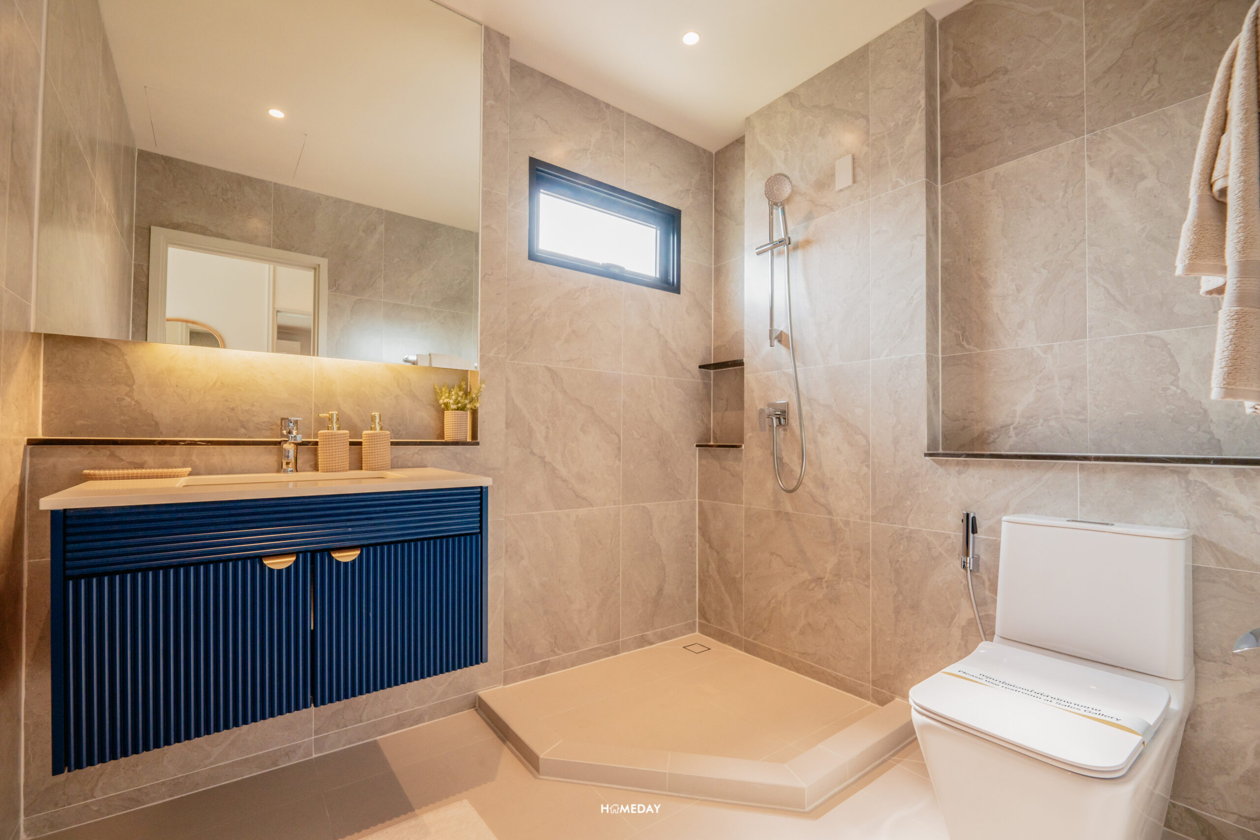 อ่างล้างหน้ามาพร้อม Drop Wall สำหรับวางของ และบานตู้เก็บของด้านใต้ ส่วนของ Shower Box ทางโครงการติดตั้ง Partition กระจกนิรภัยมาให้อย่างดี ด้านในได้เป็น Hand Shower และ Rain Shower พร้อมด้วย Drop Wall ติดประตูทางเข้าจะเป็นโถสุขภัณฑ์ ด้านหลังทำ Low Wall สำหรับวางของมาให้เหมือนเคยครับ