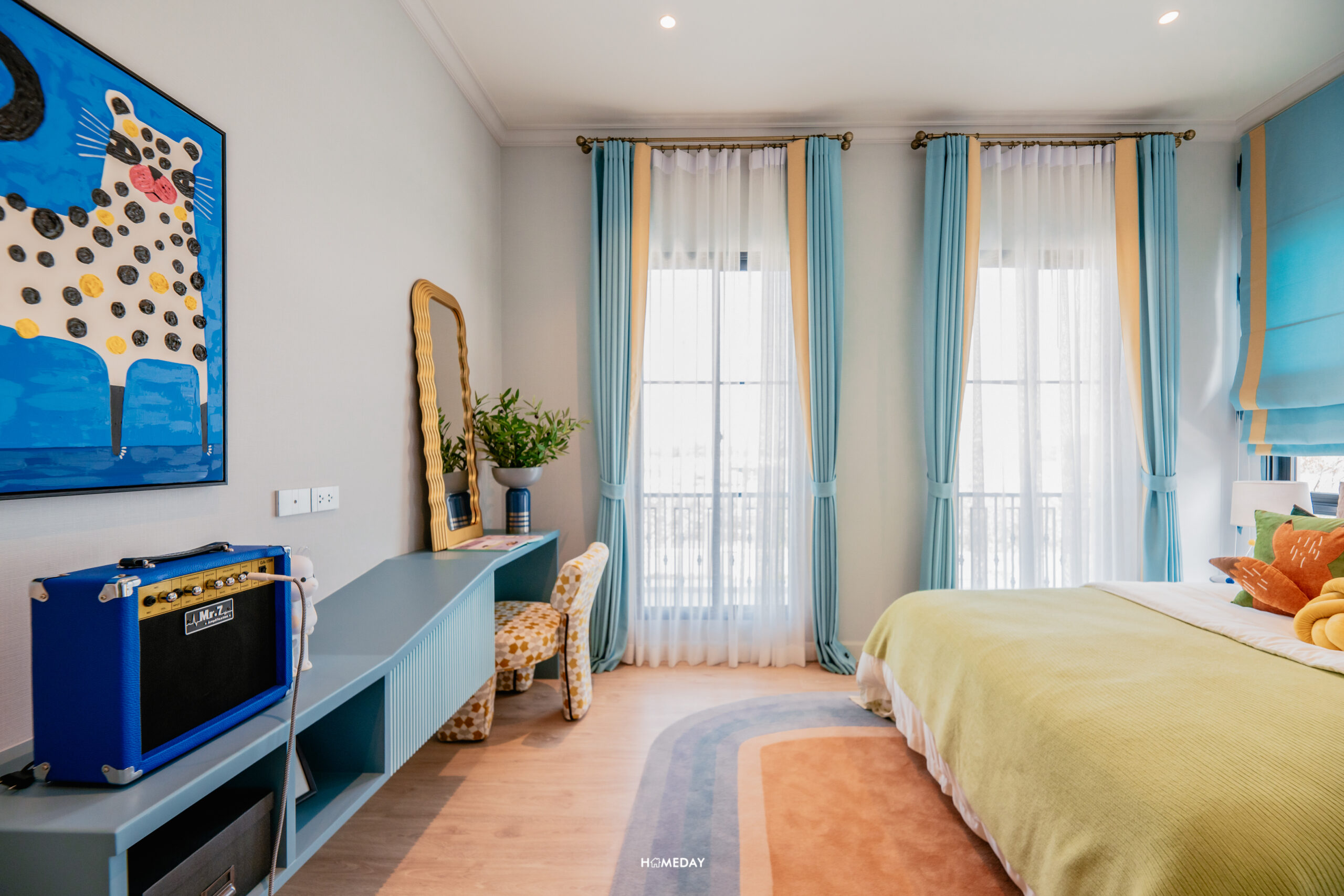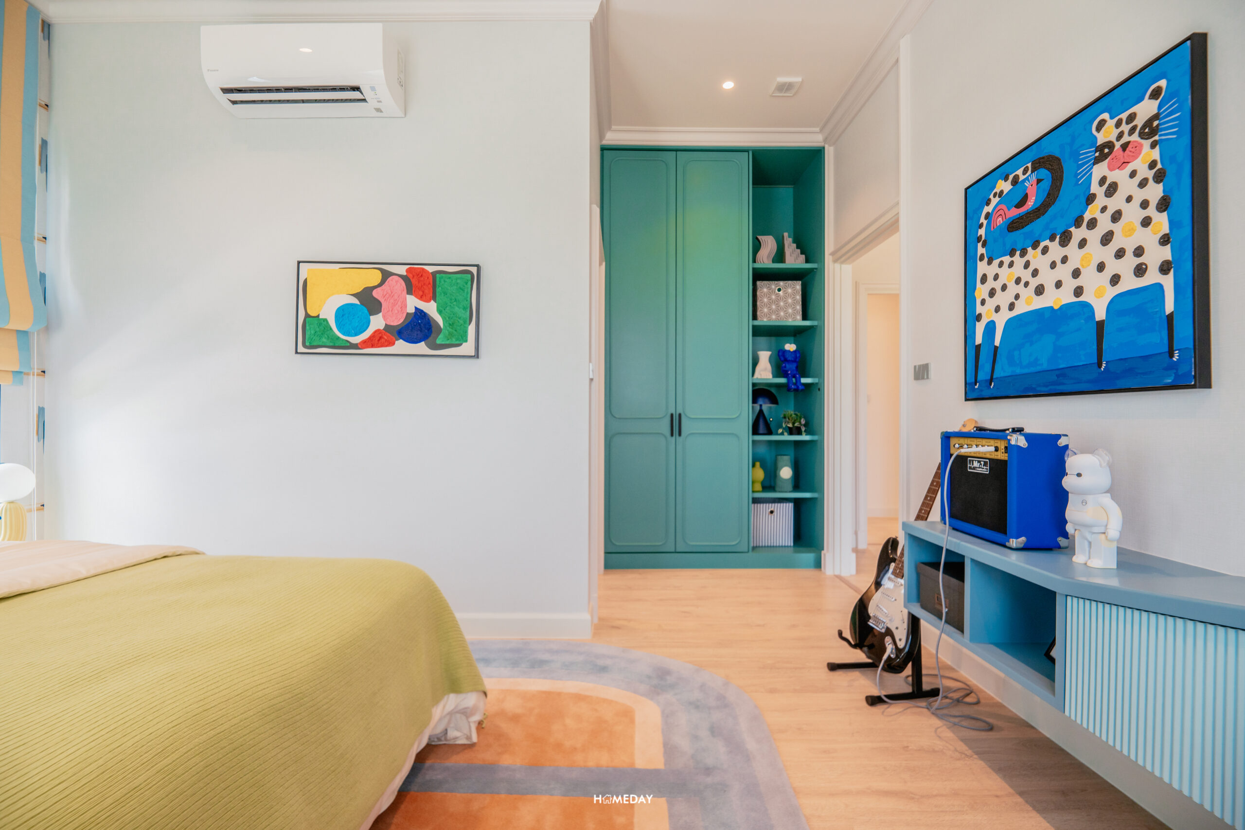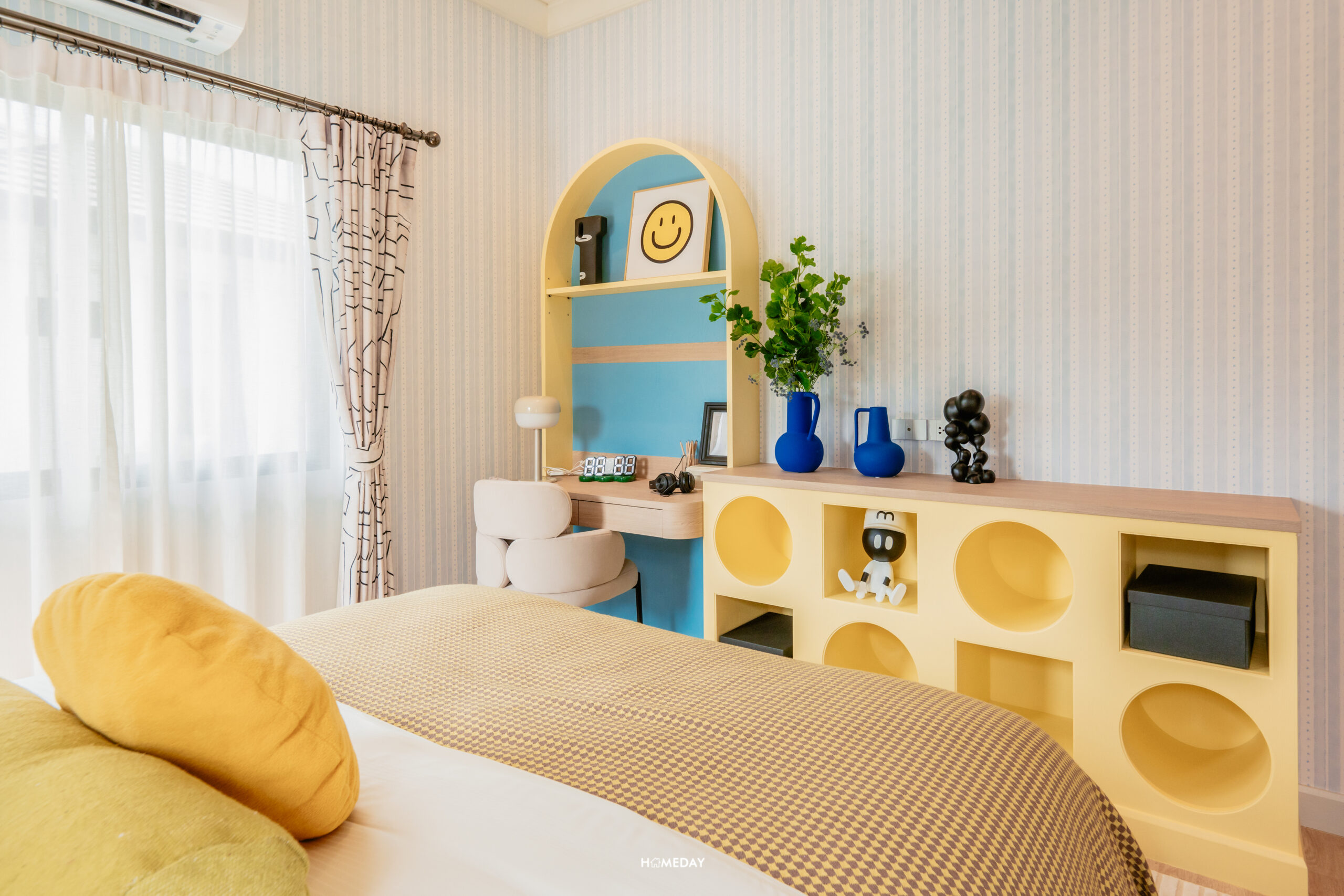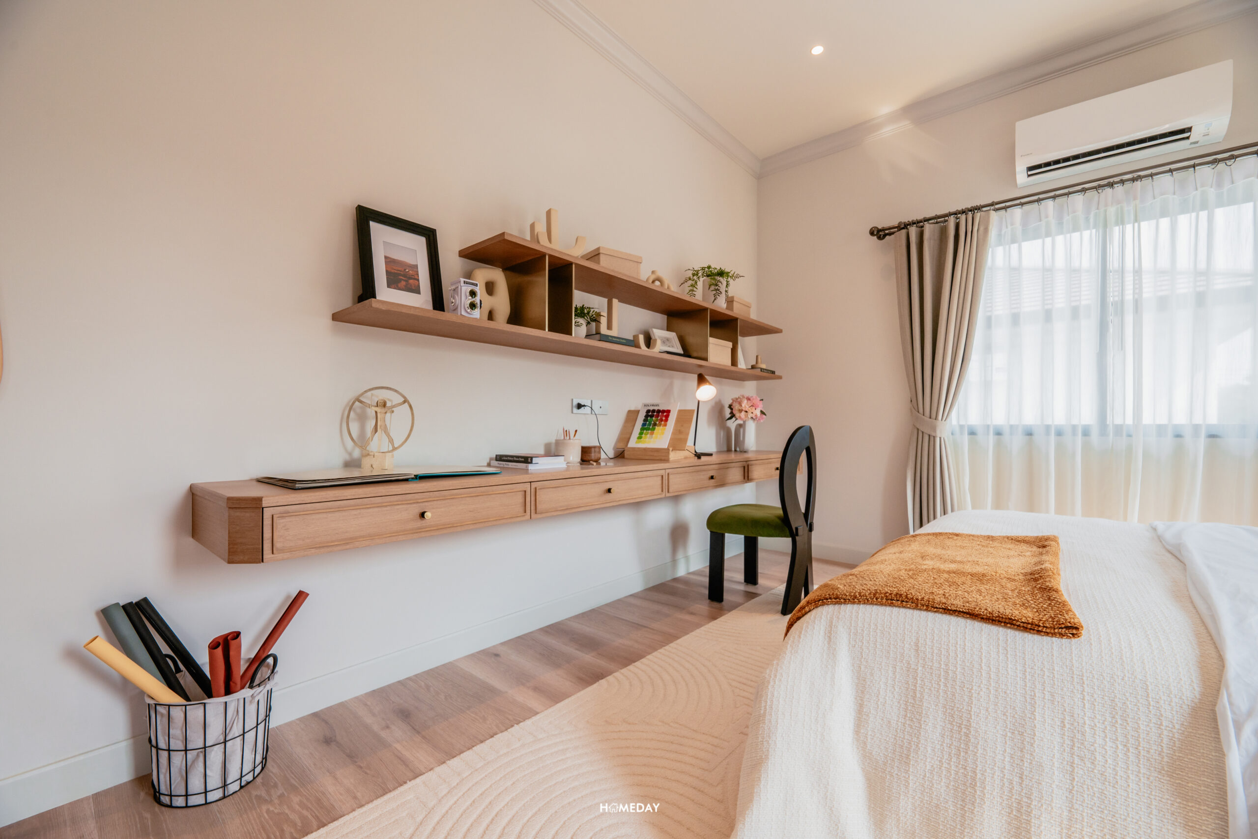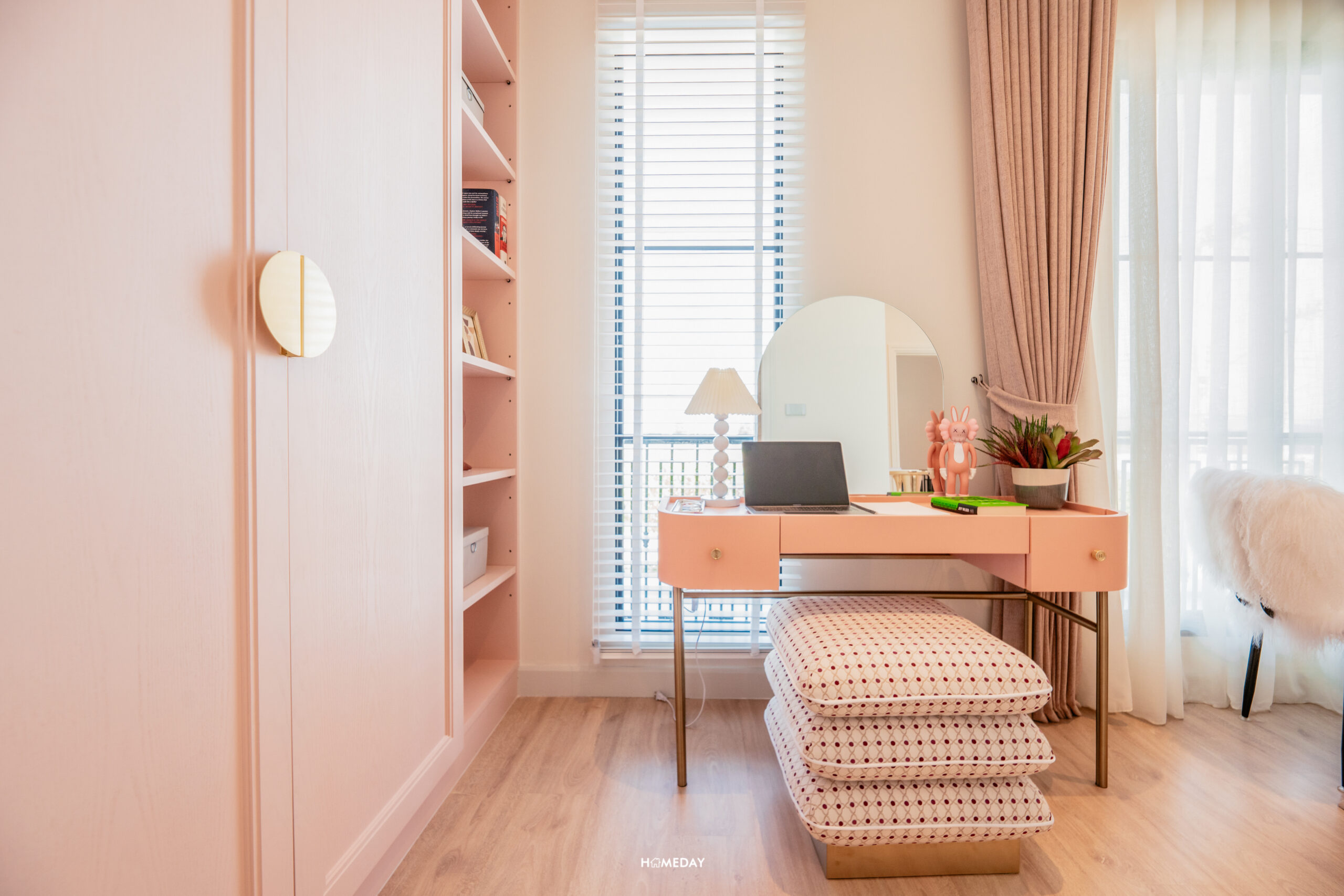 ปลายเตียงบิลต์อินเป็นโต๊ะตัวยาวเพื่อประหยัดพื้นที่ สามารถใช้งานเป็นโต๊ะทำงานและโต๊ะเครื่องแป้งในตัวได้เลย ถ้าอยากได้พื้นที่จัดเก็บวางของเพิ่มเติมก็ติดตั้งชั้นวางของเพิ่มได้เช่นกัน และแม้จะวางเตียงขนาดใหญ่ ปลายเตียงก็ยังเหลือพื้นที่ให้วางเก้าอี้นั่งทำงานอ่านหนังสือได้สบาย ๆ ครับ ยังเดินผ่านไป-มาได้สะดวกอยู่ ไม่อึดอัดคับแคบแต่อย่างใด