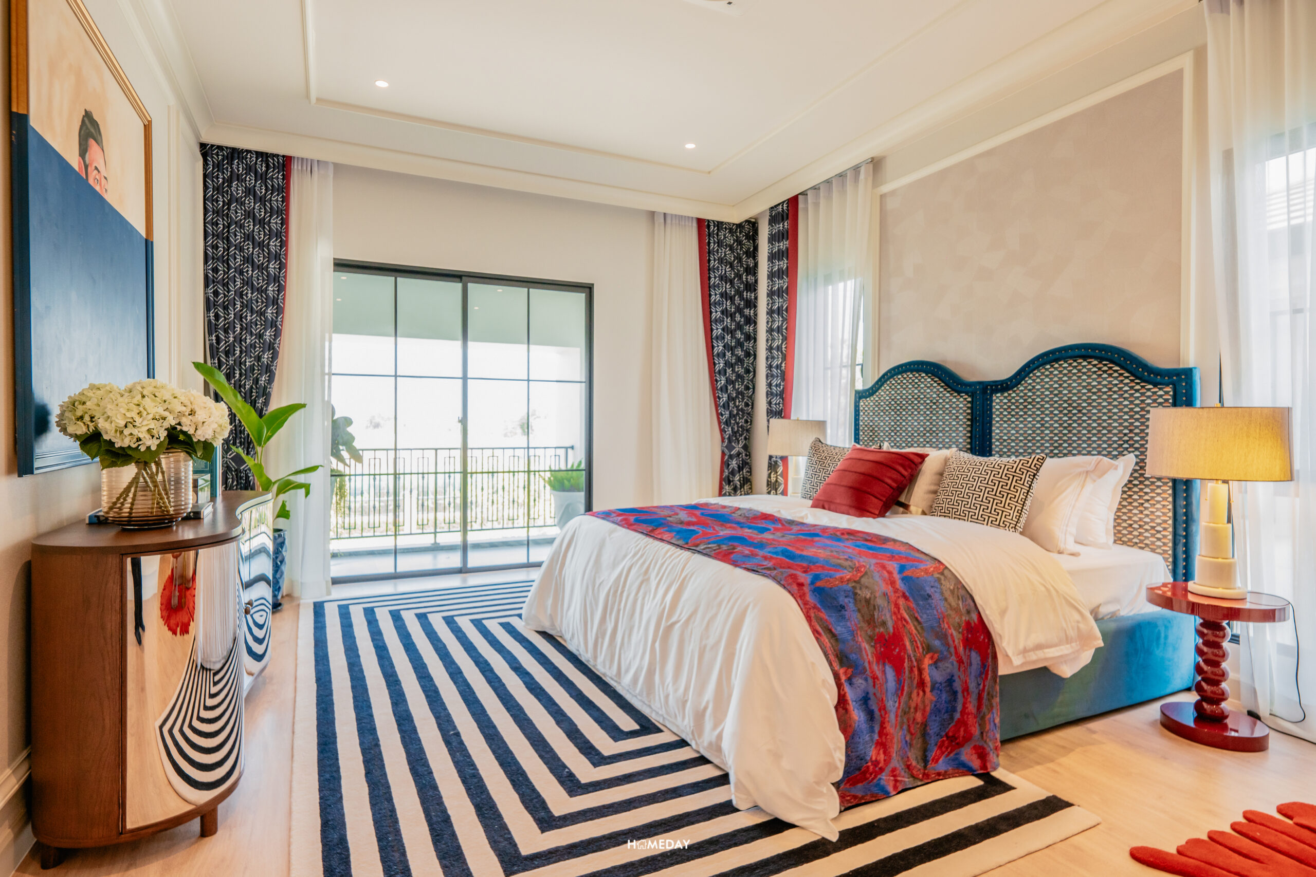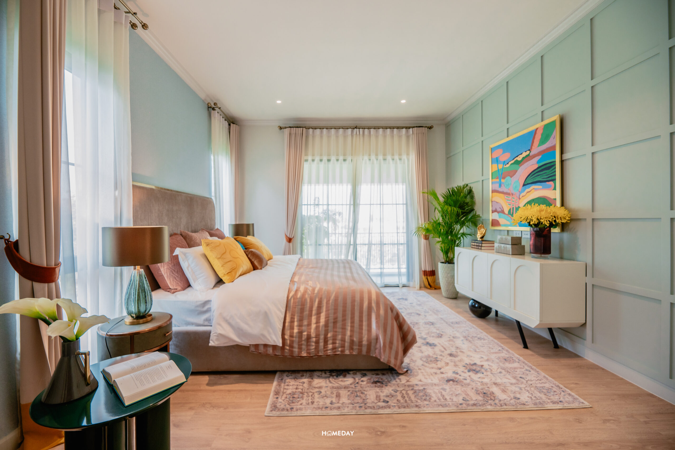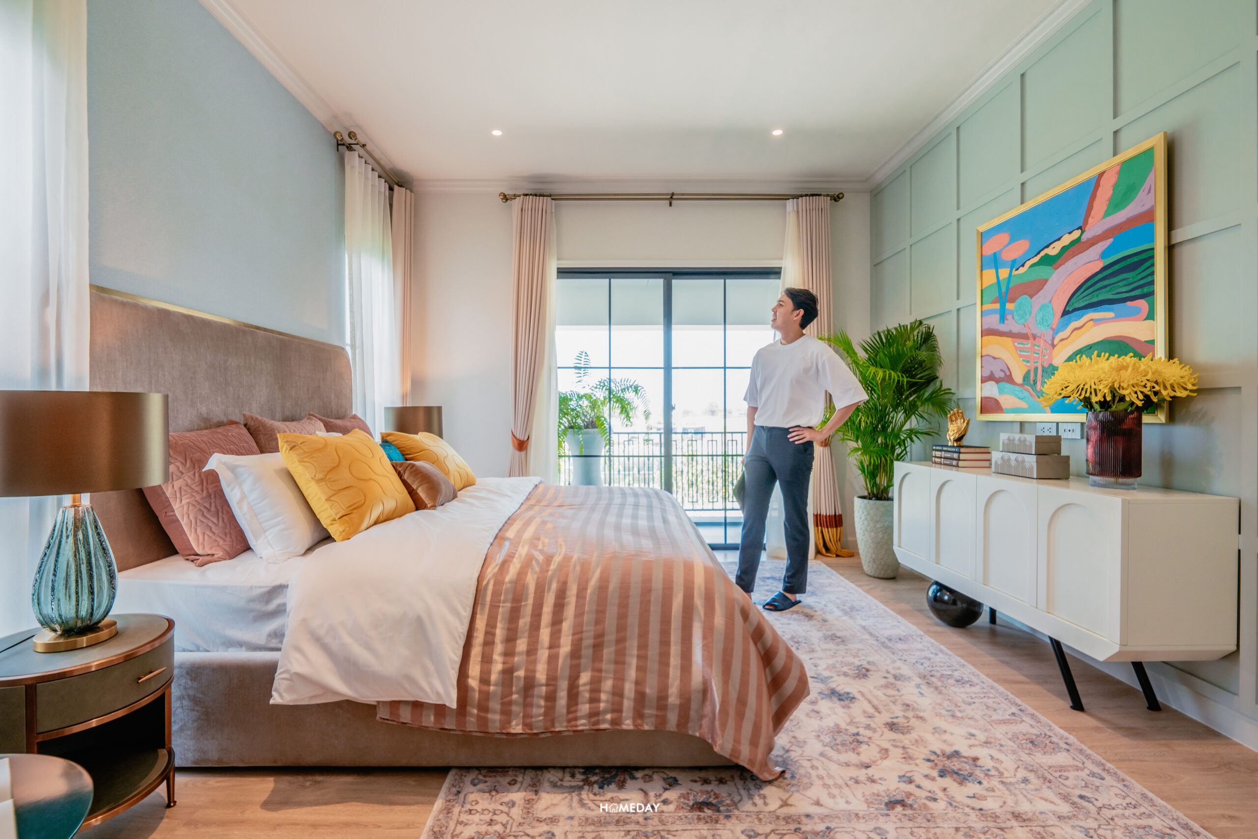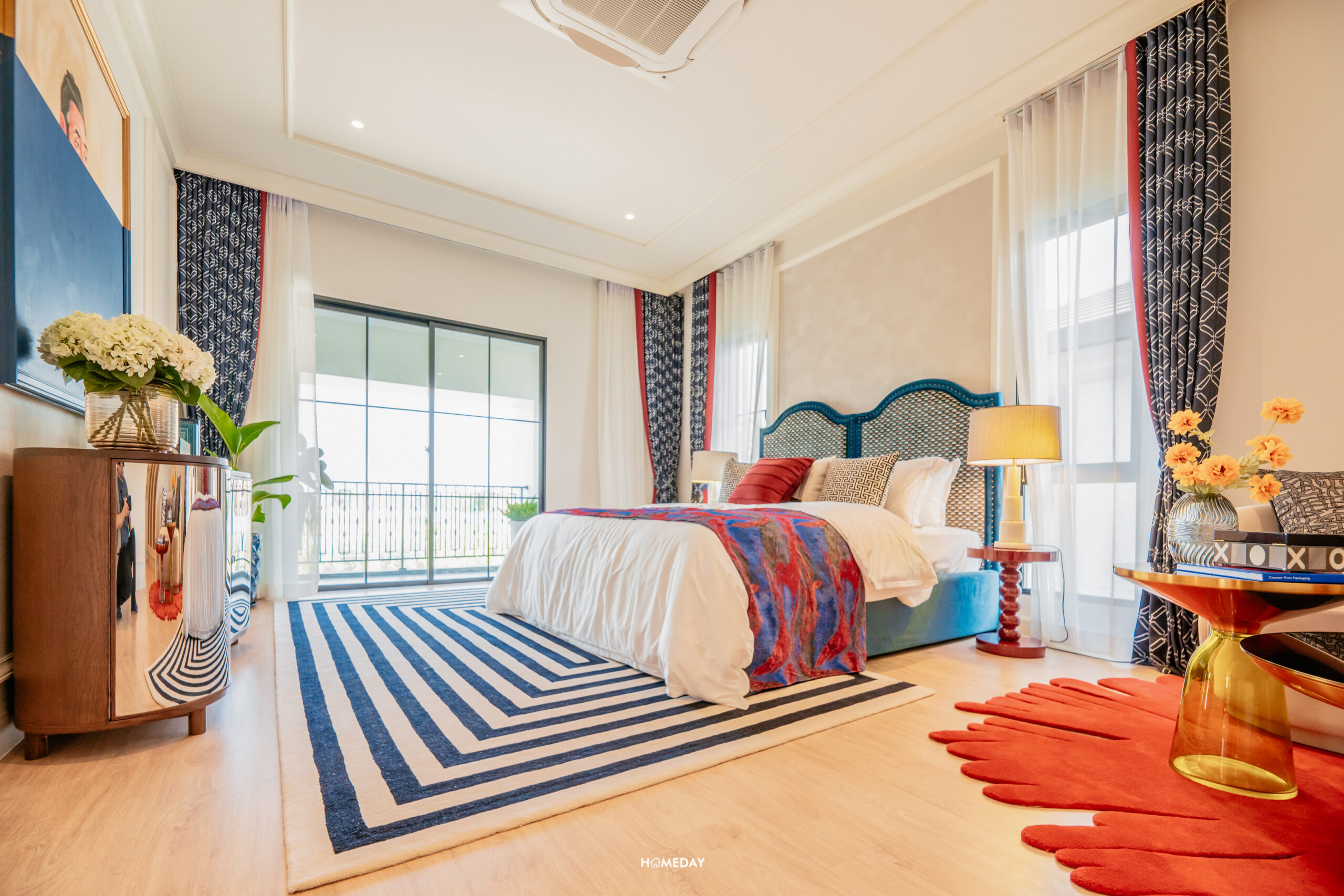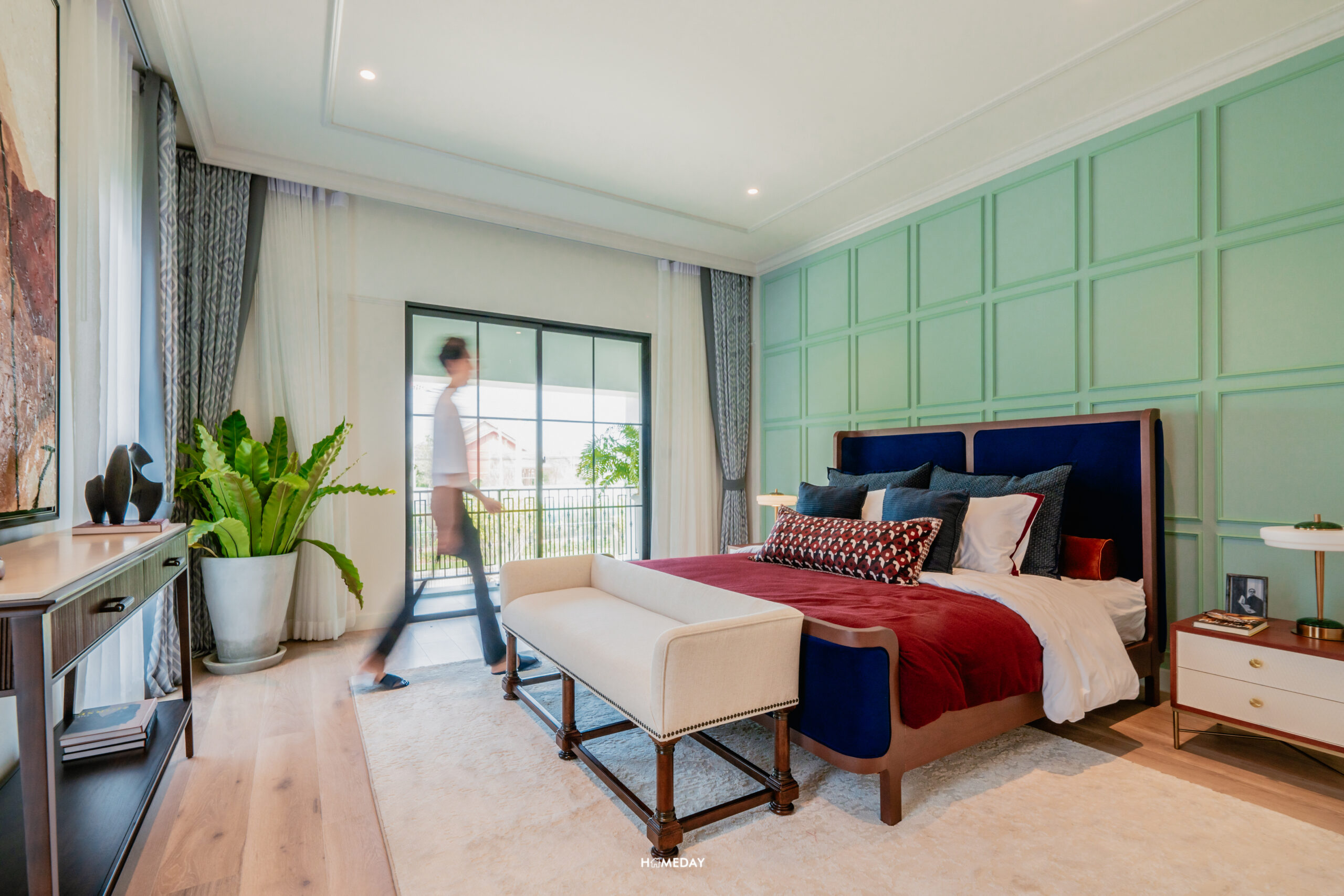 ปิดท้ายกันที่ Master Bedroom ห้องนี้จะได้แปลนแบบหน้ากว้าง กินพื้นที่ตั้งแต่ฝั่งหน้าบ้านไปจนถึงด้านหลัง มาพร้อมระเบียงส่วนตัวที่สามารถเปิดออกไปใช้งานได้จริง