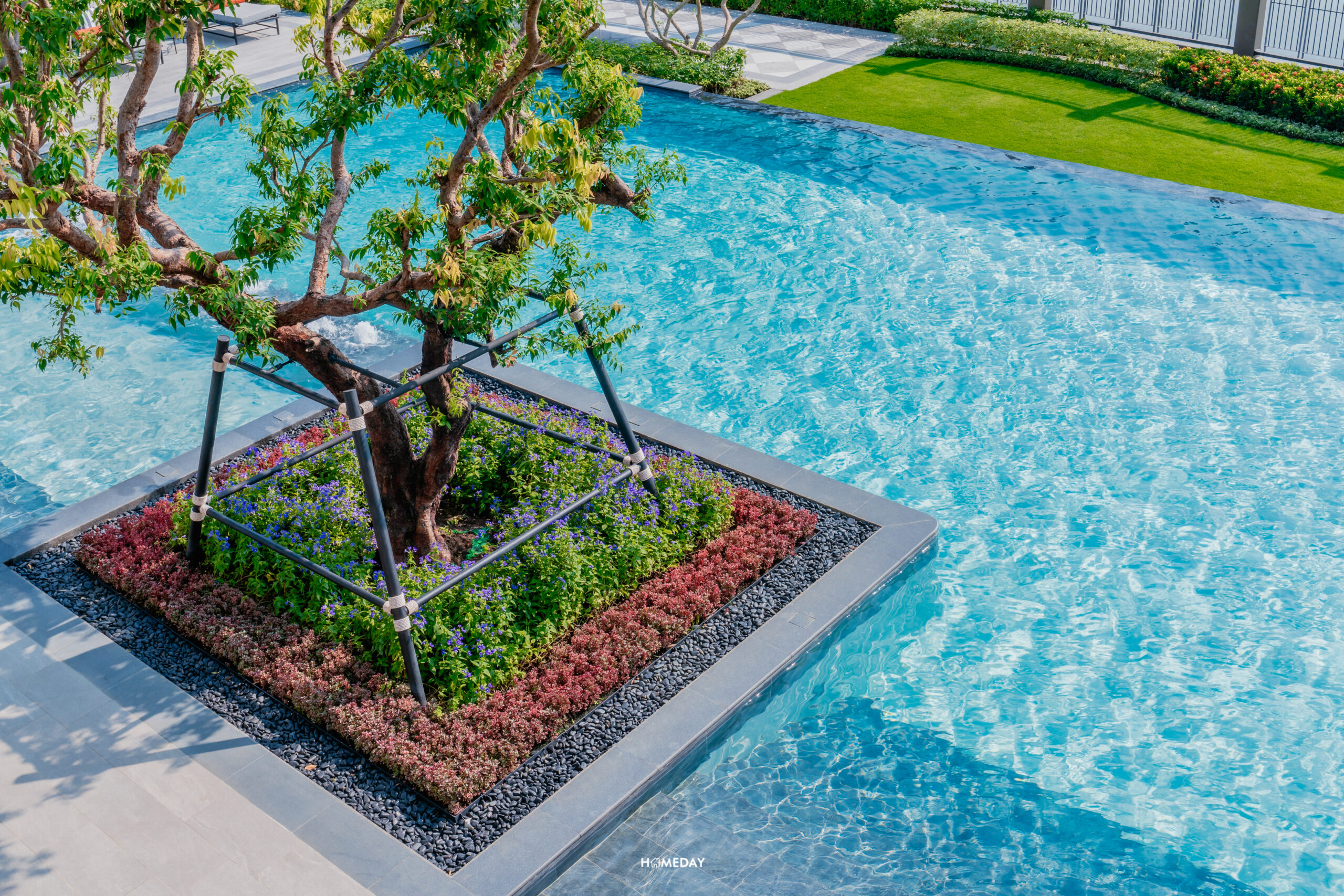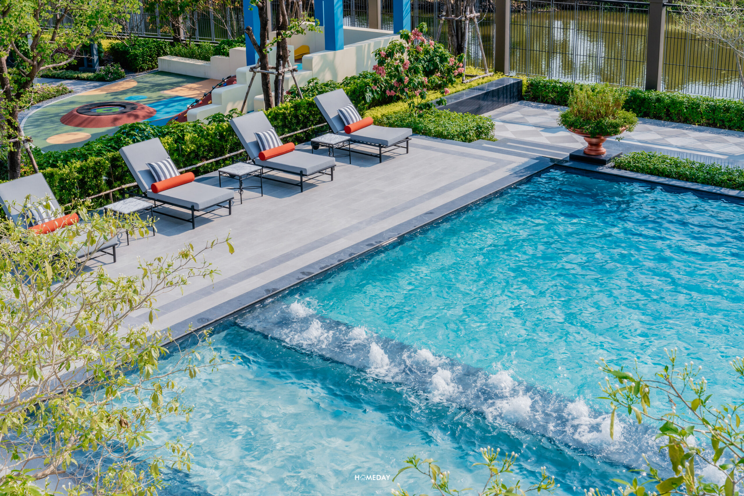 สระว่ายน้ำของทางโครงการจะอยู่ชั้นล่าง ติดกับรั้วของสนามกอล์ฟเลยครับ แถมยังสามารถรับวิวสวนของทางโครงการได้อีกด้วย ตัวสระเป็นระบบเกลือขนาด Half-Olympic ยาว 25 เมตร แยกสระเด็กและสระผู้ใหญ่เพื่อความปลอดภัย ริมสระมีพื้นที่นั่งเล่นพักผ่อนให้ ผู้ปกครองก็สามารถนั่งเฝ้าเด็ก ๆ ได้อย่างใกล้ชิดเลยครับ