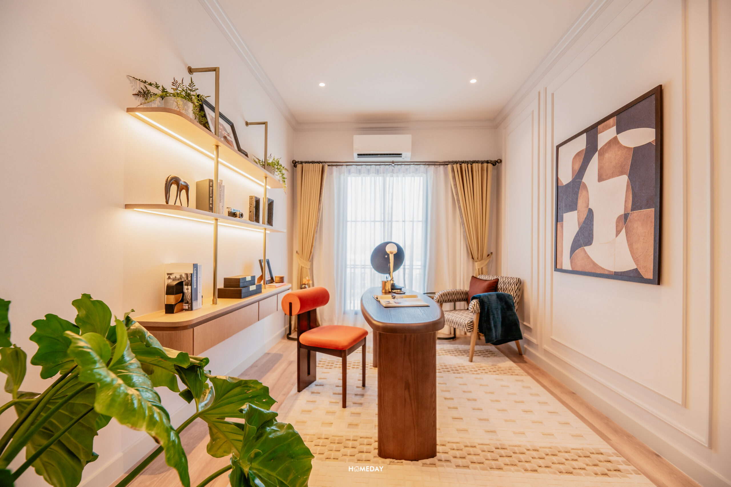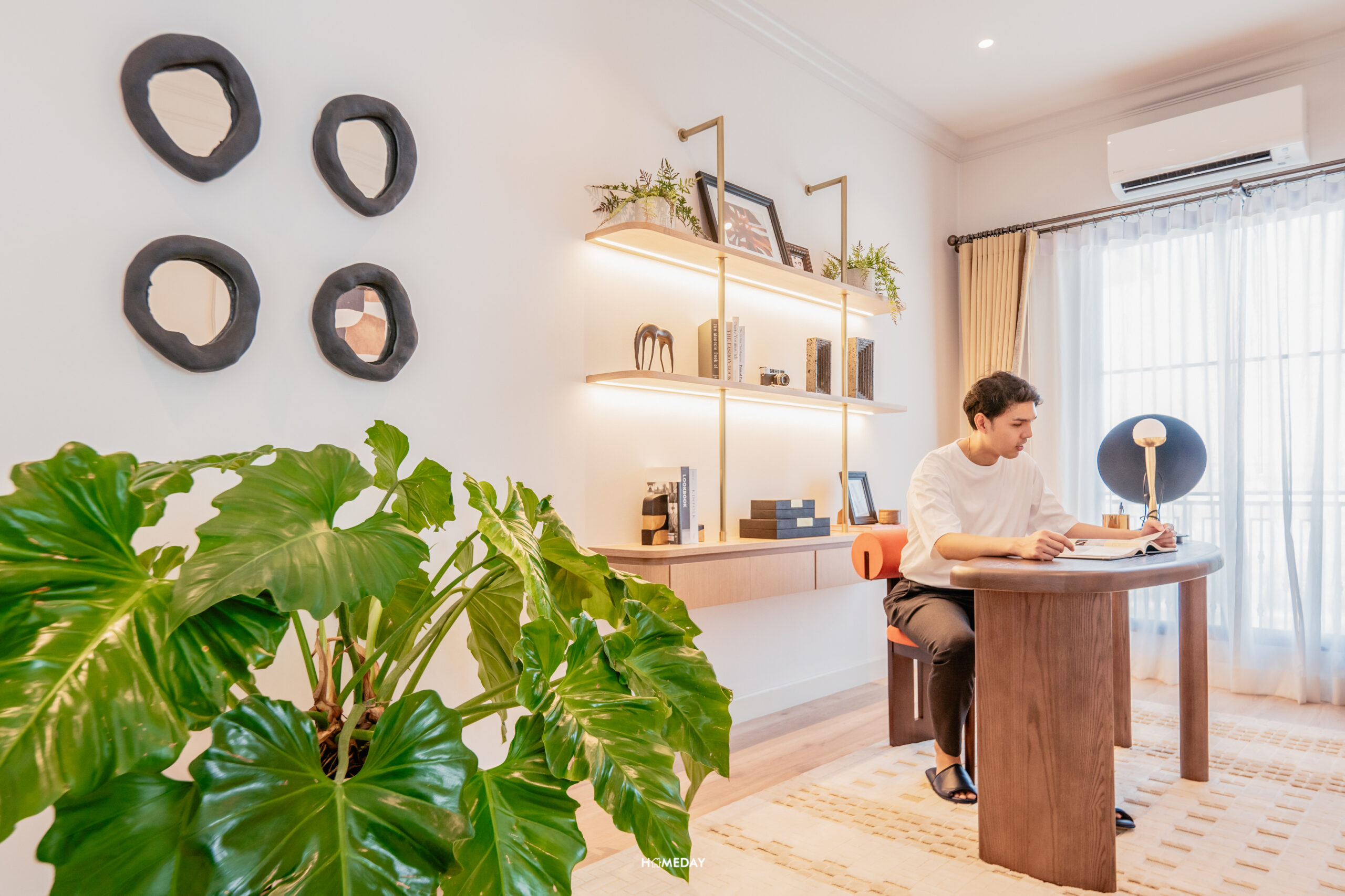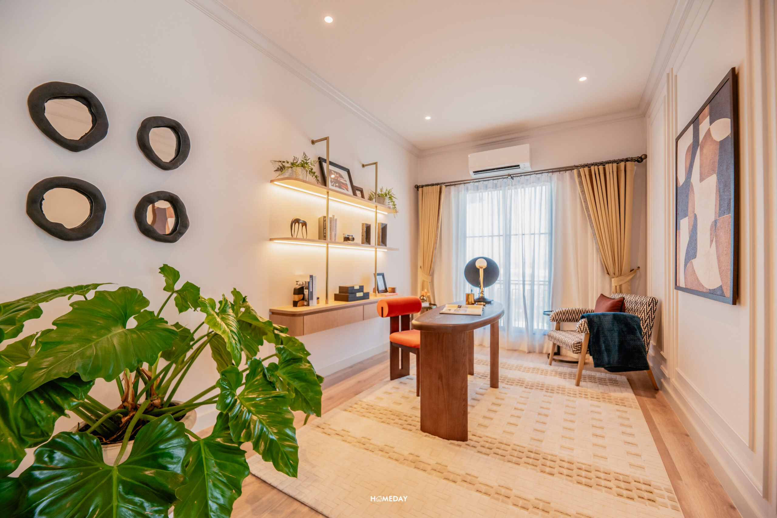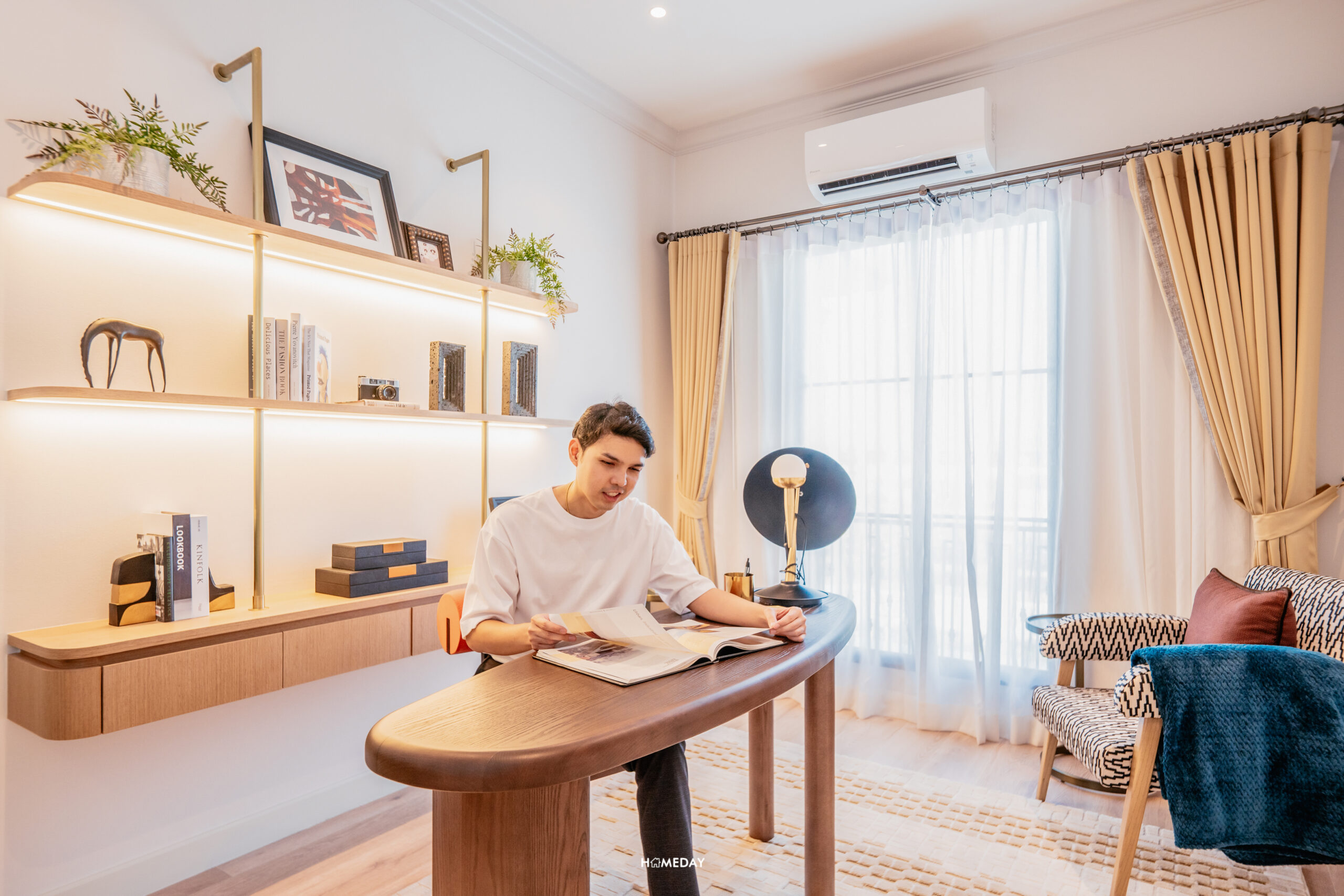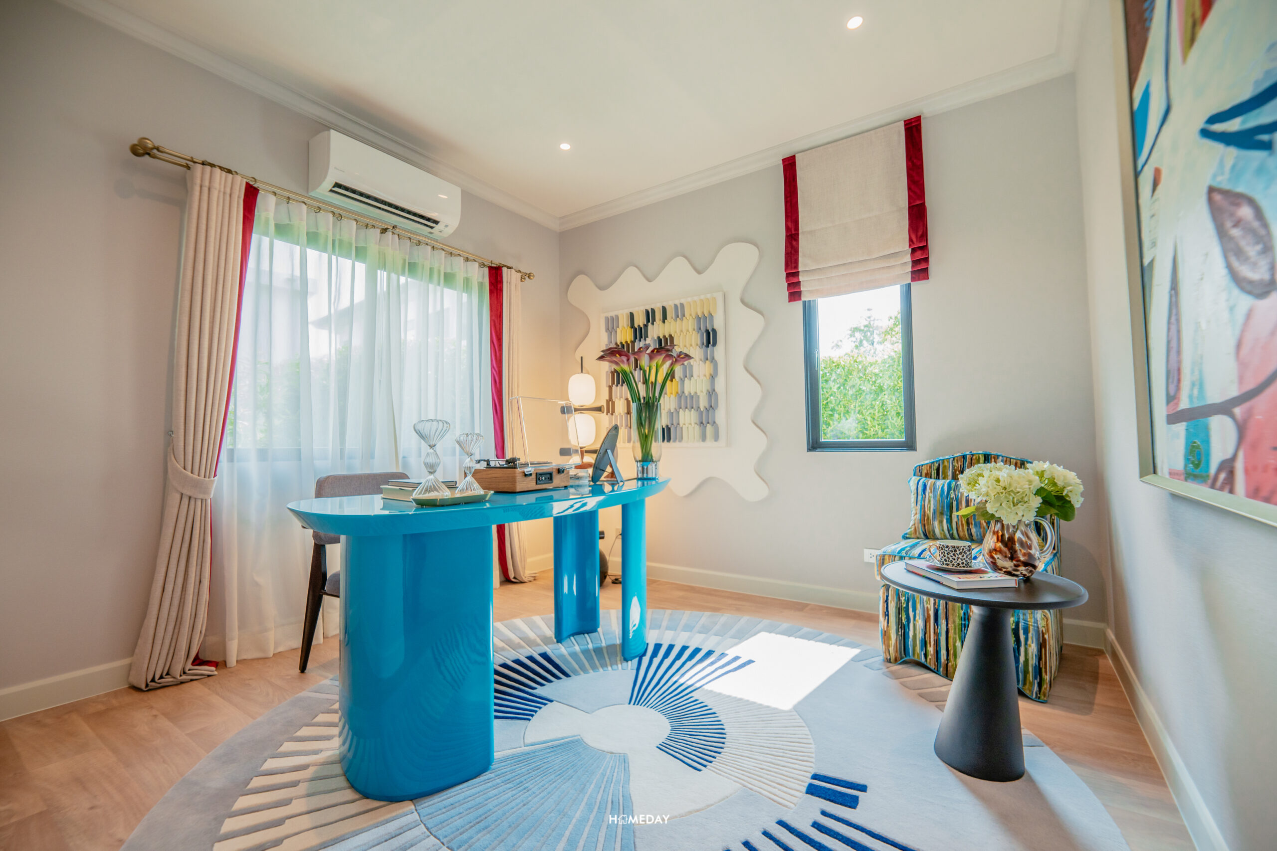 พื้นที่ Family Area ส่วนนี้ บ้านตัวอย่างออกแบบให้ดูเป็นห้องทำงานนะครับ บ้านจริงมุมนี้เราสามารถเพิ่มชุดโซฟาและชั้นวางทีวี ทำเป็นห้องนั่งเล่นส่วนตัวของครอบครัวได้เลย หรือถ้าอยากได้ห้องทำงานที่มีความเป็นส่วนตัวเพิ่มขึ้นก็สามารถกั้น Partition ให้กับพื้นที่ได้เช่นกันครับ