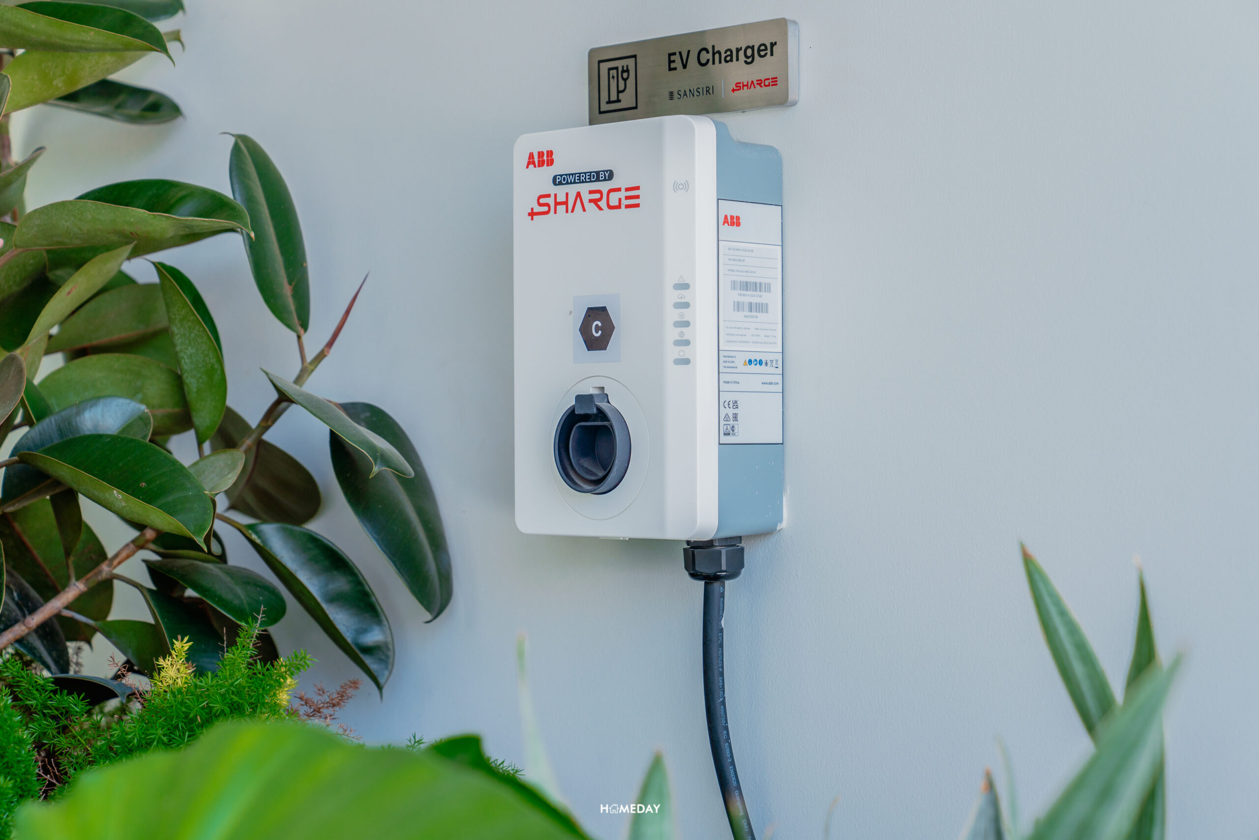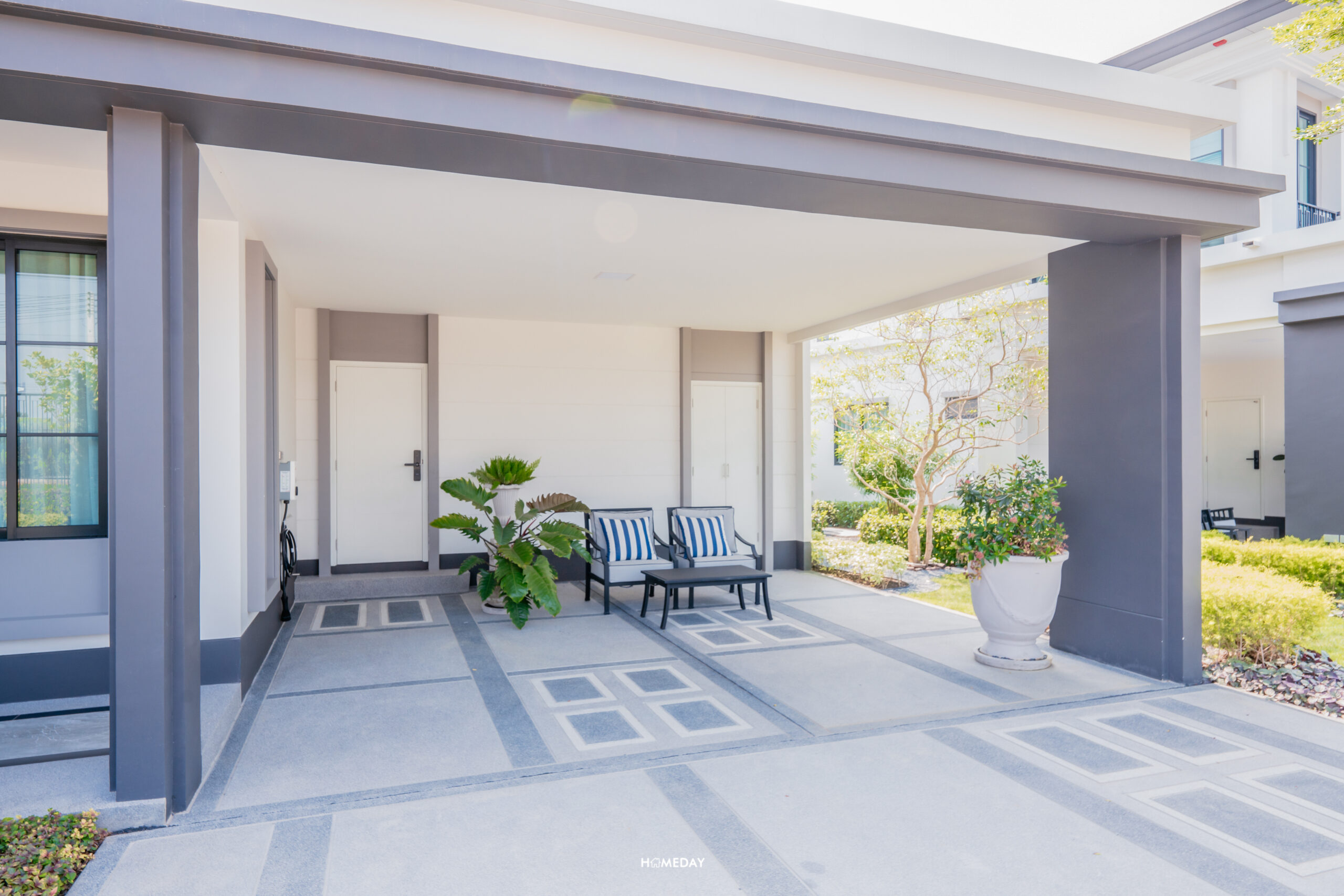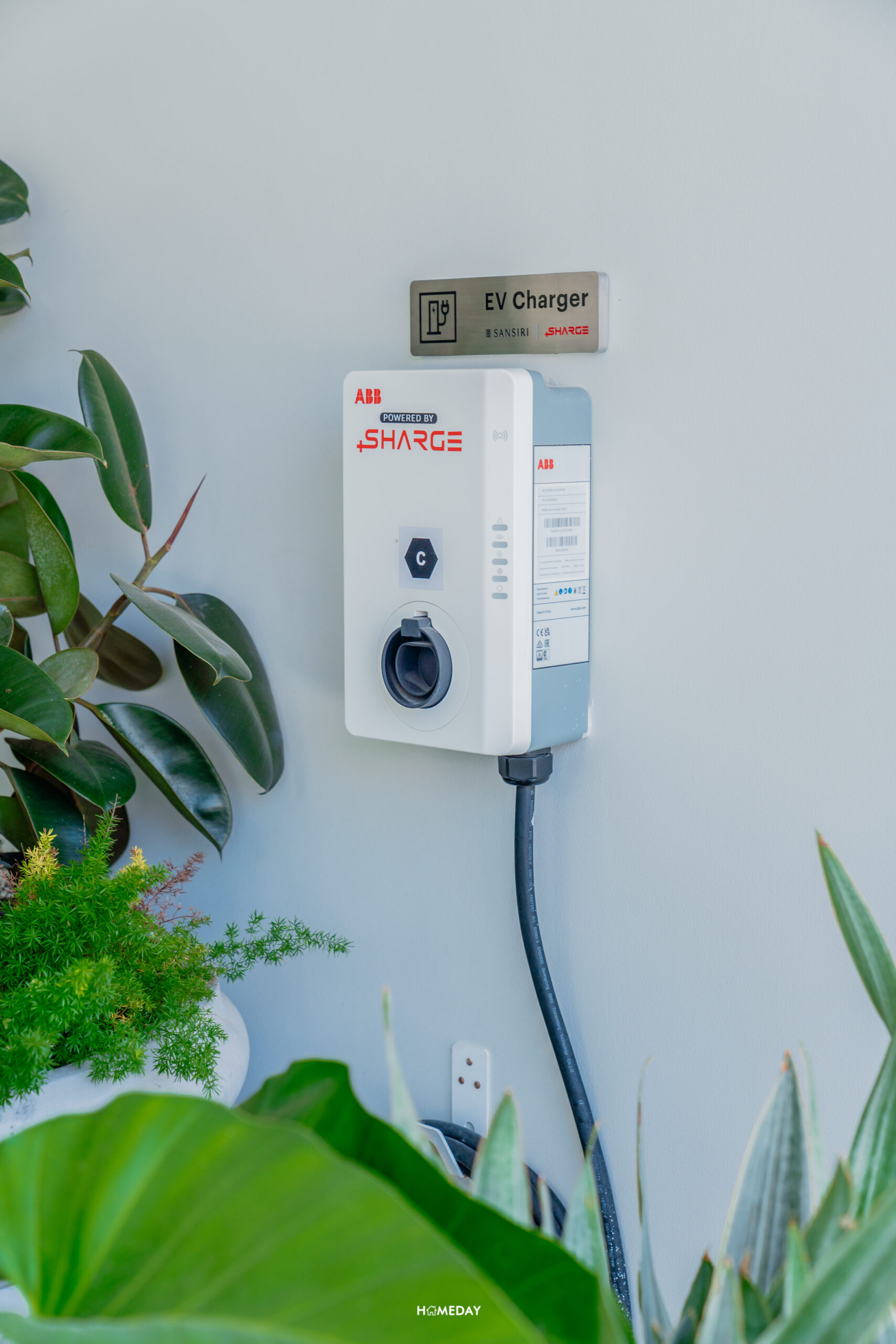 นอกจากนี้โรงจอดรถของทุกแบบบ้านยังมาพร้อมกับ EV Charger ที่ติดตั้งมาให้แบบพร้อมใช้งาน หลังนี้ได้พื้นที่จอดรถในร่ม 2 คัน มีพื้นที่เก็บของมาให้ ใช้เก็บพวกอุปกรณ์ดูแลรถและสวน หรืออุปกรณ์งานช่างอื่น ๆ ได้สะดวก เป็นระเบียบเรียบร้อย ประตูทางเข้าเชื่อมโรงรถจะได้กลอนประตูแบบ Digital Door Lock ด้วยครับ สำหรับประตูทางเข้าหลัก เดินเชื่อมจากโรงรถได้แบบไม่ต้องกลัวร้อนหรือโดนฝน มีทางเดินในร่มให้อย่างดีเลยครับ หน้าบ้านบริเวณประตูทางเข้าหลักมีเฉลียงขนาดใหญ่รองรับ ใช้วางต้นไม้ประดับหรือจะบิลต์อินตู้เก็บรองเท้าก็ลงตัวครับ