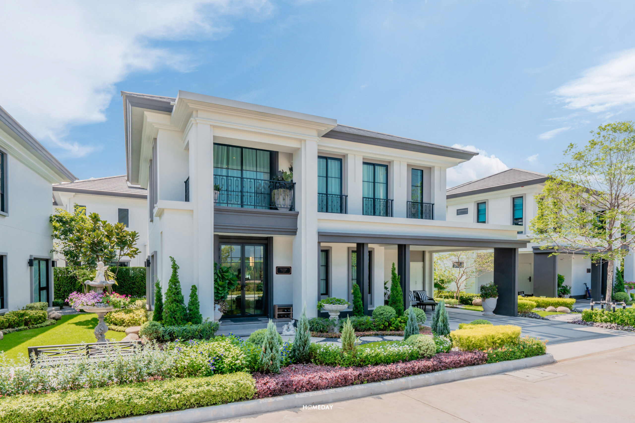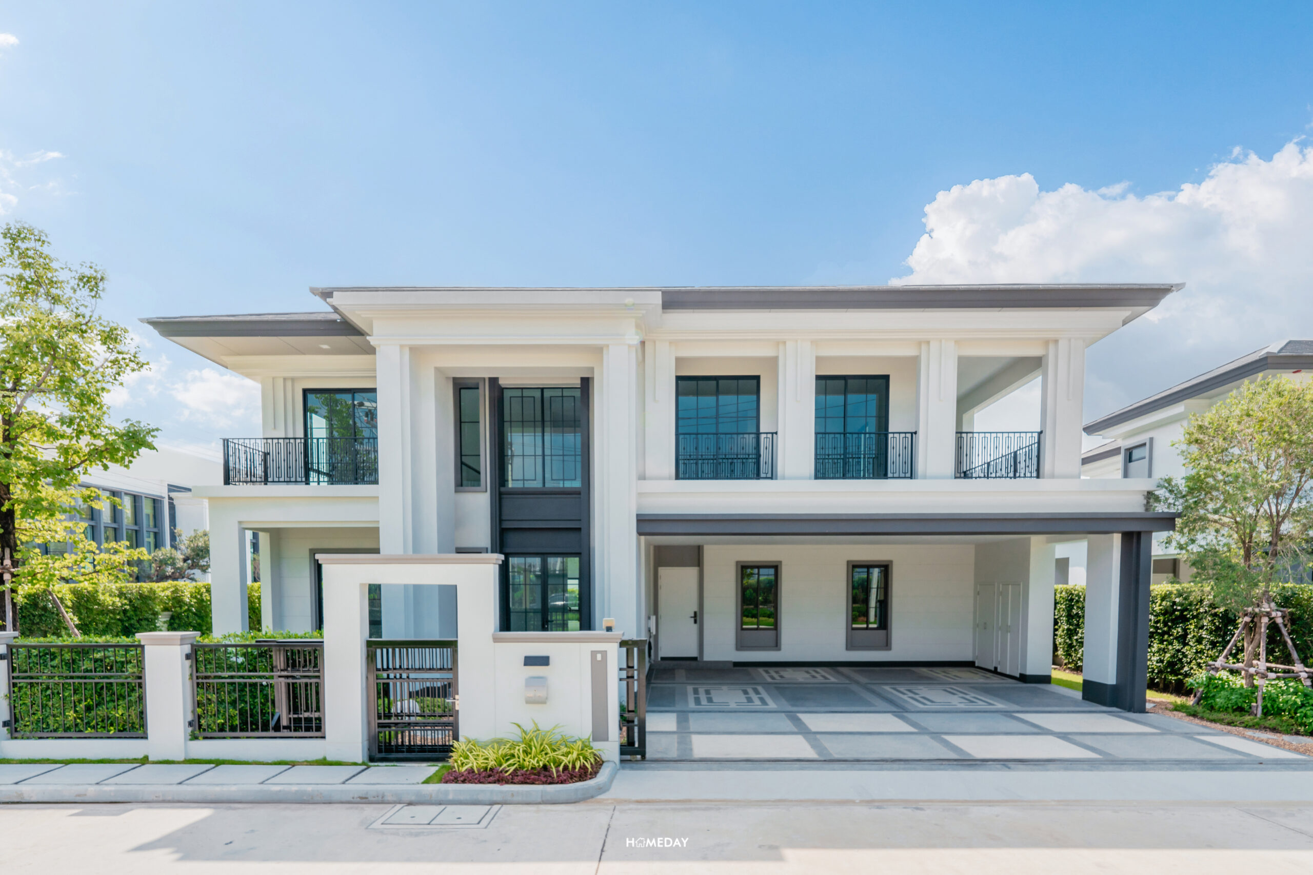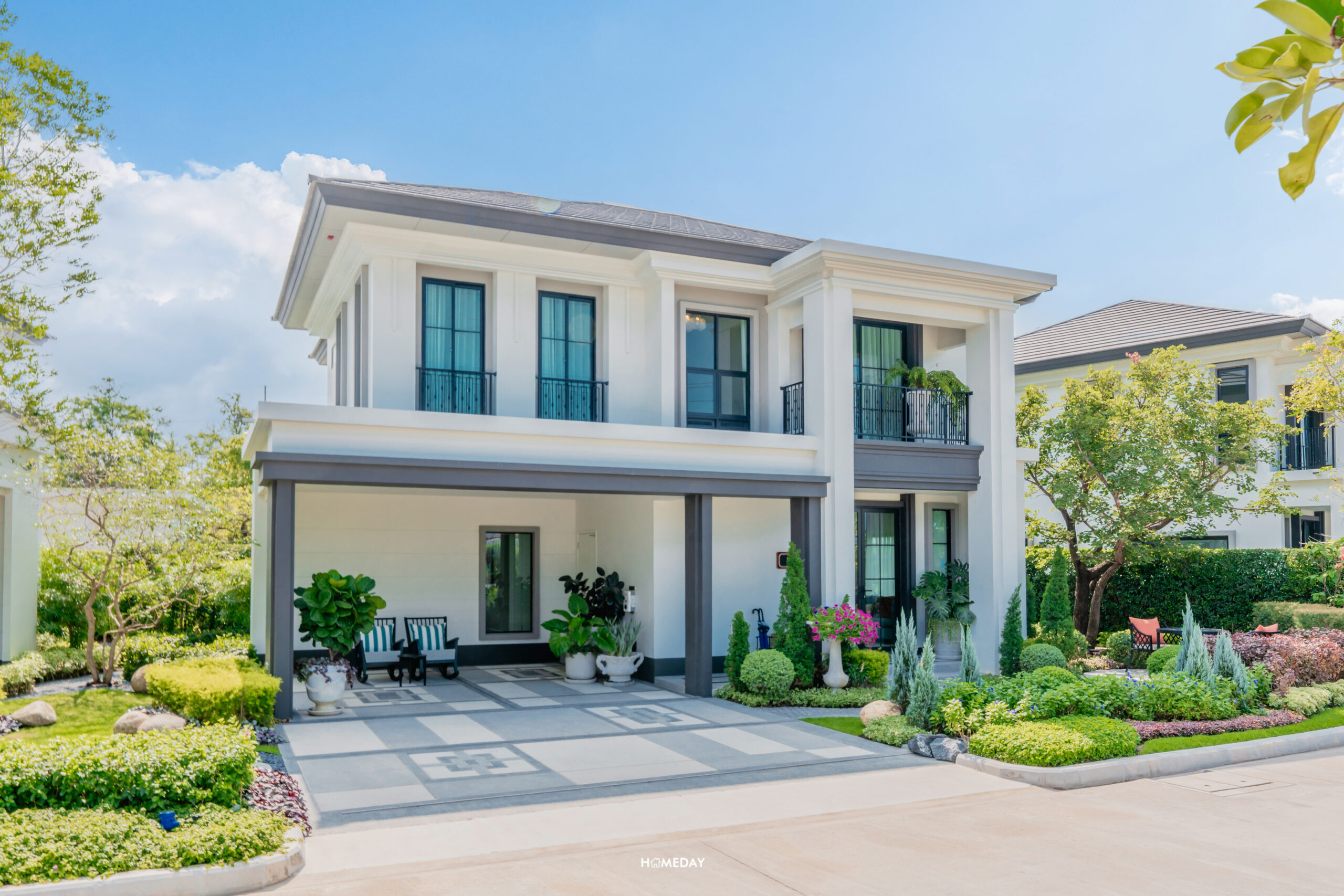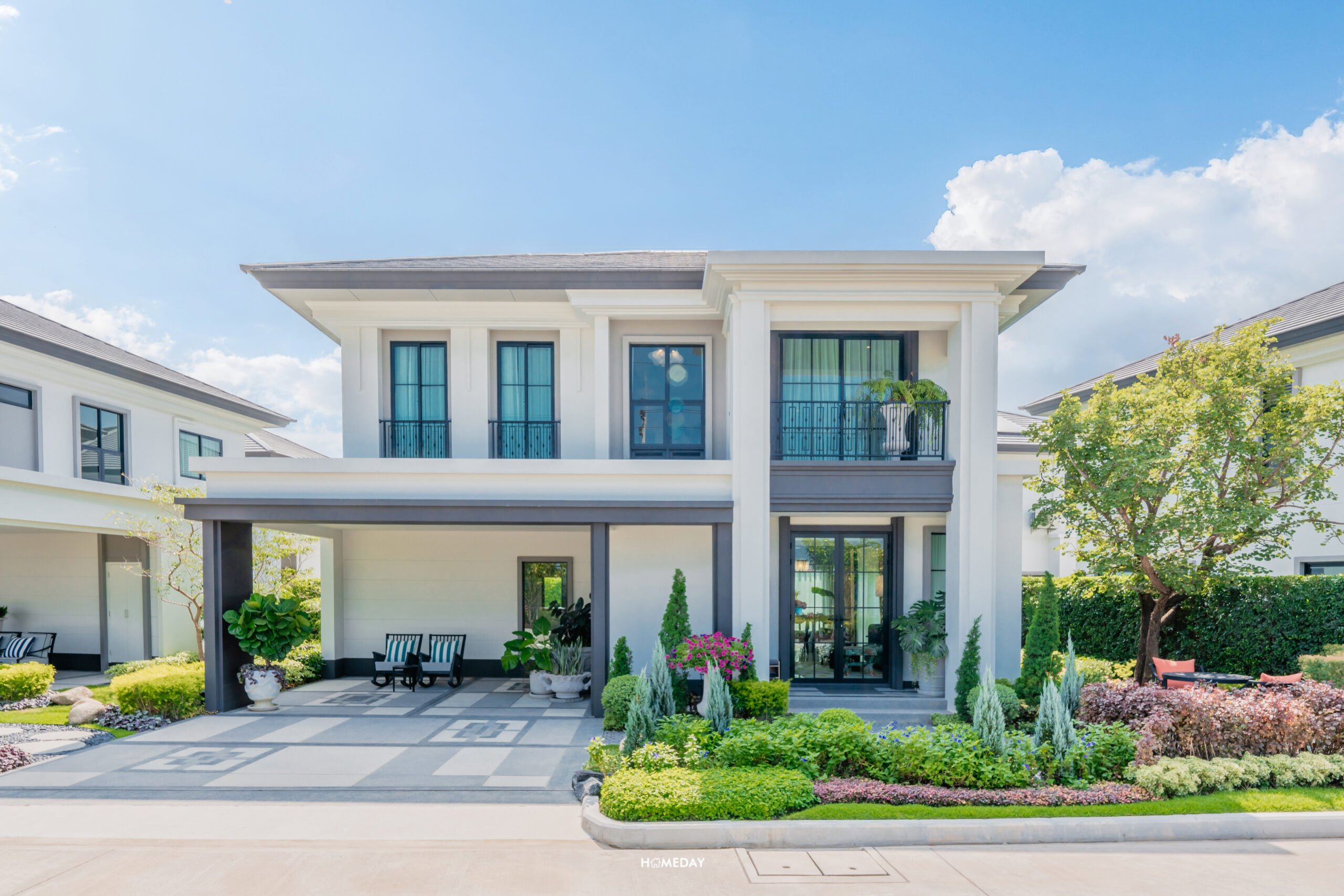 ก่อนจะเข้าไปสำรวจกันยังภายในตัวบ้าน มาดูในส่วนของ Facade และพื้นที่รอบ ๆ บ้านกันก่อนครับ แน่นอนว่าสไตล์การตกแต่งของตัวบ้าน มาในดีไซน์แบบ Modern Classic ที่มีความสวยงาม Timeless Design เหนือกาลเวลา โทนสีของตัวบ้านทุกหลังจะมาในโทนขาวและเทา ประดับตกแต่งระเบียงด้วยเหล็กดัดสีดำที่มีความเข้ากัน และติดตั้ง Solar Panel ให้ด้วยครับ
