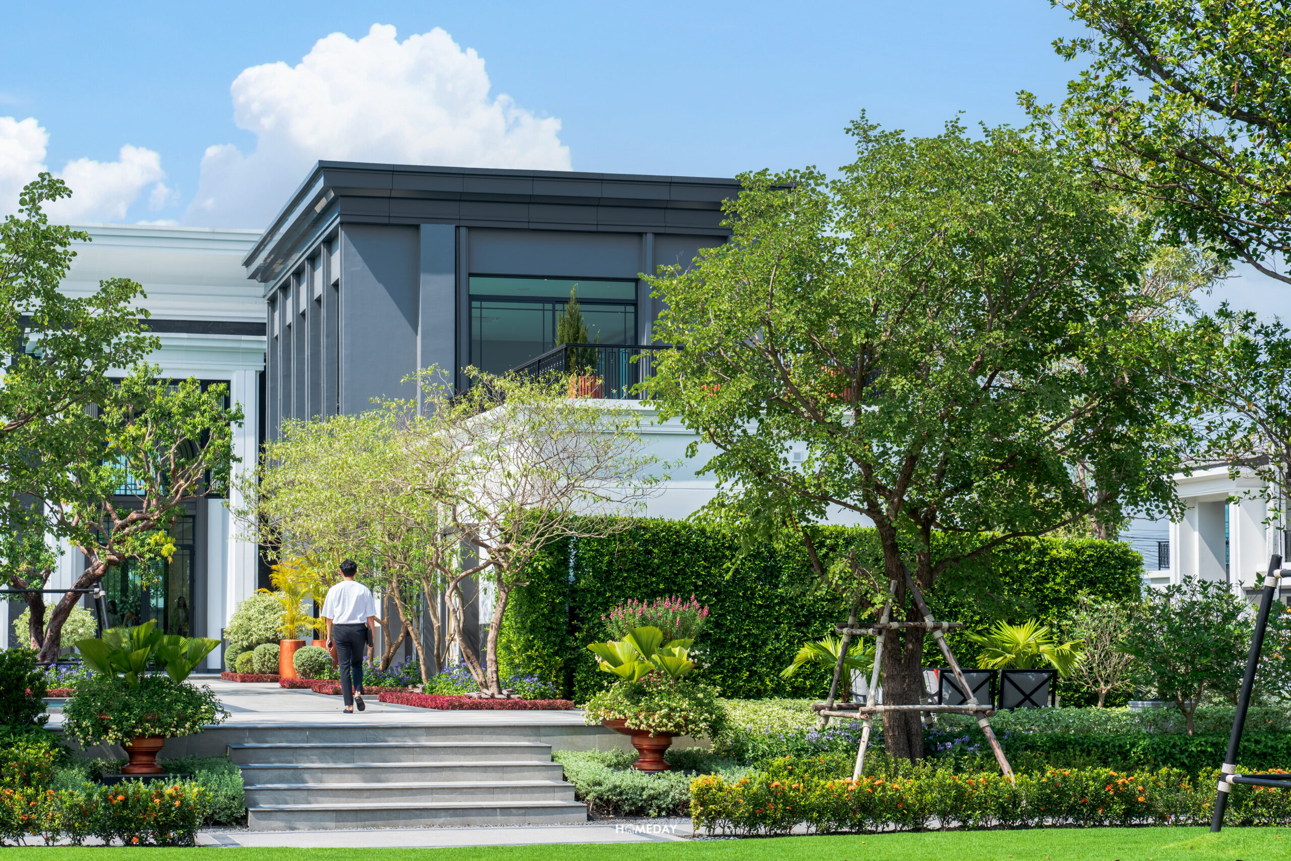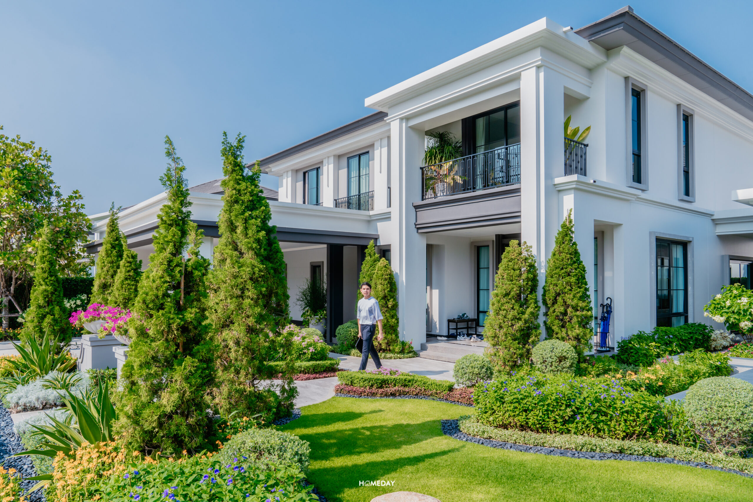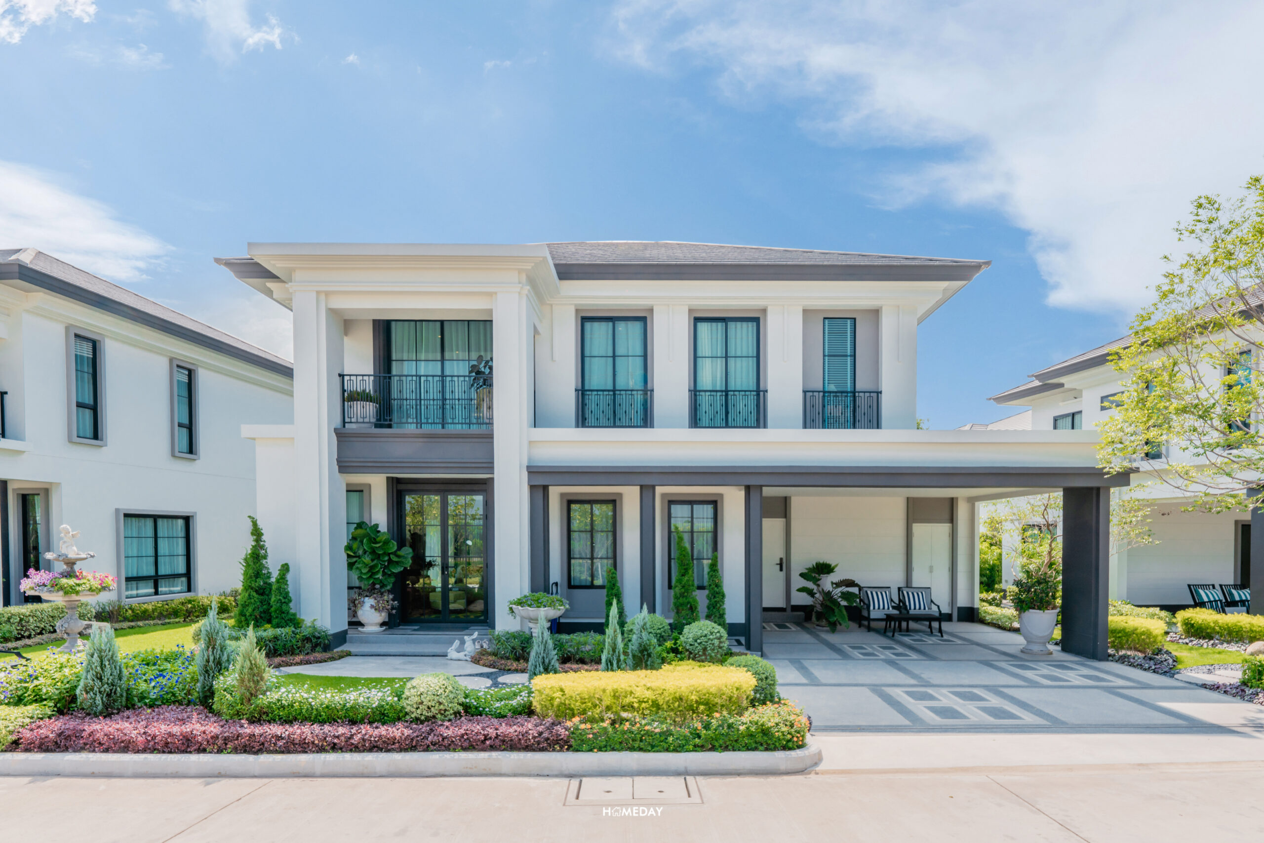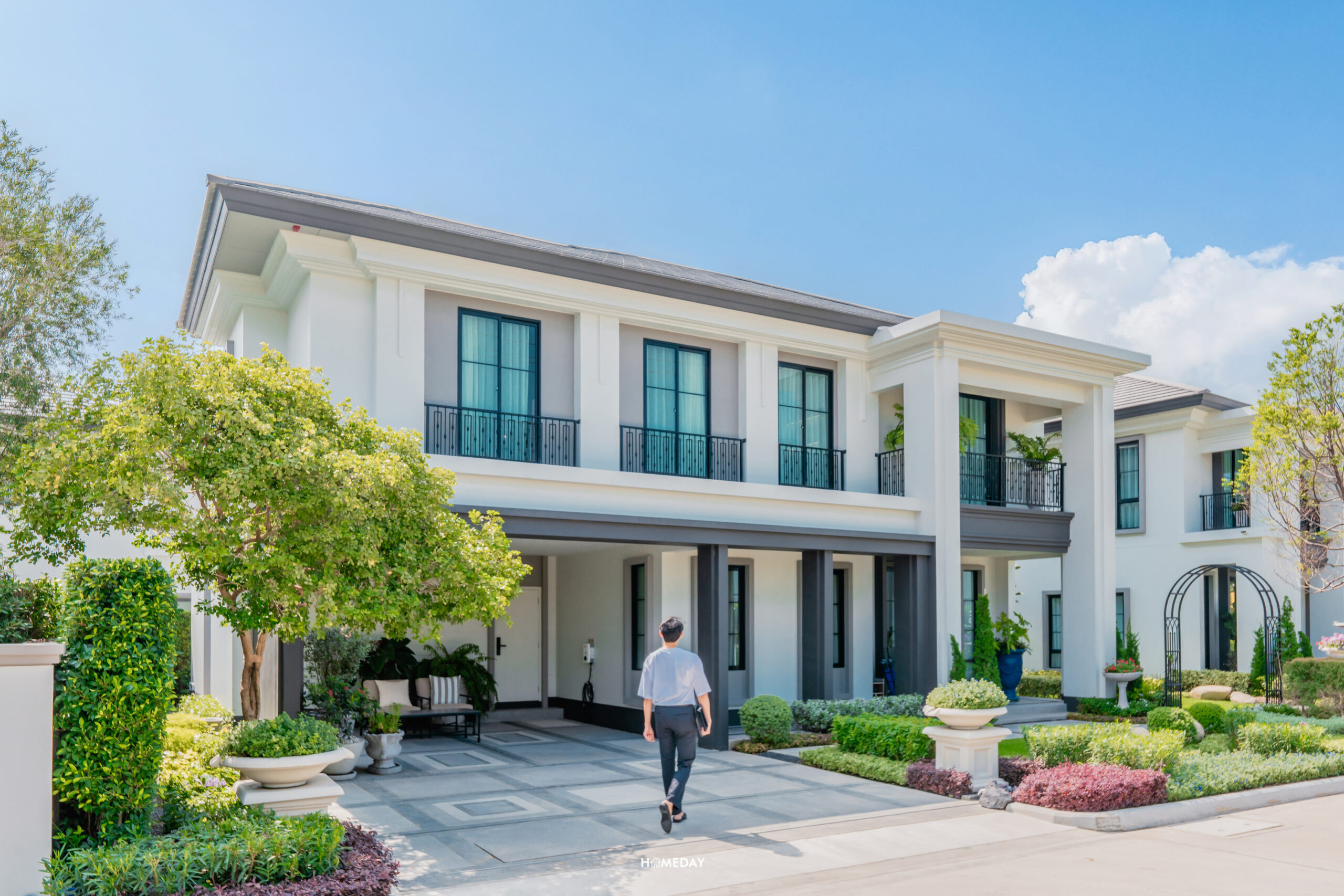 ก่อนจะเข้าไปสำรวจกันยังภายในตัวบ้าน มาดูในส่วนของ Facade และพื้นที่รอบ ๆ บ้านกันก่อนครับ แน่นอนว่าสไตล์การตกแต่งของตัวบ้าน มาในดีไซน์แบบ Modern Classic ที่มีความสวยงาม Timeless Design เหนือกาลเวลา โทนสีของตัวบ้านทุกหลังจะมาในโทนขาวและเทา ประดับตกแต่งระเบียงด้วยเหล็กดัดสีดำที่มีความเข้ากัน และติดตั้ง Solar Panel ให้ด้วยครับ