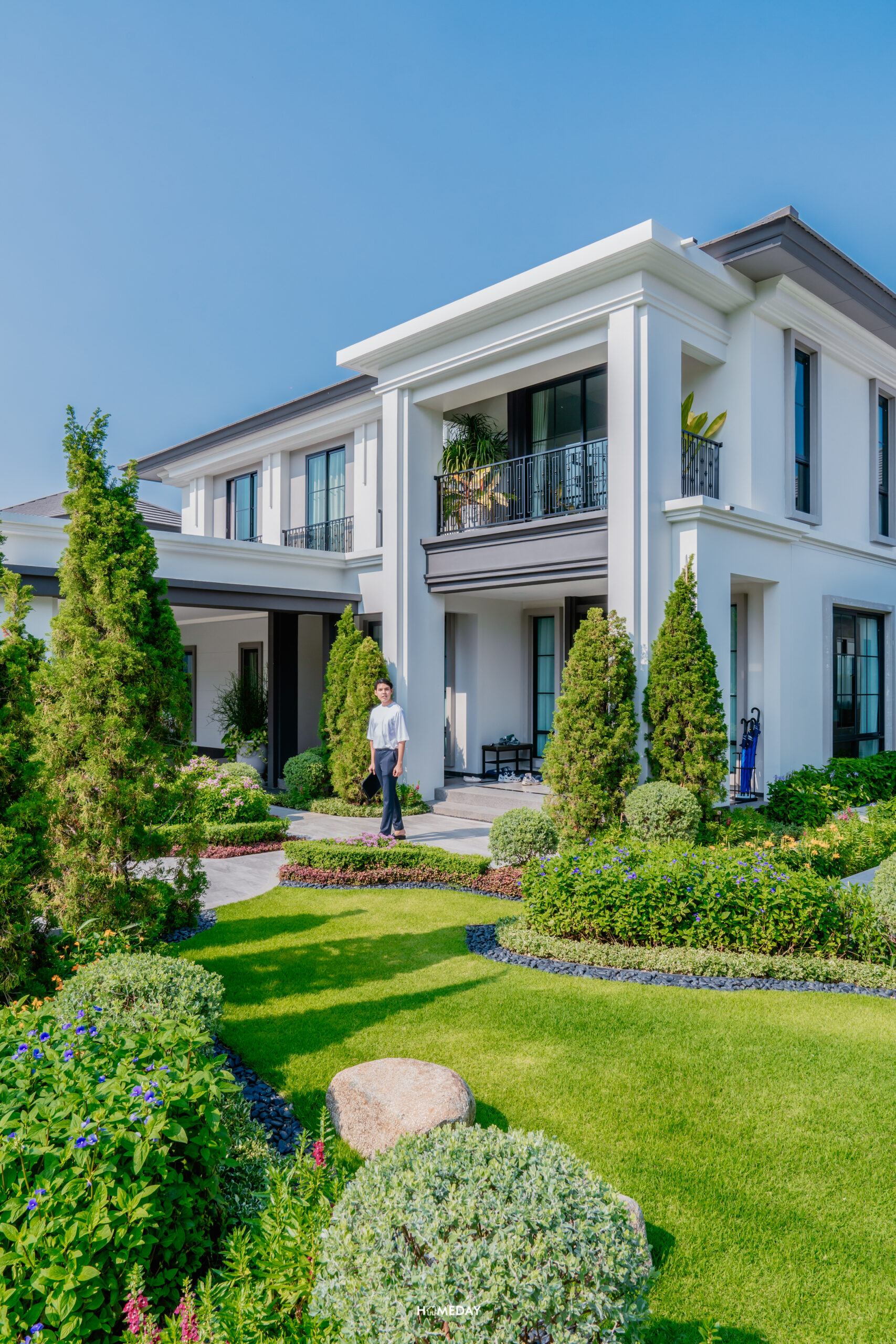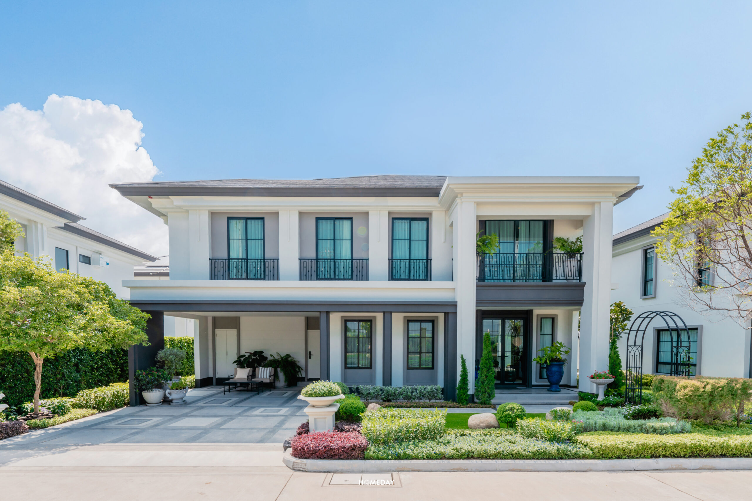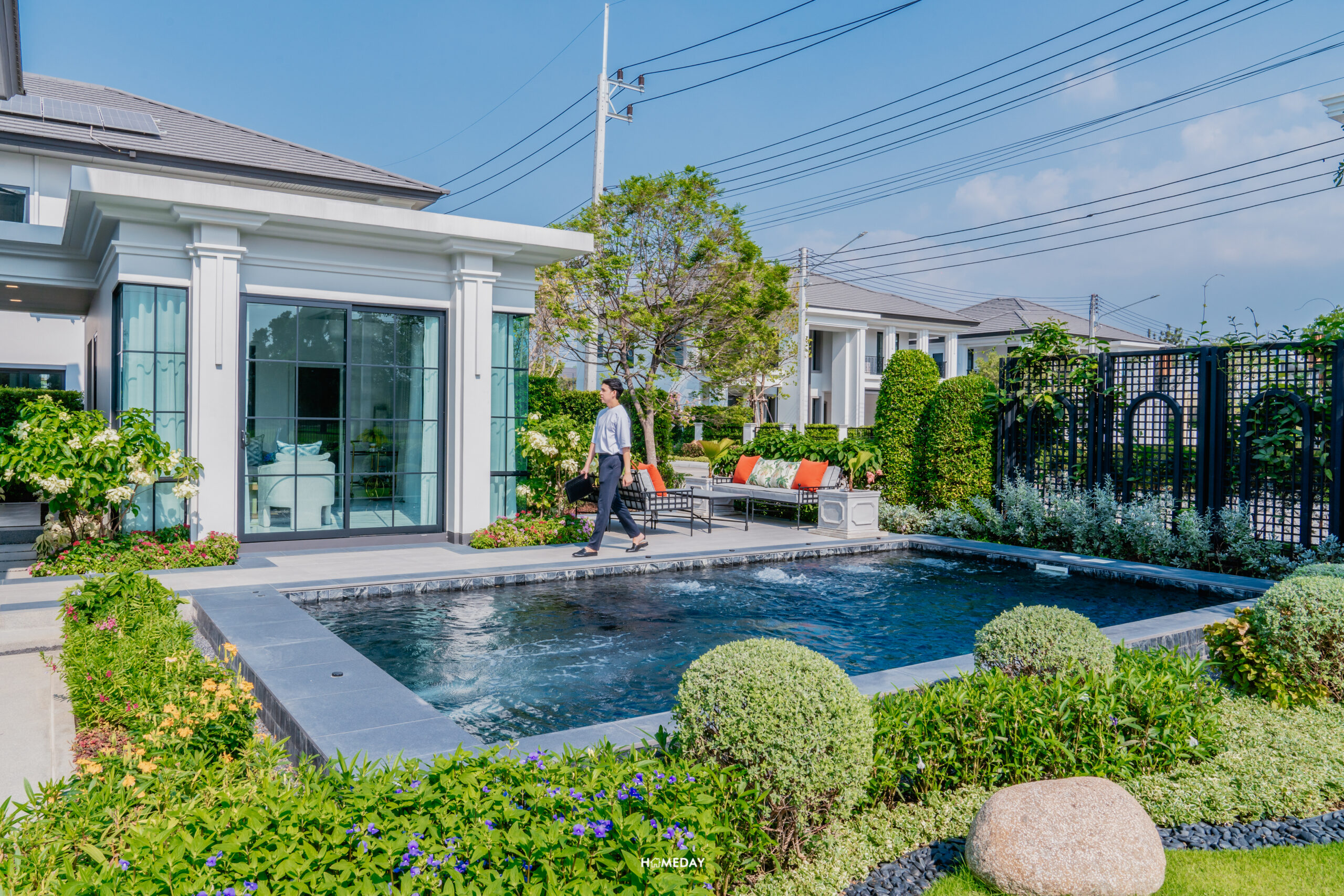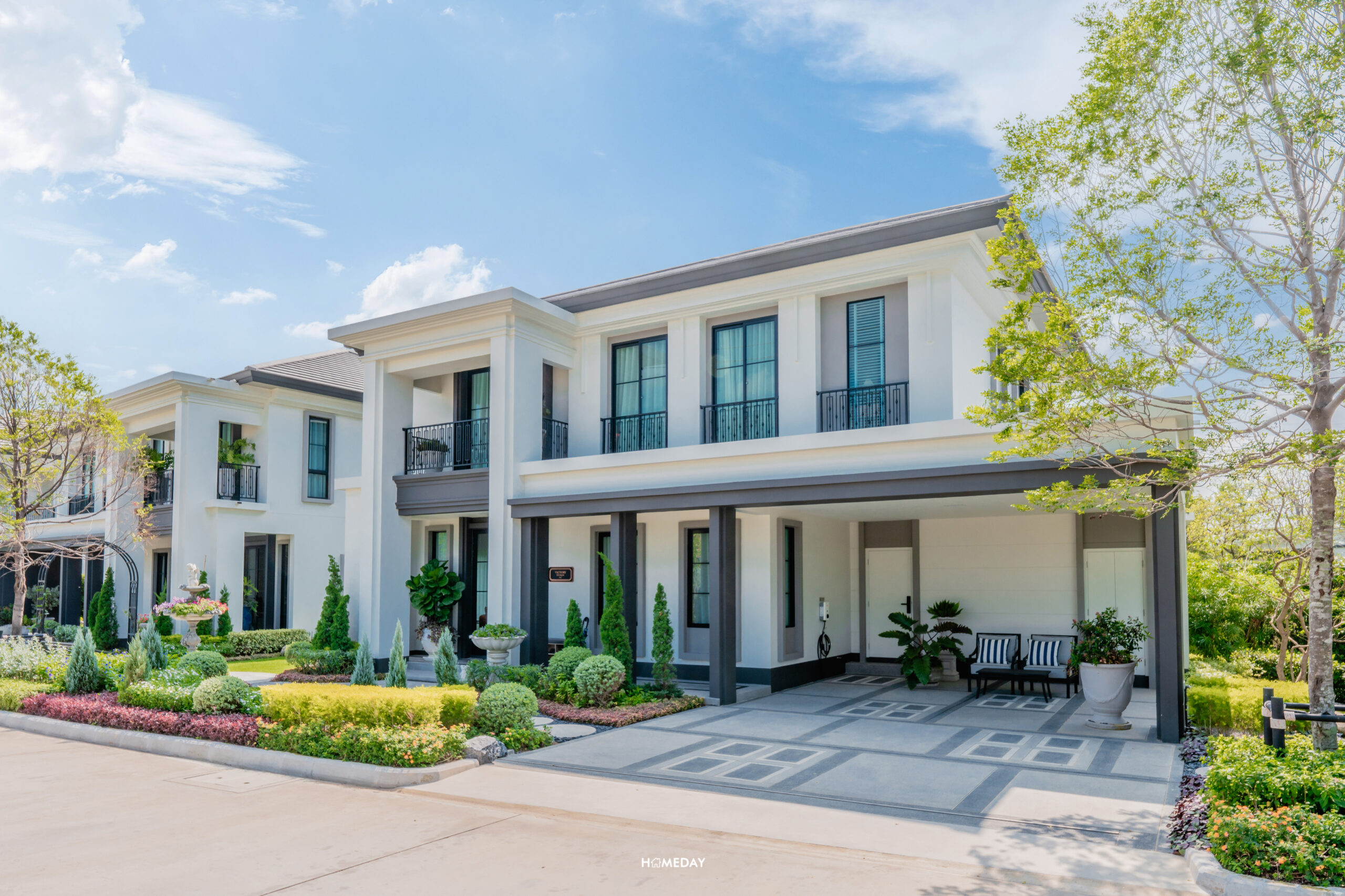 ก่อนจะเข้าไปสำรวจกันยังภายในตัวบ้าน มาดูในส่วนของ Facade และพื้นที่รอบ ๆ บ้านกันก่อนครับ แน่นอนว่าสไตล์การตกแต่งของตัวบ้าน มาในดีไซน์แบบ Modern Classic ที่มีความสวยงาม Timeless Design เหนือกาลเวลา โทนสีของตัวบ้านทุกหลังจะมาในโทนขาวและเทา ประดับตกแต่งระเบียงด้วยเหล็กดัดสีดำที่มีความเข้ากัน และติดตั้ง Solar Panel ให้ด้วยครับ
