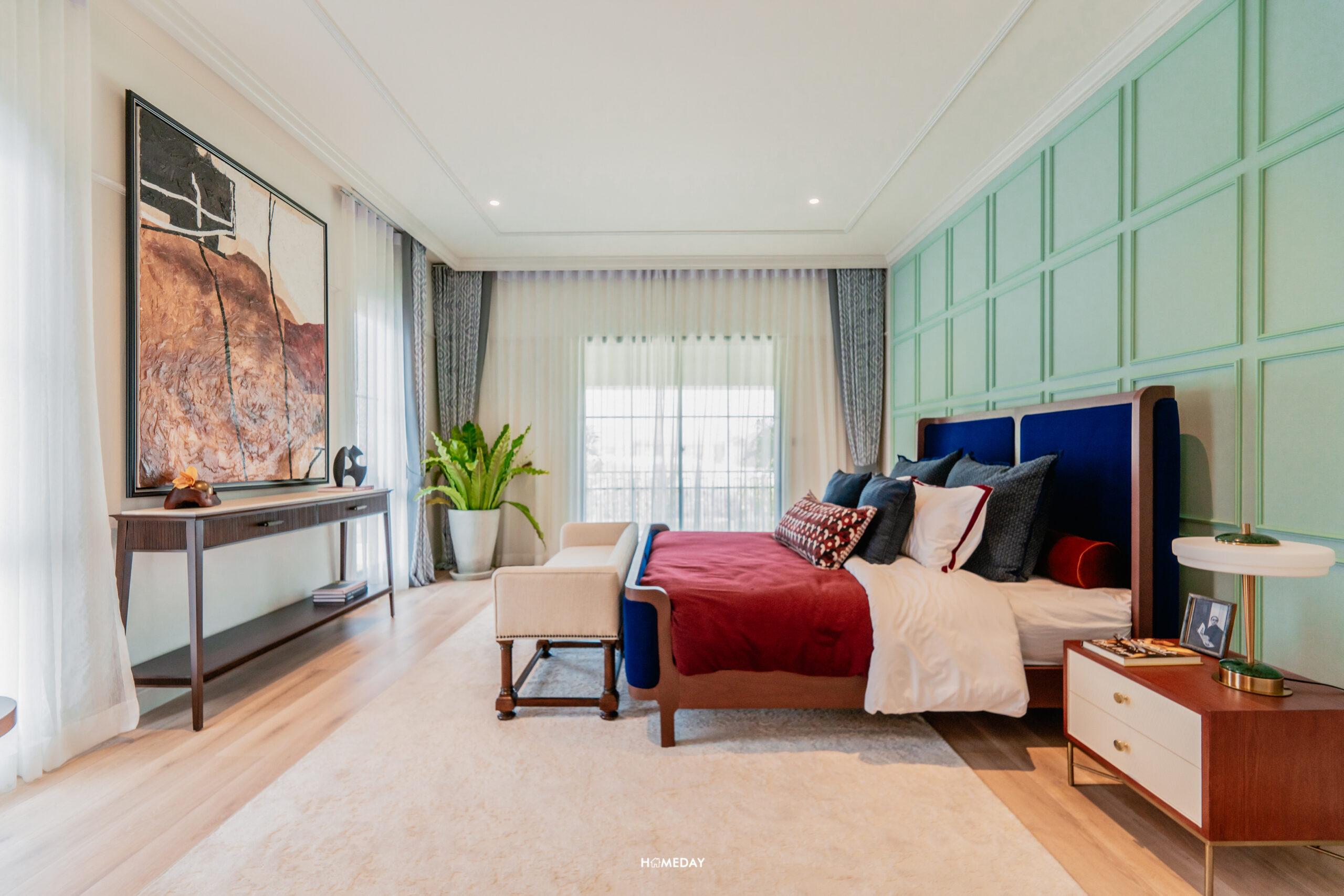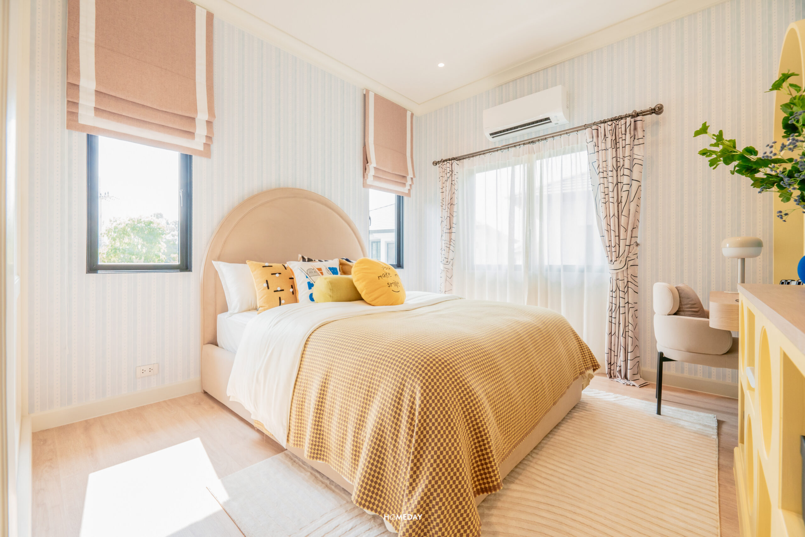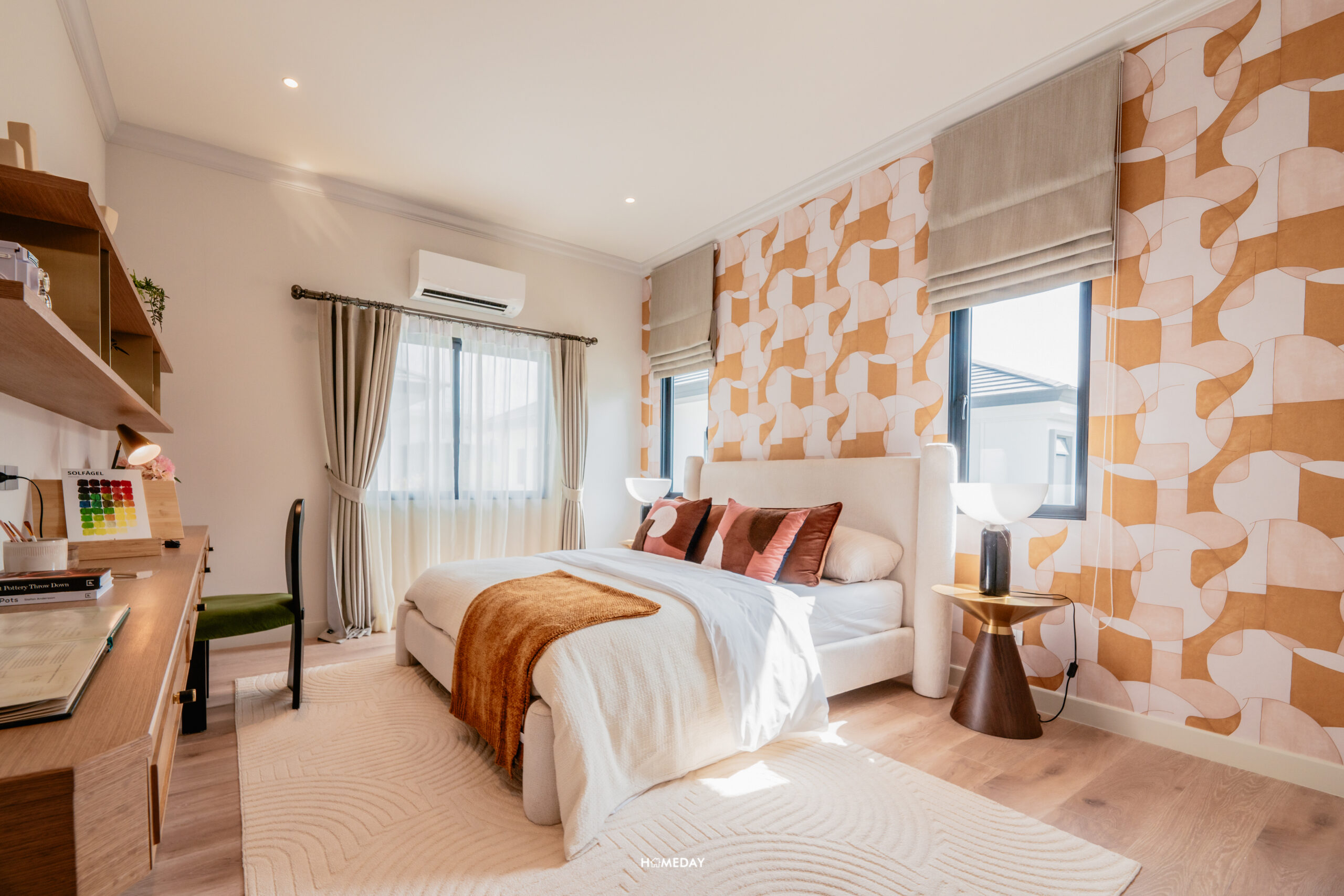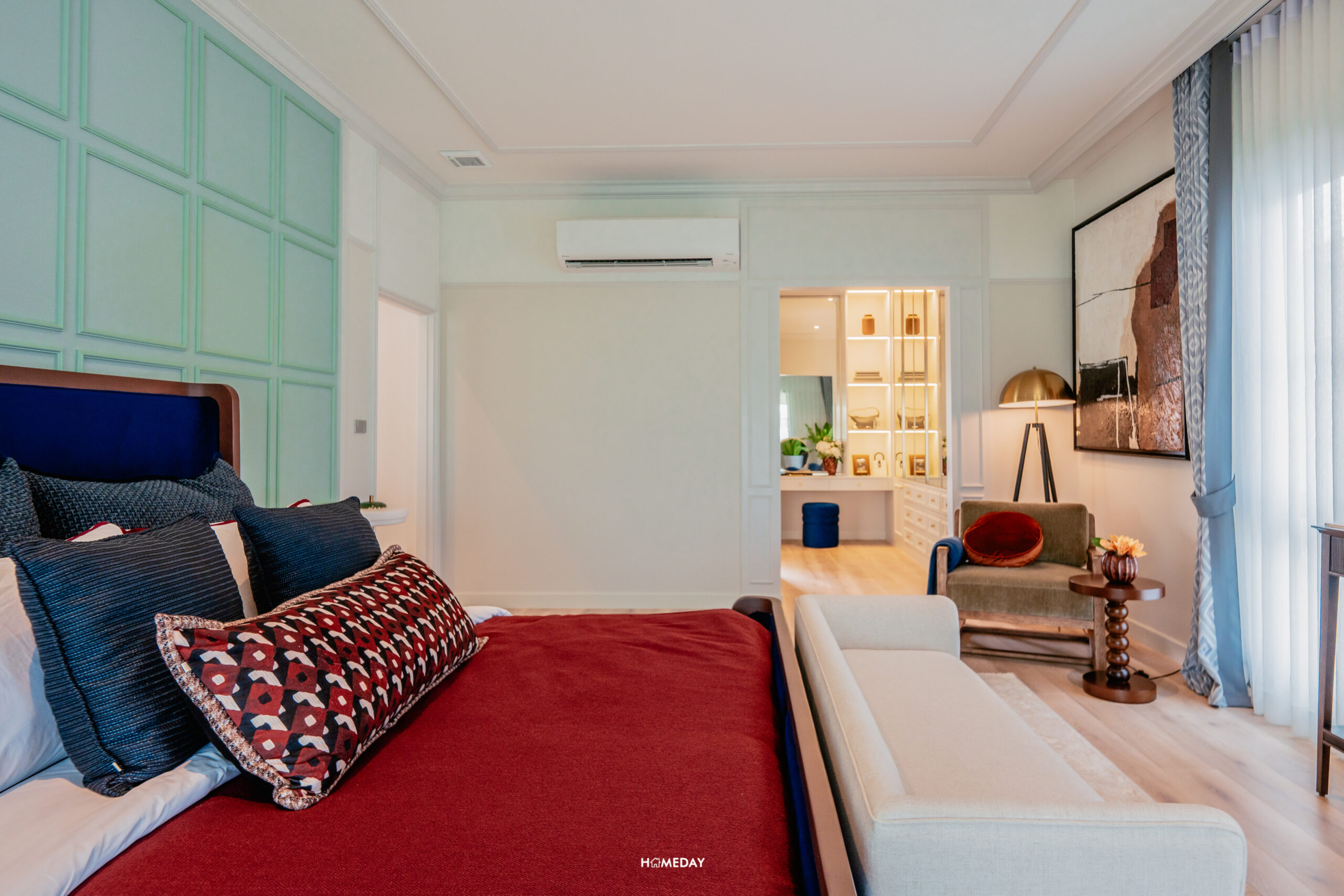 บ้านตัวอย่างตกแต่งห้องนี้ให้ดูโดยวางเตียงขนาด 6 ฟุต พร้อมด้วยโต๊ะหัวเตียงทั้งสองฝั่ง ชั้นวางของปลายเตียง และมีมุมนั่งเล่นพร้อมอาร์มแชร์ด้านข้าง จะเห็นได้เลยครับว่ายังมีพื้นที่เหลือให้เดินรอบ ๆ เตียงได้แบบคล่องตัว บ้านจริงยังสามารถใส่ฟังก์ชันอื่น ๆ ตามที่ต้องการเพิ่มเข้าไปอีกได้ครับ