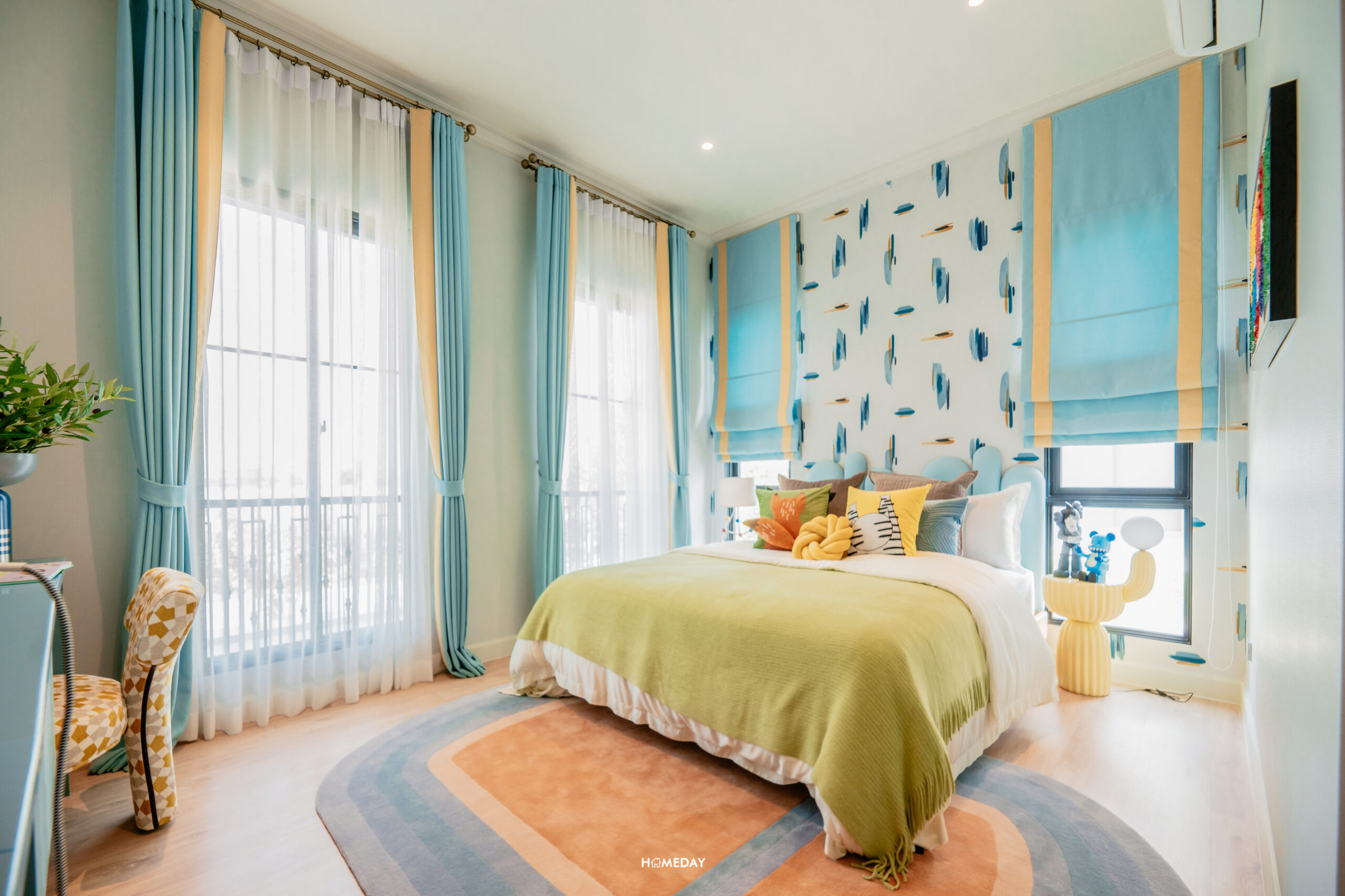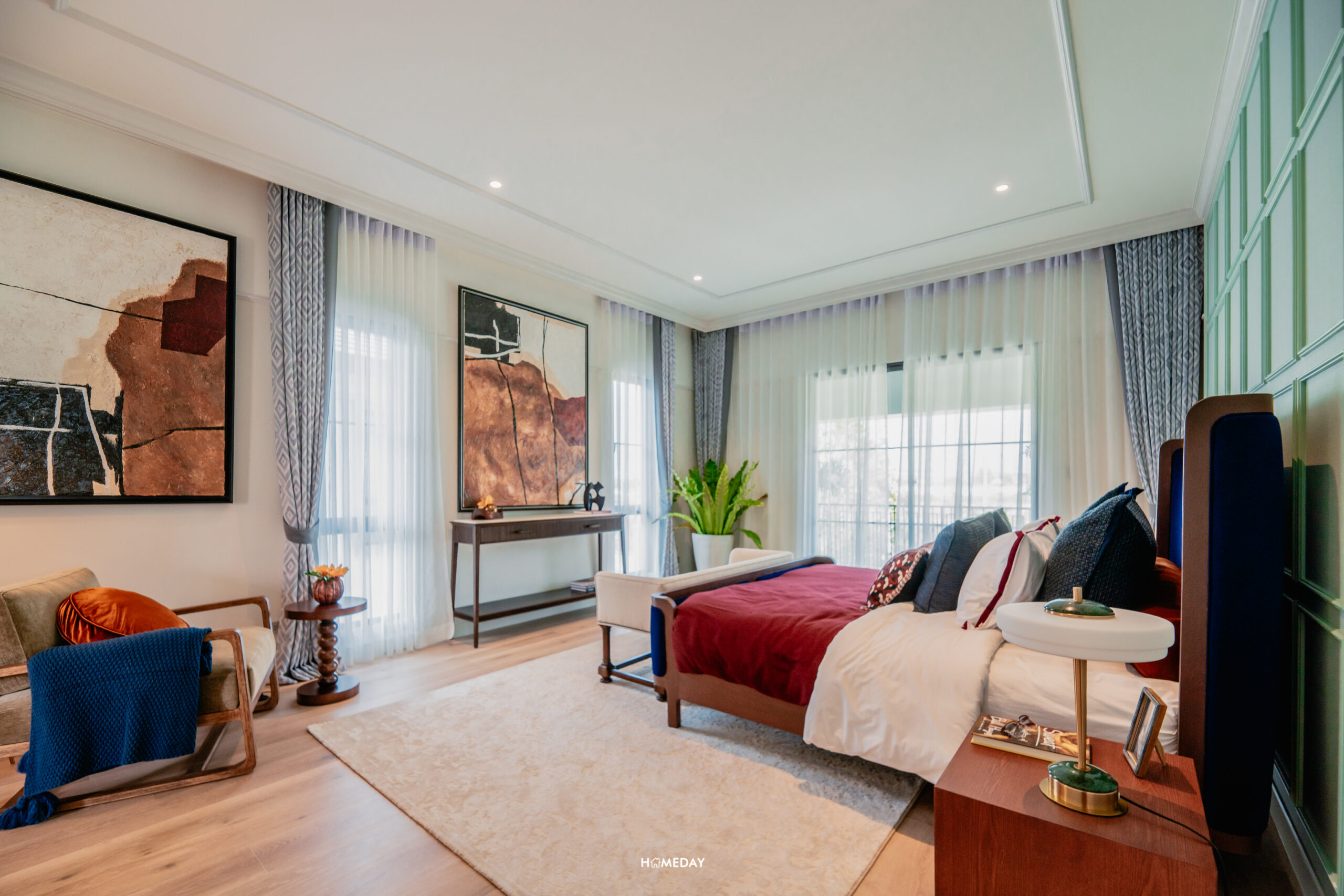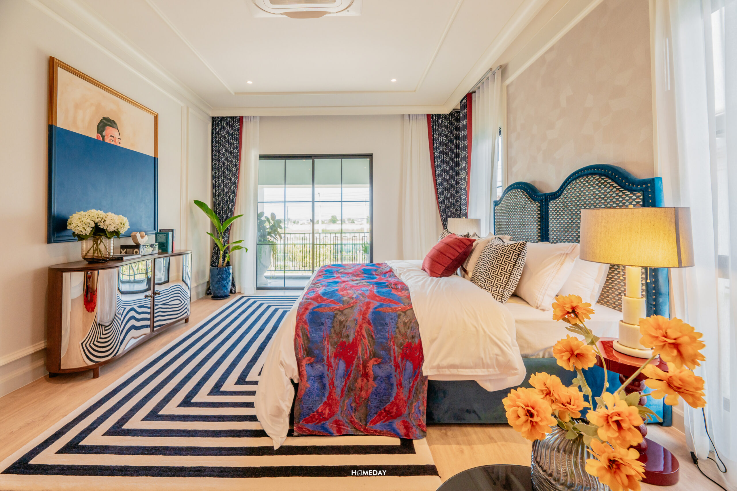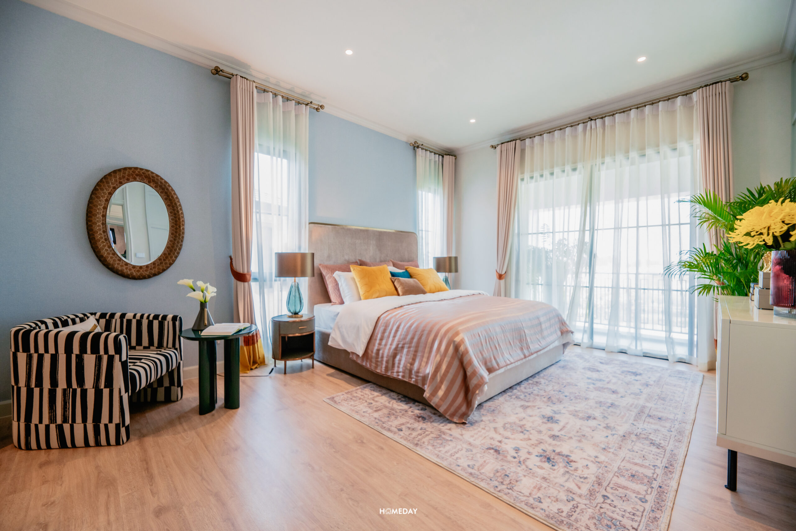 บ้านตัวอย่างตกแต่งห้องนี้ให้ดูโดยวางเตียงขนาด 6 ฟุต พร้อมด้วยโต๊ะหัวเตียงทั้งสองฝั่ง ชั้นวางของปลายเตียง และมีมุมนั่งเล่นพร้อมอาร์มแชร์ด้านข้าง จะเห็นได้เลยครับว่ายังมีพื้นที่เหลือให้เดินรอบ ๆ เตียงได้แบบคล่องตัว บ้านจริงยังสามารถใส่ฟังก์ชันอื่น ๆ ตามที่ต้องการเพิ่มเข้าไปอีกได้ครับ