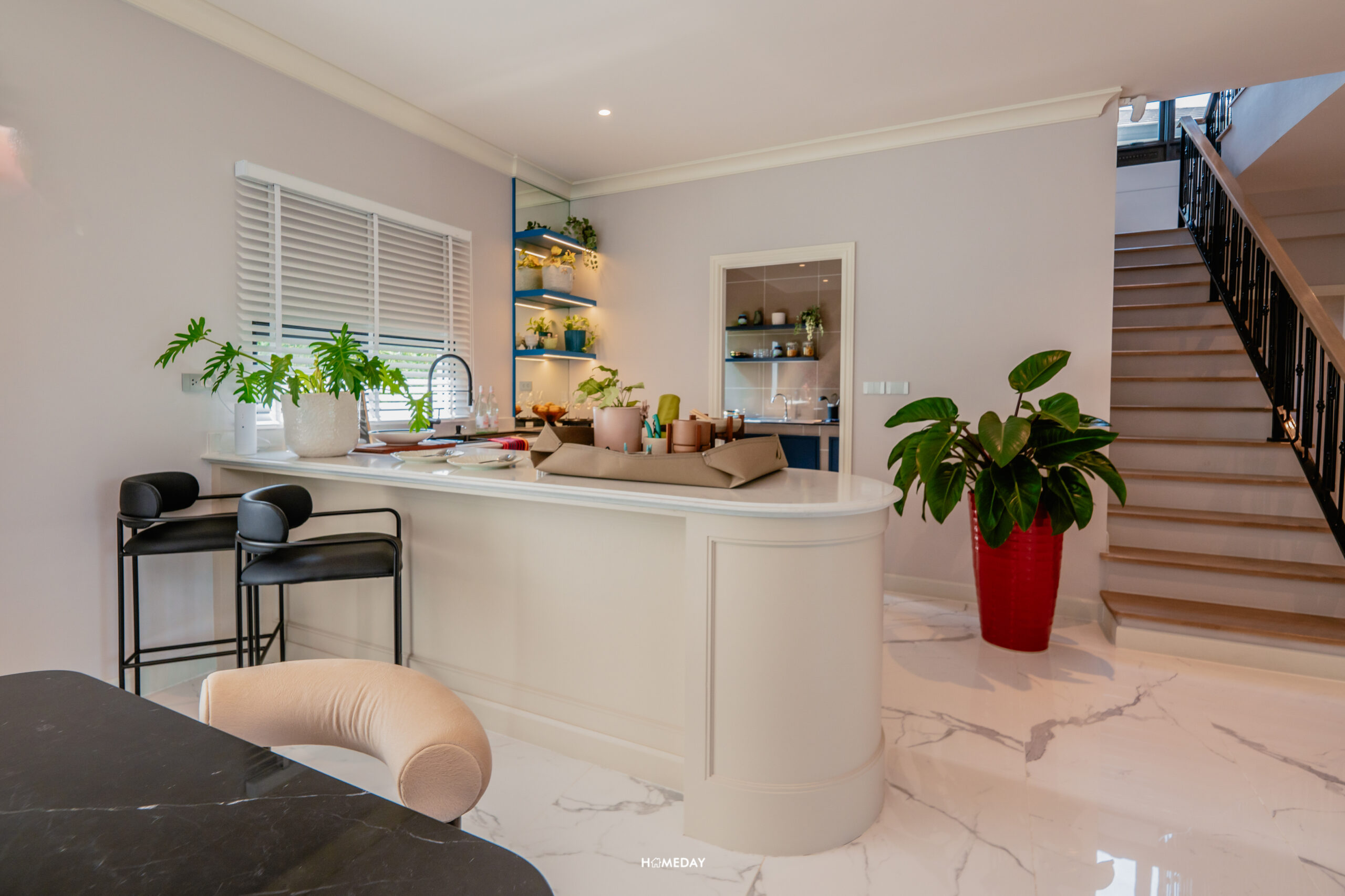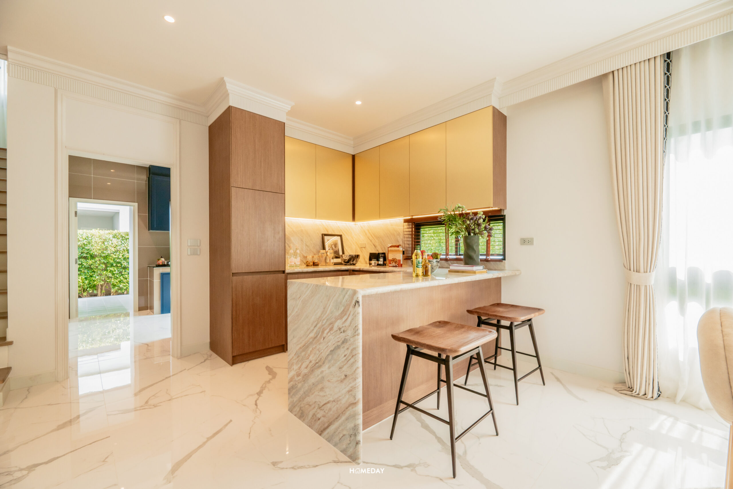 พื้นที่ติดกันกับโต๊ะรับประทานอาหารยังเหลือให้ใช้งานอีกหนึ่งจุด เป็นส่วนเตรียมอาหารที่ทางโครงการมีไว้ให้ มาพร้อมกระจกบานเล็กสำหรับระบายอากาศ บ้านตัวอย่างออกแบบเป็น Pantry ครัวสไตล์ฝรั่ง ไว้สำหรับทำอาหารง่าย ๆ เบา ๆ เป็นมุมชงกาแฟ เครื่องดื่มต่าง ๆ หรือจะอบขนมก็เหมาะ ออกแบบเคาน์เตอร์เป็นทรงตัว U มาพร้อมเก้าอี้บาร์ สามารถนั่งเตรียมอาหาร หรือใช้เป็นมุมรับประทานอาหารก็ได้เช่นกัน แถมเรายังสามารถมองเห็นพื้นที่นั่งเล่นได้จากมุมนี้ด้วย เหมาะกับครอบครัวที่มีเด็ก ๆ บ้านจริงเราก็สามารถนำไอเดียนี้ไปปรับใช้ได้ครับ หรือใครจะออกแบบเป็นพื้นที่ใช้สอยอื่น ๆ ก็ได้เช่นกัน