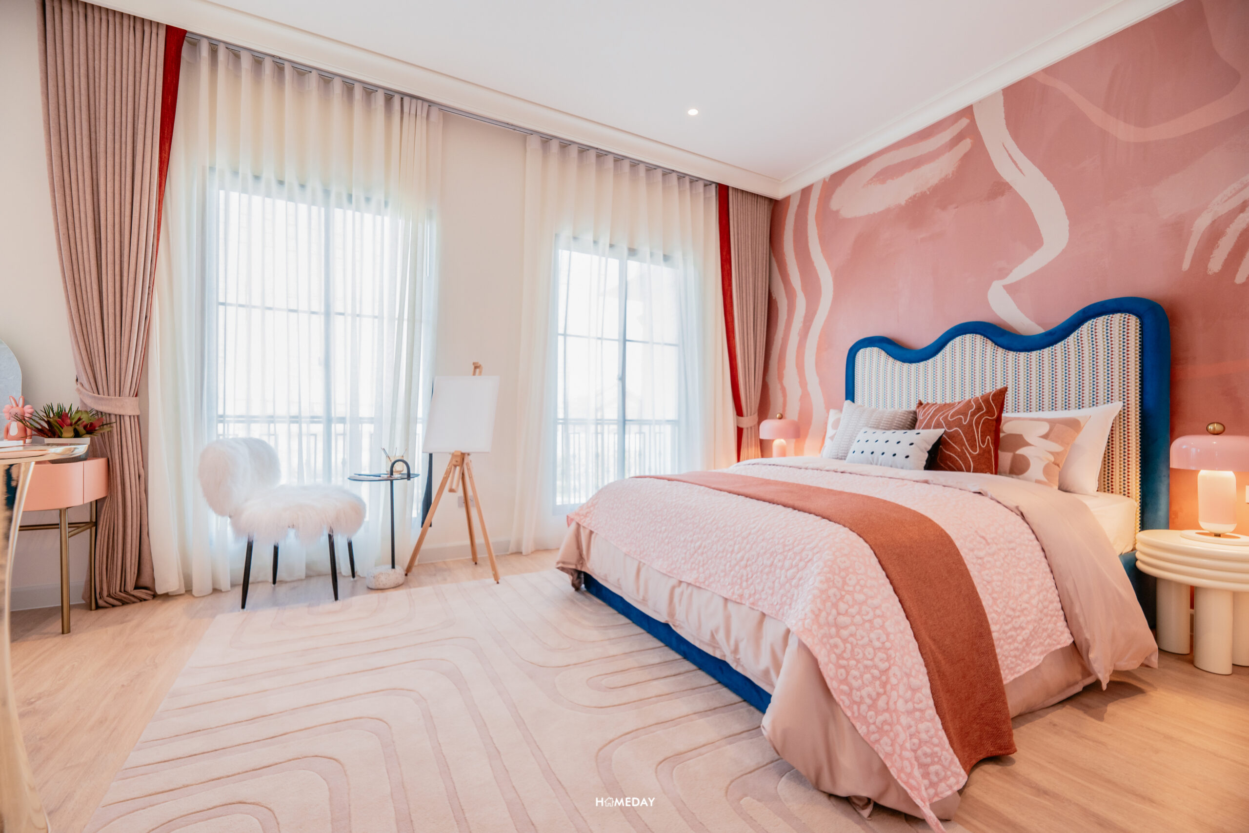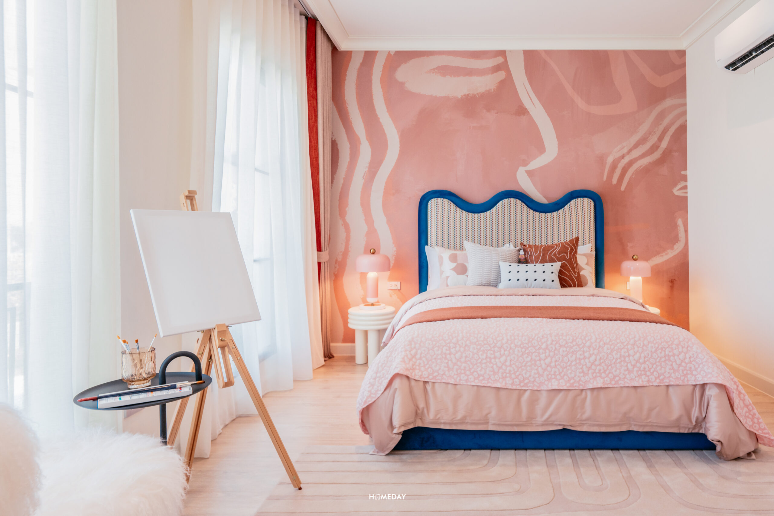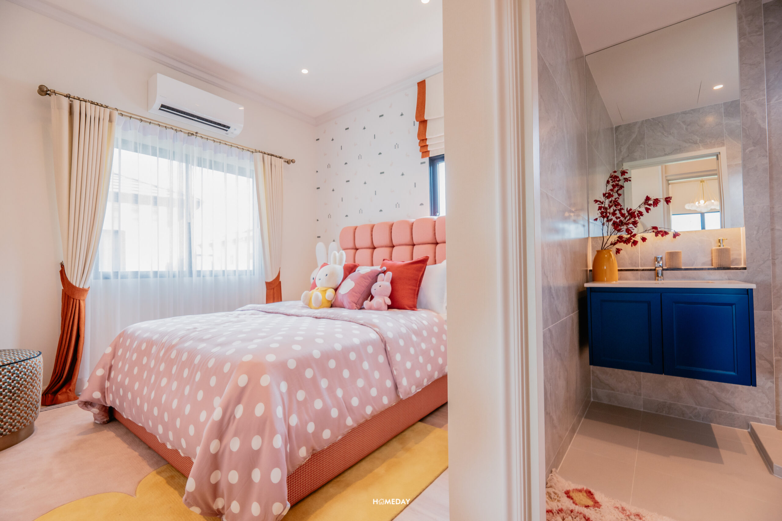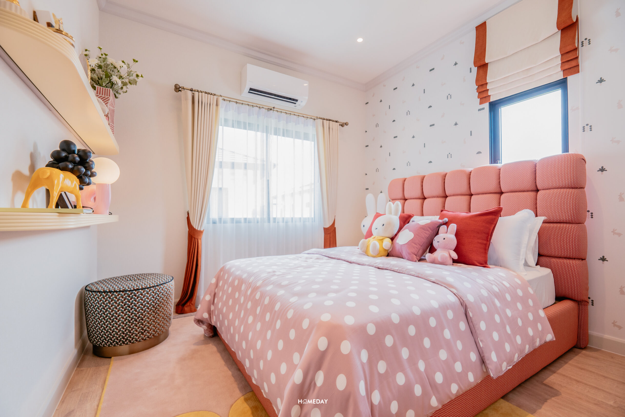 Bedroom 3 ห้องแรก บ้านตัวอย่างตกแต่งมาได้หวานสดใส ตัวแปลนเป็นลักษณะหน้ากว้าง ทำให้มีความเป็นสัดส่วนในการใช้งานมากยิ่งขึ้น ขวามือจากประตูทางเข้าจะเป็นพื้นที่สำหรับวางเตียงครับ รองรับไซซ์ใหญ่ 6 ฟุตได้สบาย ๆ หัวเตียงสองฝั่งวางโต๊ะหัวเตียงได้ครับ