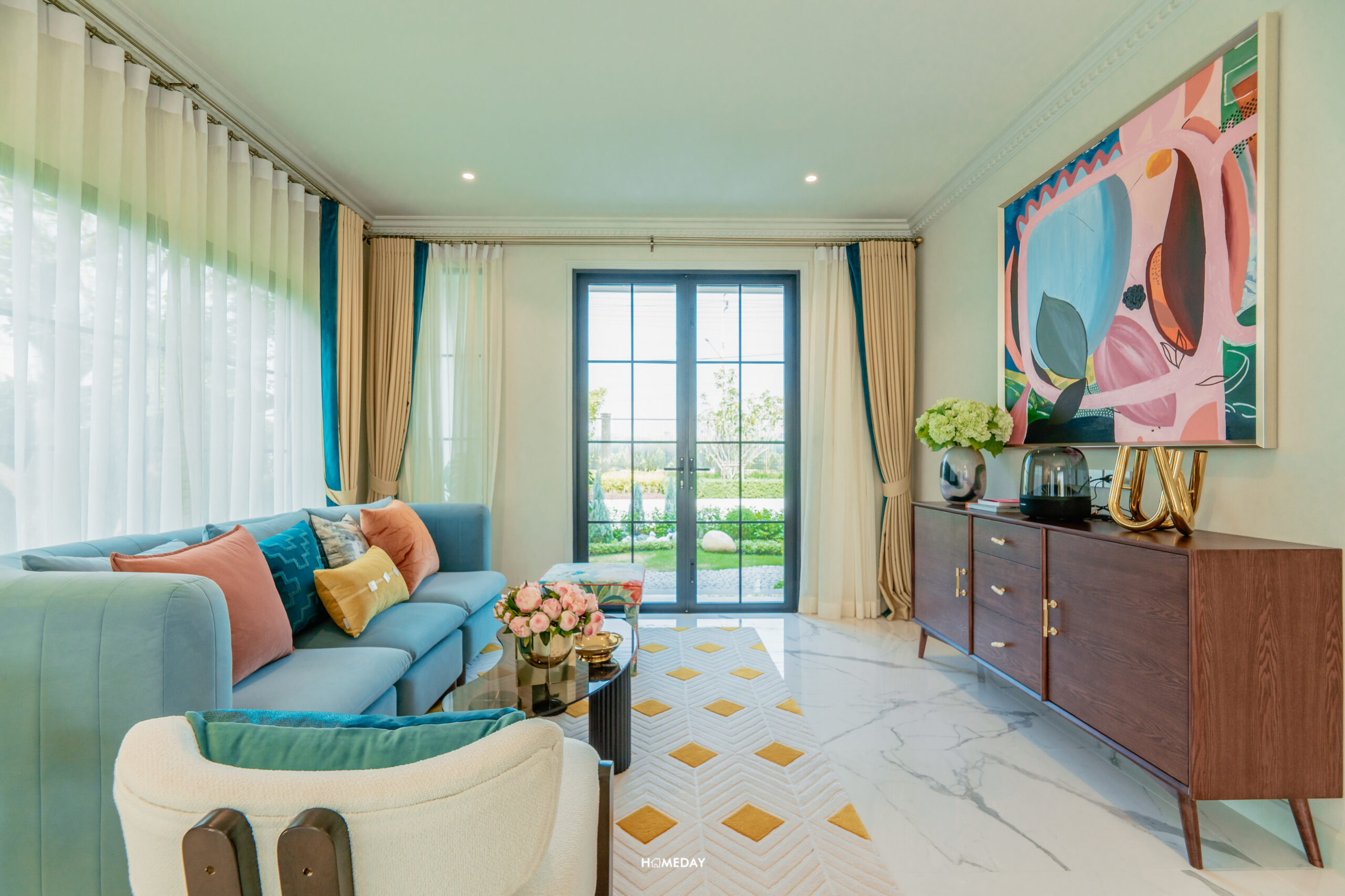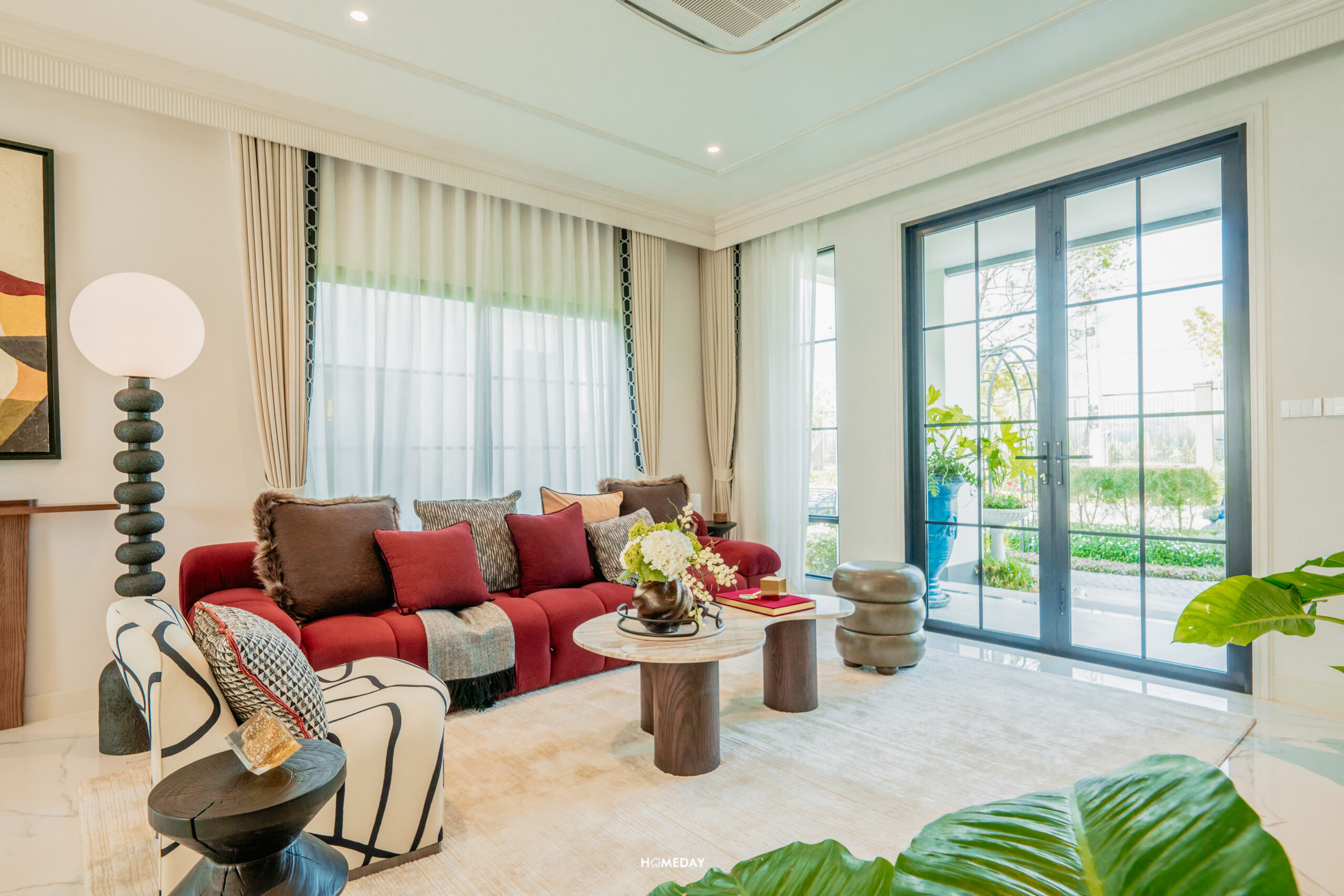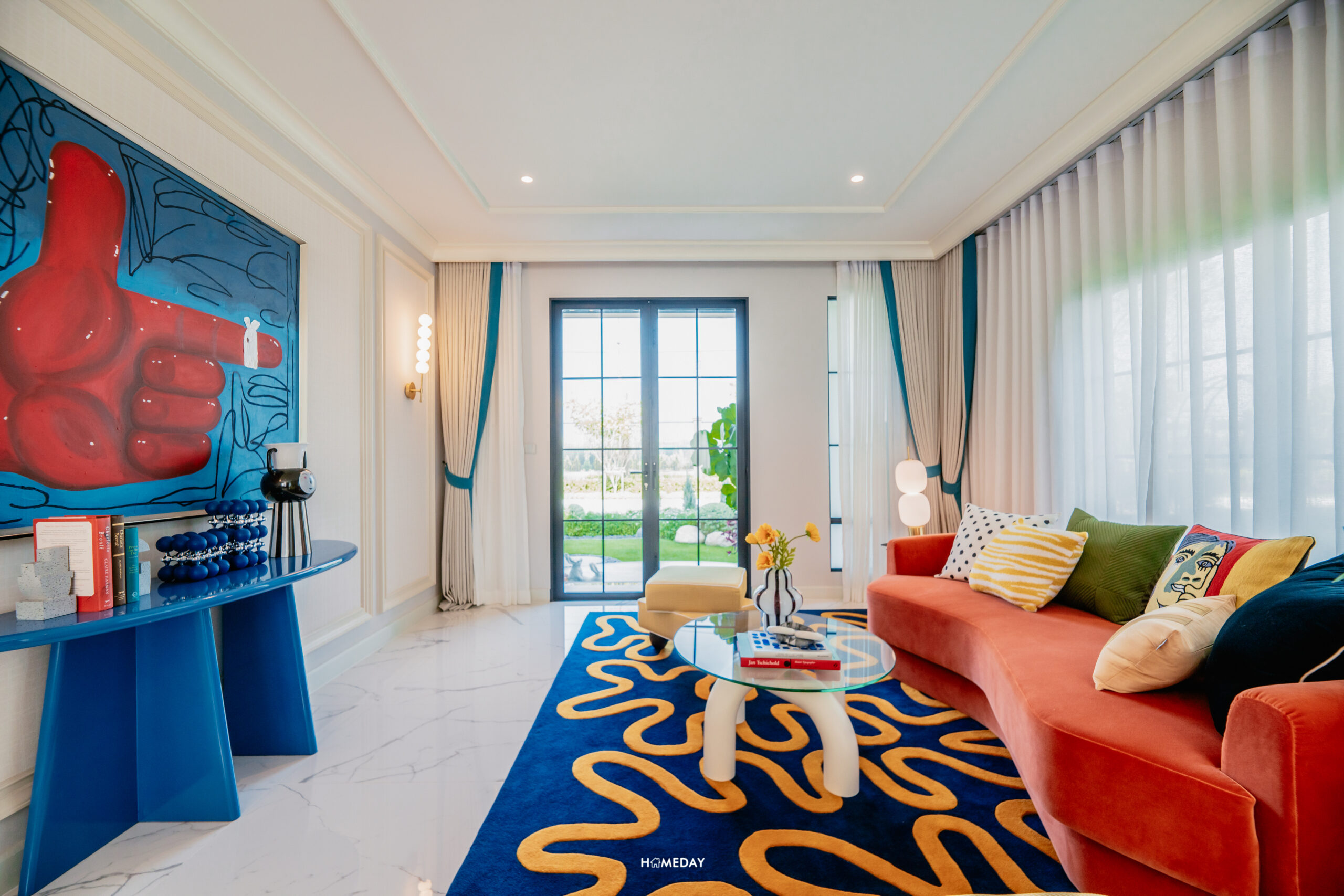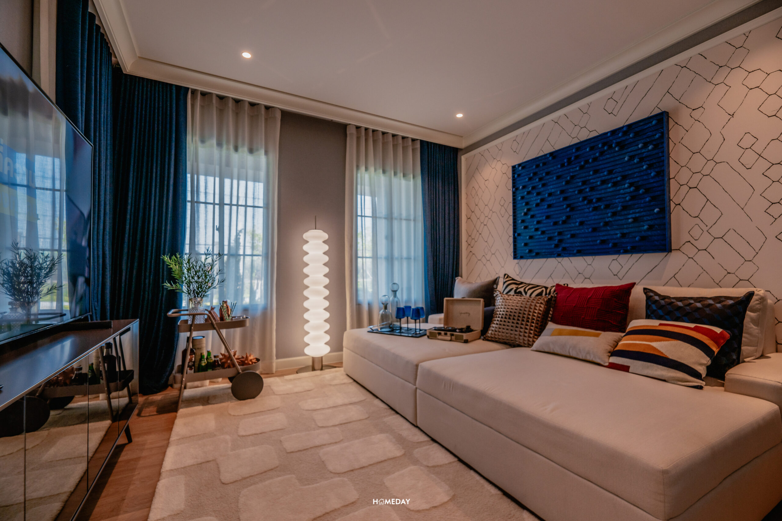 พื้นที่ห้องนั่งเล่น ได้ระยะหน้ากว้างที่ใหญ่เลยครับ แถมยังมีช่องแสงขนาดใหญ่จากบานหน้าต่างช่วยเสริมทัพ บรรยากาศเลยดูโล่งสบาย ผ่อนคลาย เหมาะทั้งสำหรับรองรับครอบครัวและแขก สามารถใส่ชุดโซฟาขนาดใหญ่ 4-5 ที่นั่งได้เลยนะครับ หรือจะวางเป็น 3 ชิ้นทั้งโซฟา, ม้านั่ง และอาร์มแชร์ แบบบ้านตัวอย่างก็ดูดีไปอีกแบบ เรื่องระยะการรับชมก็ไม่ต้องเป็นห่วงครับ ติดตั้งทีวีจอใหญ่ได้ไม่มีปัญหา