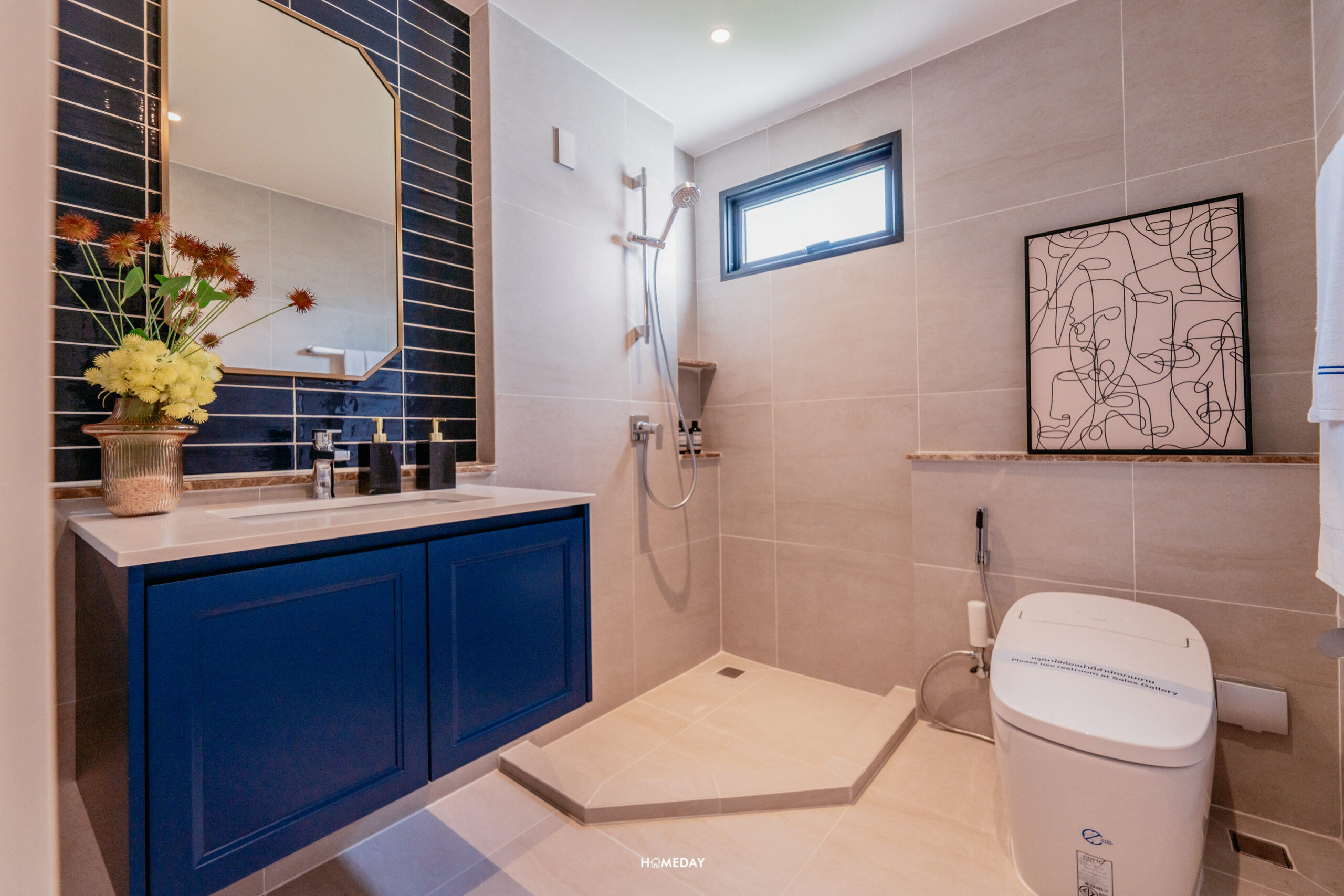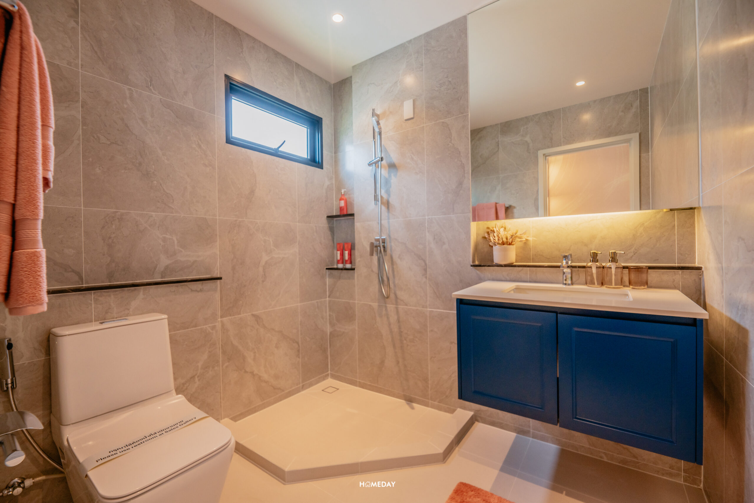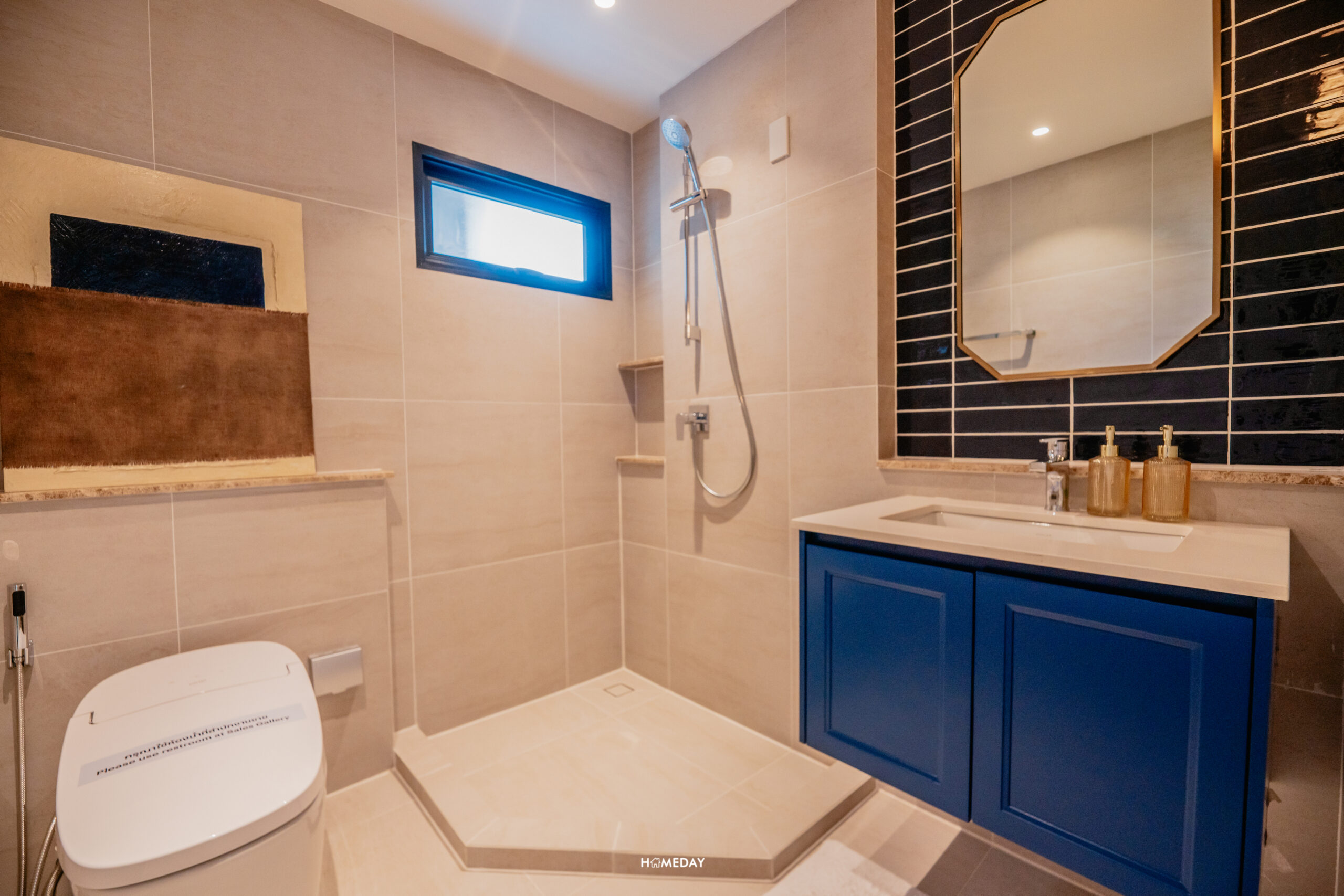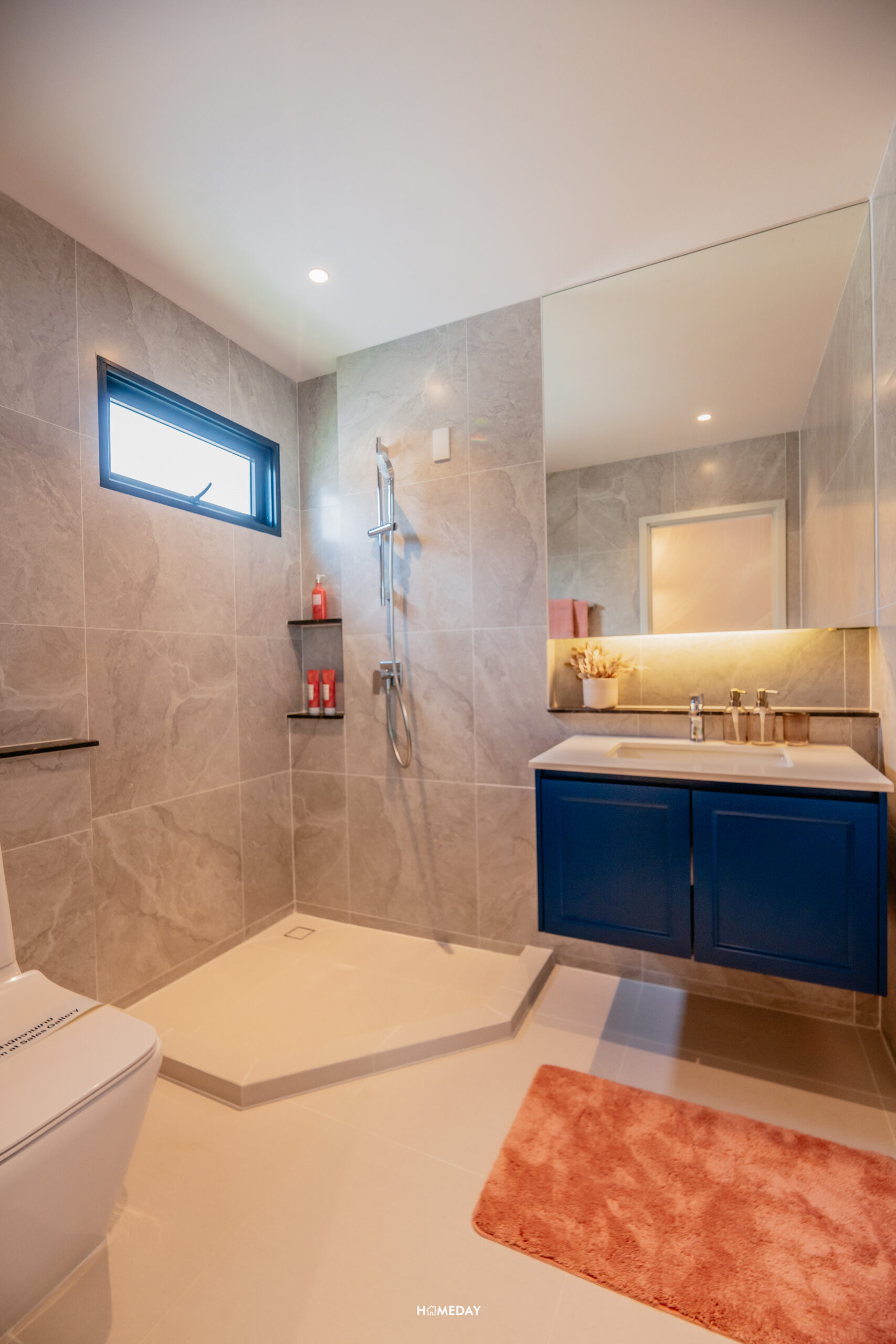 ห้องน้ำชั้นล่างก็เหมือนเดิมเลยครับ ได้ Hand Shower มาพร้อม ใช้งานอาบน้ำสำหรับผู้ที่อาศัยอยู่ Bedroom 4 ได้เลย หรือจะเอาไว้รองรับแขกก็ได้เช่นกัน บิลต์อินพื้นที่วางของมาให้พร้อม ไม่ต้องต่อเติมหรือติดตั้งเพิ่มแต่อย่างใดครับ