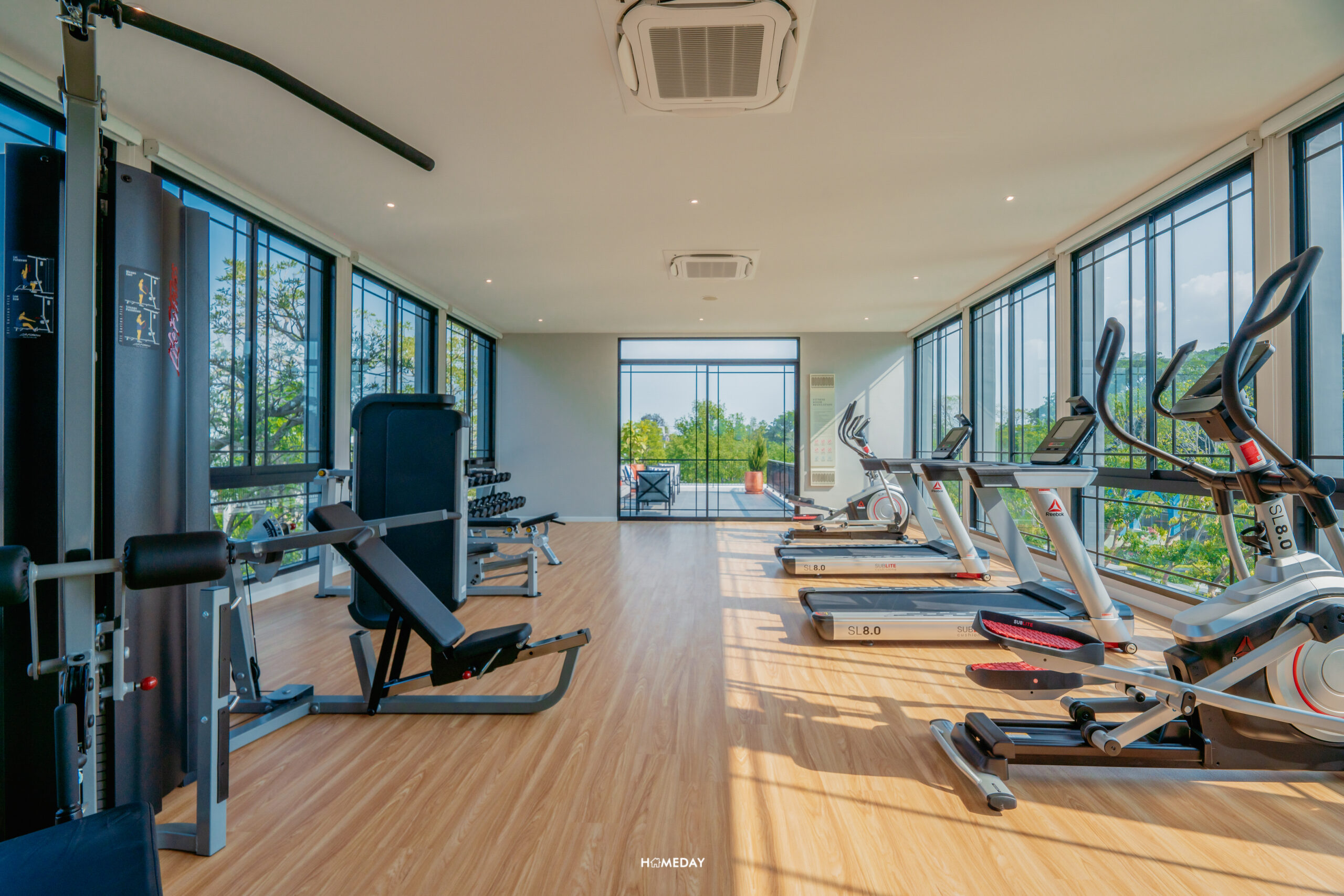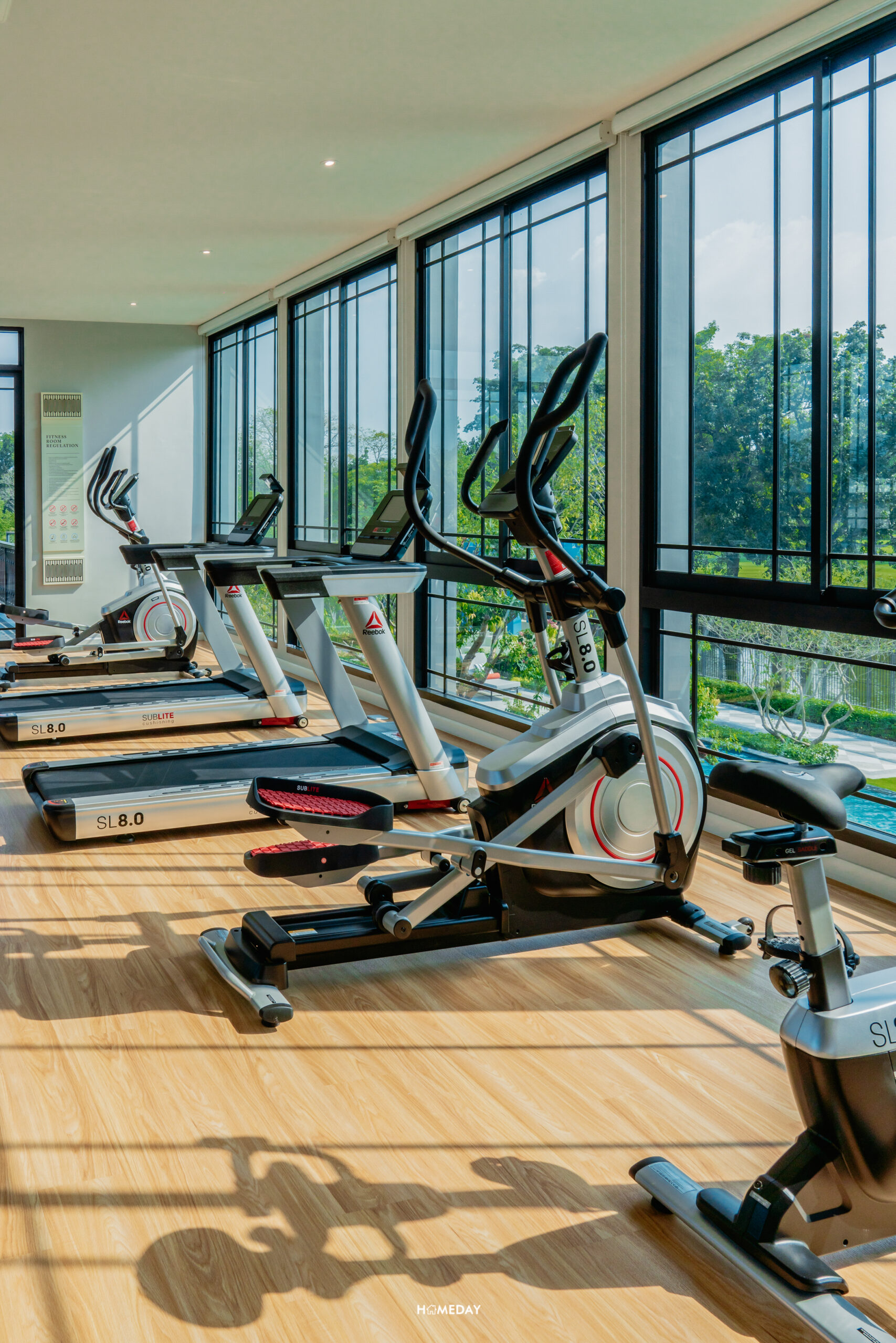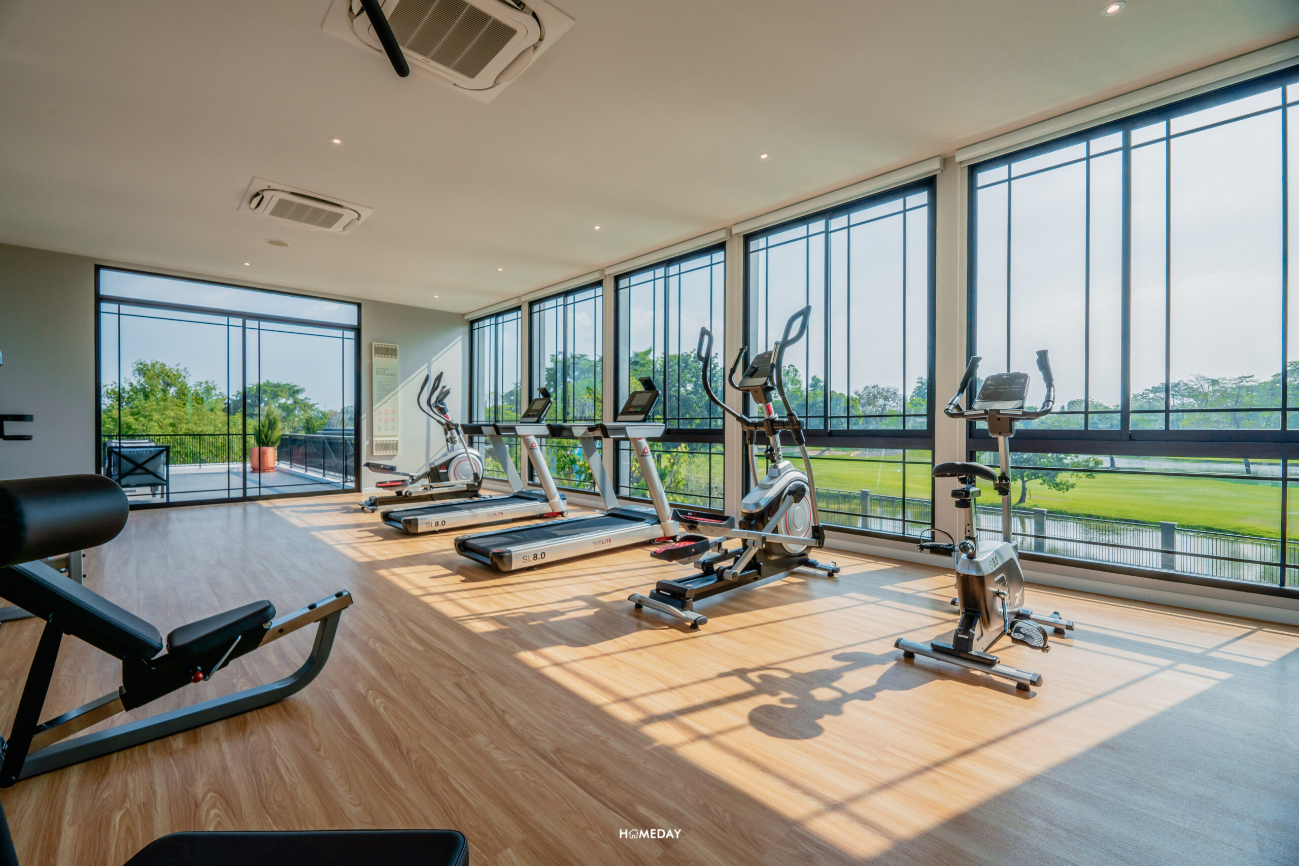 ชั้น 2 จะมีพื้นที่นั่งเล่นอีกหนึ่งจุด ถัดเข้าไปด้านในจะเป็นห้องออกกำลังกายฟิตเนสพร้อมอุปกรณ์ครบครัน ตอบโจทย์ความต้องการสำหรับคนรักสุขภาพ ตัวห้องได้บรรยากาศโปร่ง รับวิวโครงการและวิวสนามกอล์ฟเต็ม ๆ แบบพาโนราม่า เพลิดเพลินกับวิวไปด้วยได้แบบชิล ๆ เลยครับ ส่วนใครที่อยากจะนั่งเล่นรับลมเอาต์ดอร์ เชื่อมกับฟิตเนสก็มีระเบียงขนาดใหญ่พร้อมพื้นที่นั่งเล่นรองรับไว้ให้ ขึ้นมาใช้งานในจุดนี้เปลี่ยนบรรยากาศได้เช่นกัน