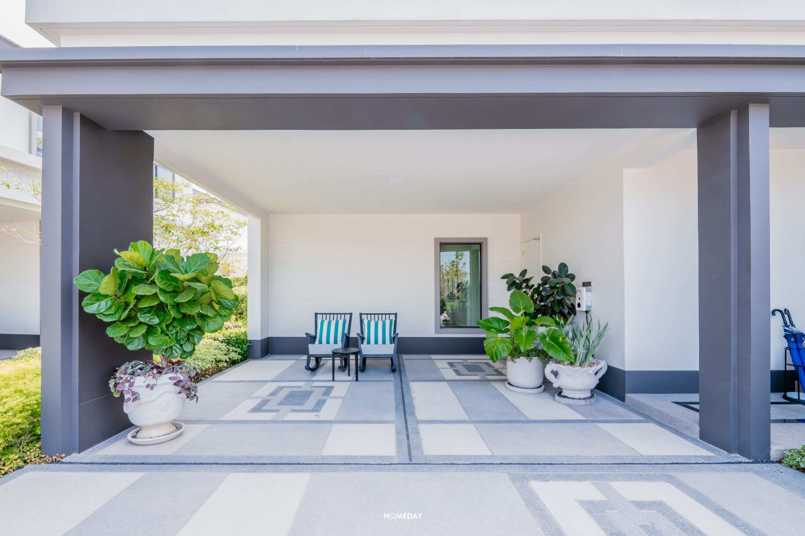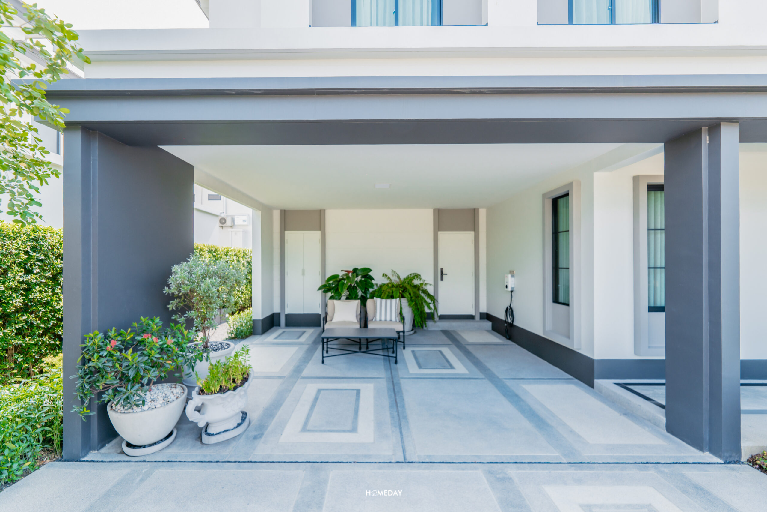 โรงจอดรถรองรับการจอดในร่มได้ถึง 2 คัน มาพร้อม EV Charger และประตูทางเข้าเชื่อมโรงจอดรถ และออกแบบทางเดินเชื่อมไปยังประตูทางเข้าหลักให้อยู่ใต้ชายคาเหมือนเช่นเคยครับ จะฝนตกหรือแดดออกก็หมดกังวลไปได้เลย เฉลียงหน้าบ้านเหลือพื้นที่ให้สามารถวางชั้นรองเท้าได้ หรือใครจะวางเป็นต้นไม้ประดับเอาไว้ตกแต่งบ้านก็ได้เช่นกัน