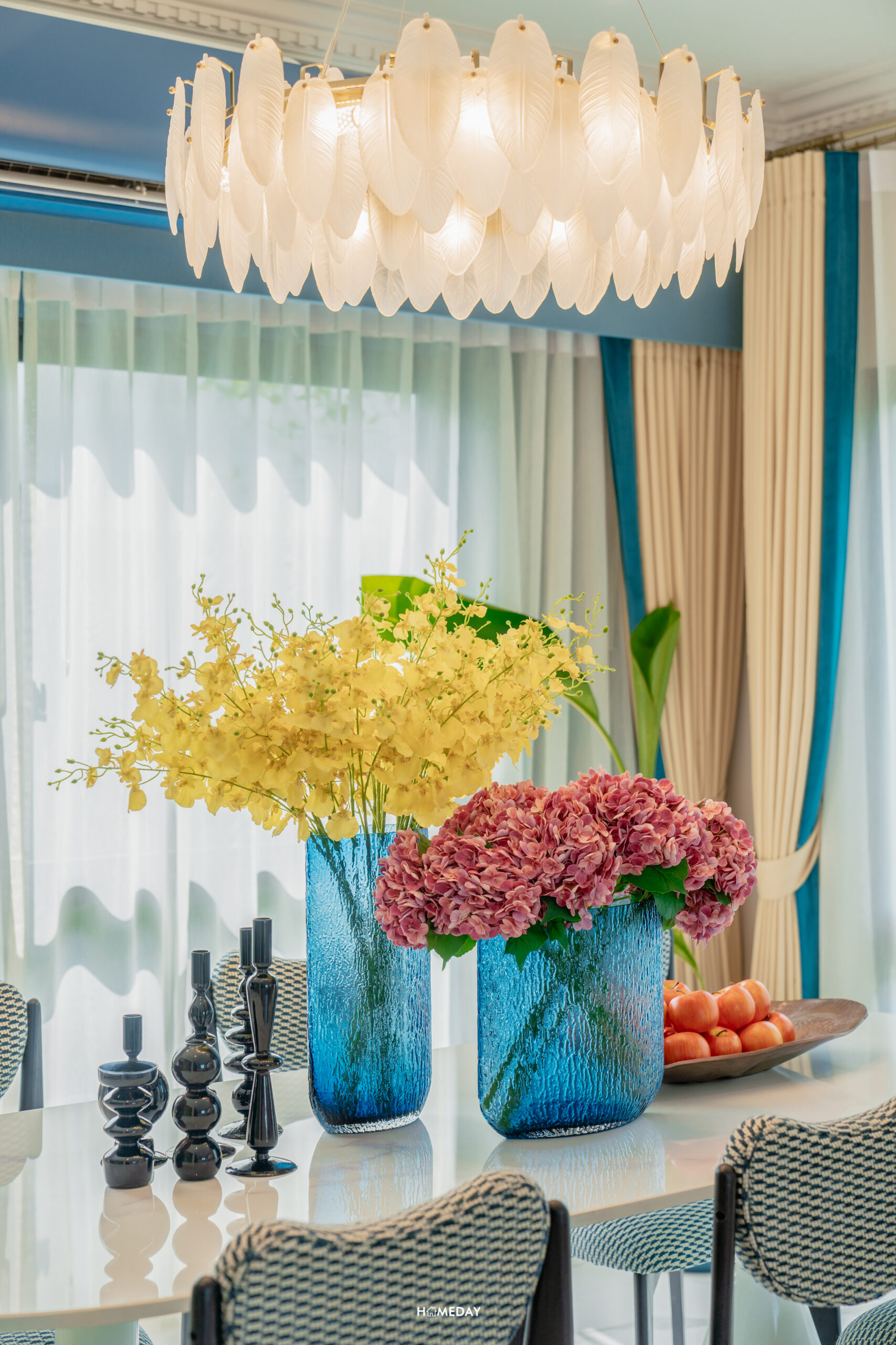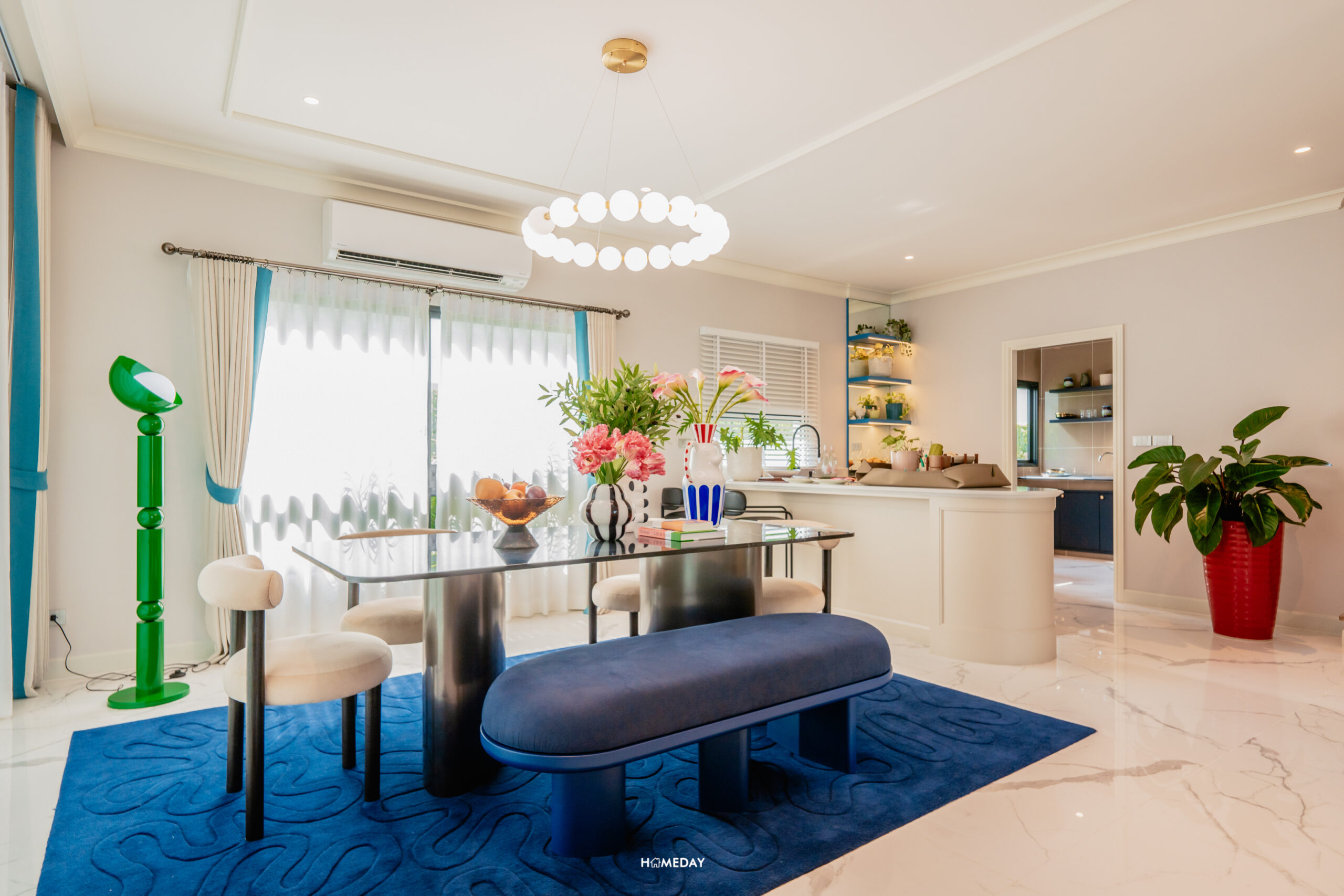 พื้นที่วางโต๊ะรับประทานอาหาร บ้านตัวอย่างหลังนี้ออกแบบได้น่ารักสดใส เข้ากันได้ดีกับพื้นที่นั่งเล่นเลยครับ เลือกผสมระหว่างม้านั่งตัวยาวและเก้าอี้ ทำให้พื้นที่ดูไม่น่าเบื่อ บ้านตัวอย่างออกแบบพื้นที่รับประทานอาหารสำหรับ 6 ที่นั่งให้เราชมเป็นไอเดีย จะเห็นได้ว่าพื้นที่รอบ ๆ ยังเหลือให้ใช้งานได้พอสมควรครับ จะปรับจำนวนเพิ่มเป็น 8 ที่นั่งก็ยังไหว มุมนี้มีประตูกระจกบานสไลด์เชื่อมออกไปยังสวนด้วย รับวิวและแสงสว่างจากด้านนอกได้เป็นอย่างดีเลยครับ