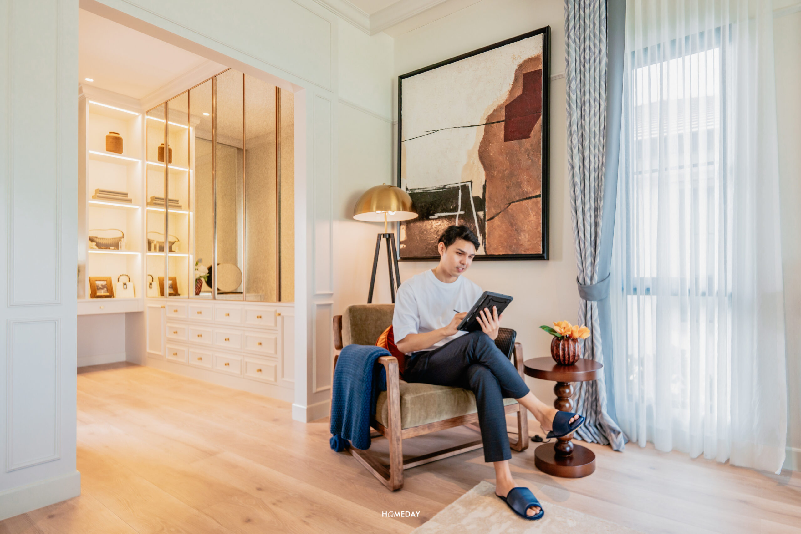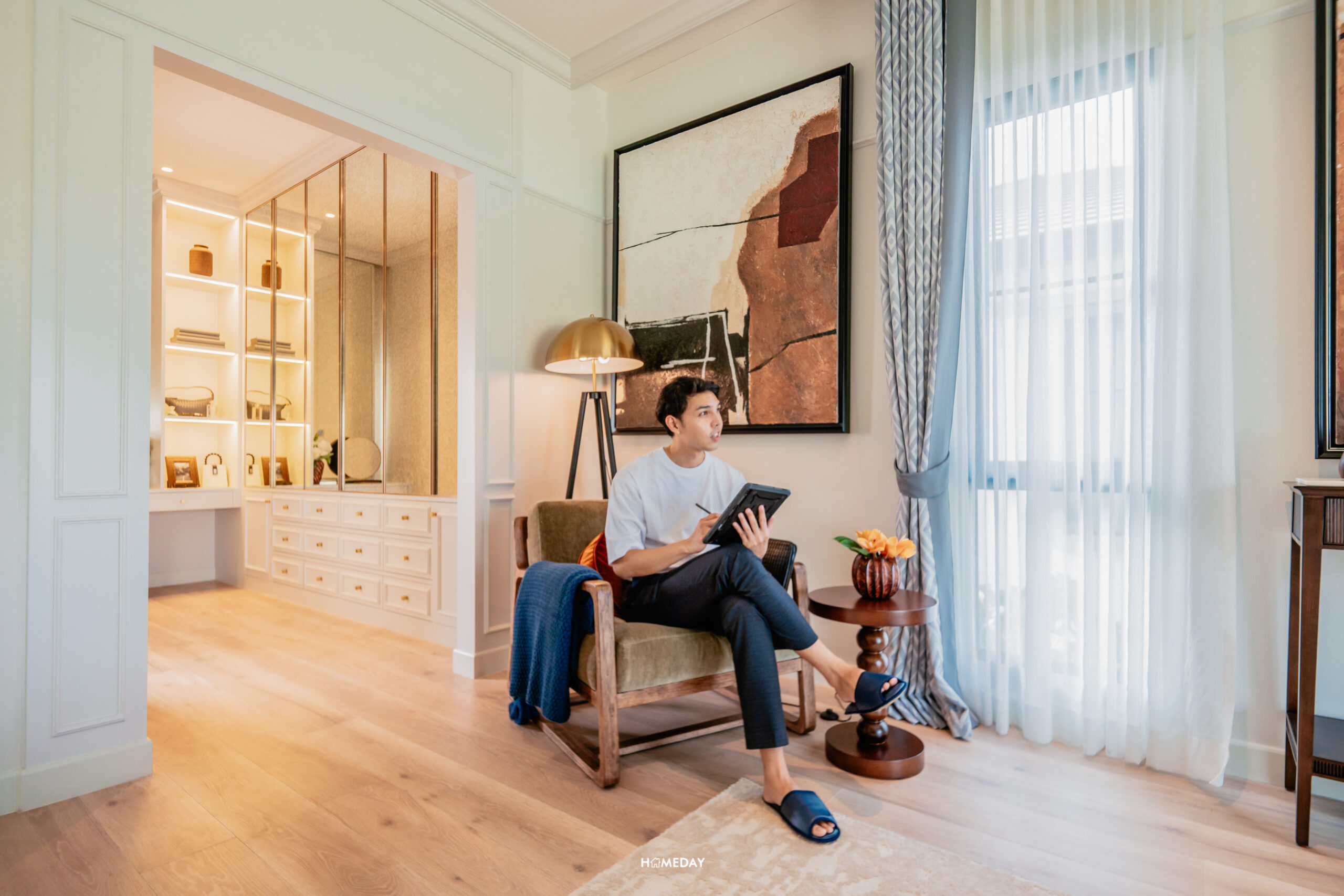 หันกลับมาที่อีกฝั่งหนึ่ง บริเวณด้านหน้าพื้นที่ Walk-in Closet ก็ยังเหลือพื้นที่ให้ใช้งานได้เพิ่มเติมอีกครับ ทำเป็นมุมนั่งเล่นอ่านหนังสือชิล ๆ ได้แบบบ้านตัวอย่างเลย ผนังซ้ายมือติดประตูทางเข้าก็แขวนชั้นวางของเพิ่มเติมได้ครับ