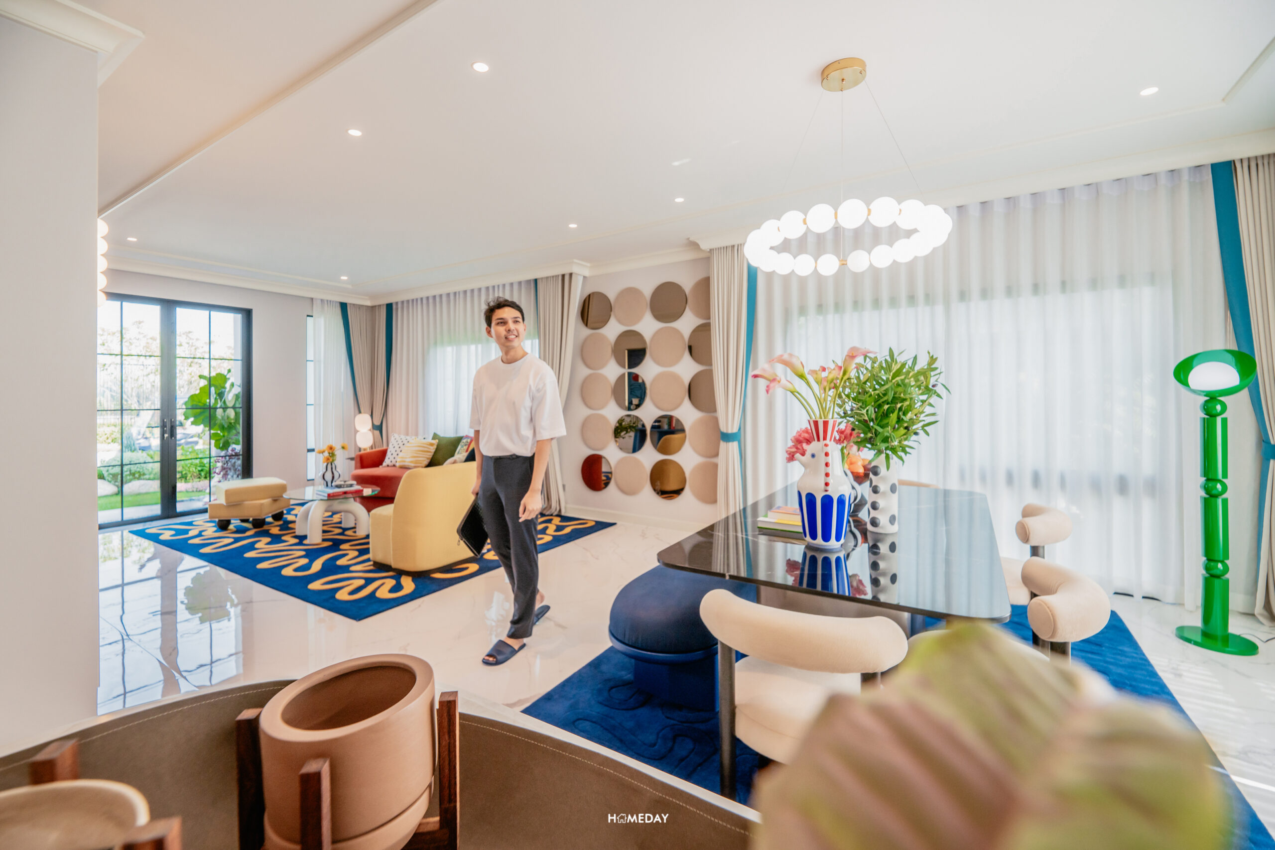 เปิดประตูเข้ามาภายในตัวบ้านก็จะเจอกับพื้นที่ Open Plan ขนาดใหญ่แบบนี้เลยครับ ส่วนแรกที่เรายืนอยู่จะเป็นห้องนั่งเล่นรับแขก ถัดเข้าไปก็จะเป็นพื้นที่สำหรับวางโต๊ะรับประทานอาหาร ความสูงของชั้น 1 จากพื้นถึงเพดานจะอยู่ที่ 2.7 เมตร ซึ่งถือว่าโปร่งโล่งมากทีเดียวครับ เมื่อเสริมกับพื้นปูกระเบื้องแกรนิตโต้ขนาด 60×120 มาให้ พร้อมกระจก Green Glass ทั้งหลังลดความร้อนแต่ยังรับแสงได้อย่างเต็มที่ ยิ่งทำให้บ้านดูโอ่โถง กว้างขวาง สว่าง และมีชีวิตชีวามาก ๆ