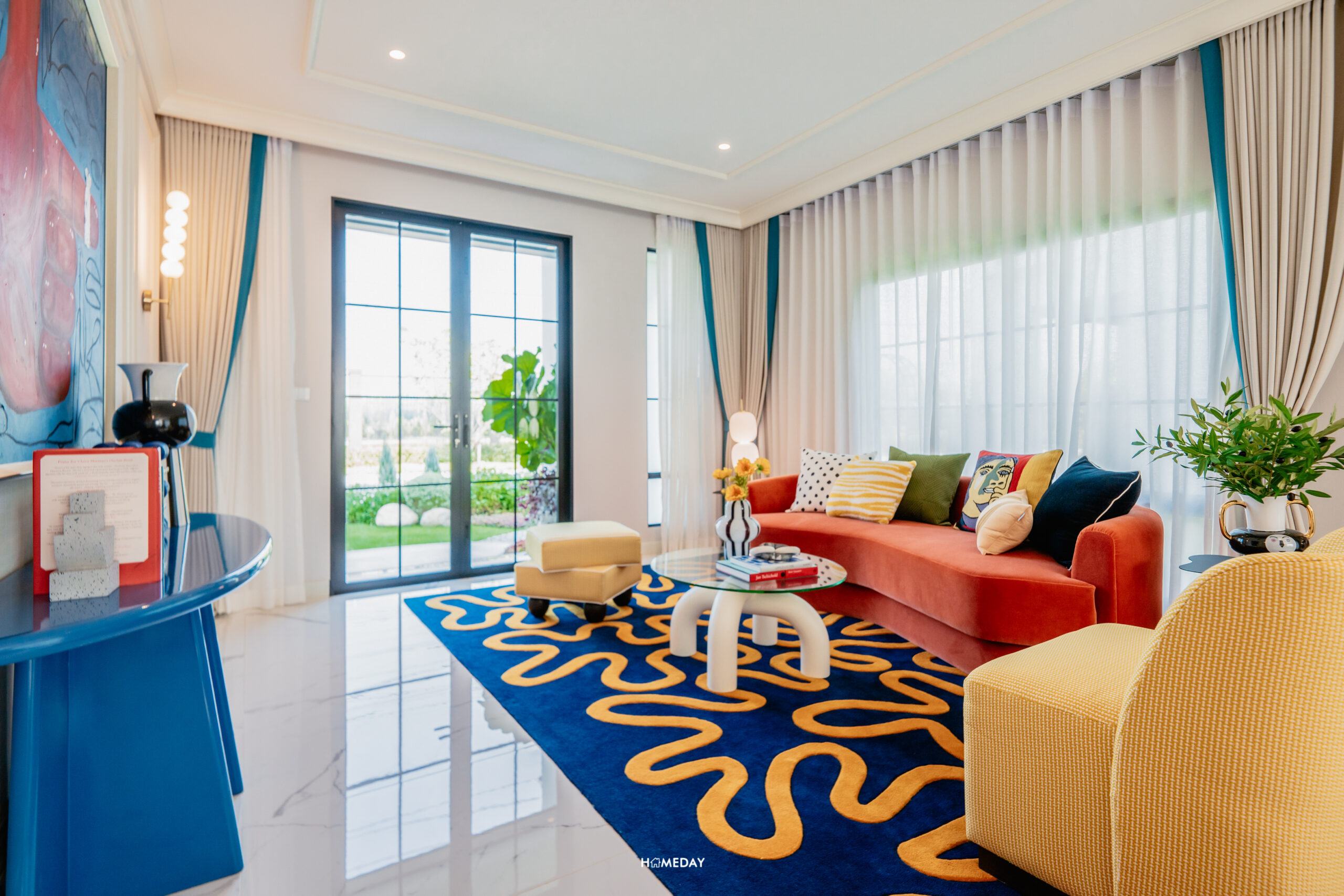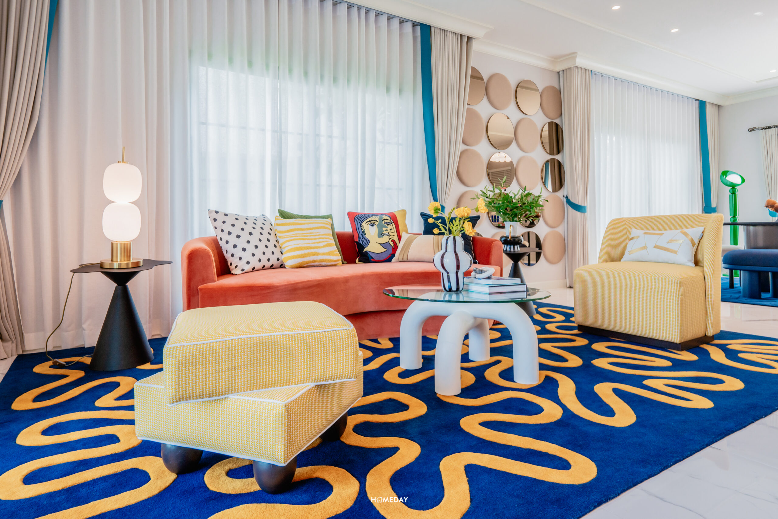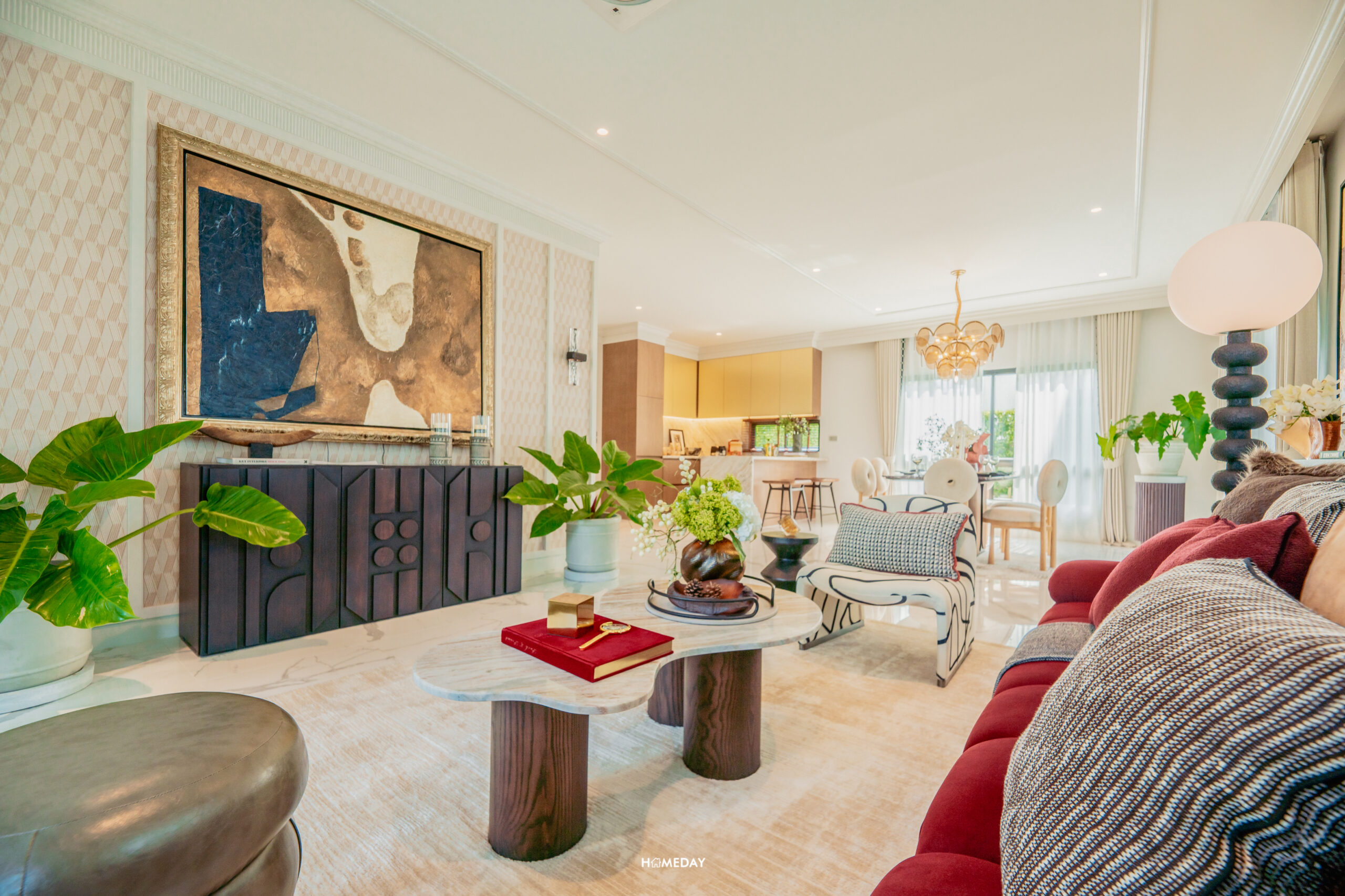 เข้ามาดูในตัวบ้านกันครับ แน่นอนว่าส่วนแรกที่เราเปิดเข้ามาเจอ จะเป็นส่วนของห้องนั่งเล่น ที่มีลักษณะพื้นที่แบบ Open Plan เชื่อมต่อไปยังส่วนรับประทานอาหาร พื้นที่ตรงนี้สามารถวางวางโซฟาขนาด 3-4 ที่นั่งได้กำลังเหมาะครับ อย่างบ้านตัวอย่างก็เพิ่มในส่วนของอาร์มแชร์และม้านั่งเข้าไปด้วย ก็สามารถรองรับการใช้งานได้มากขึ้น