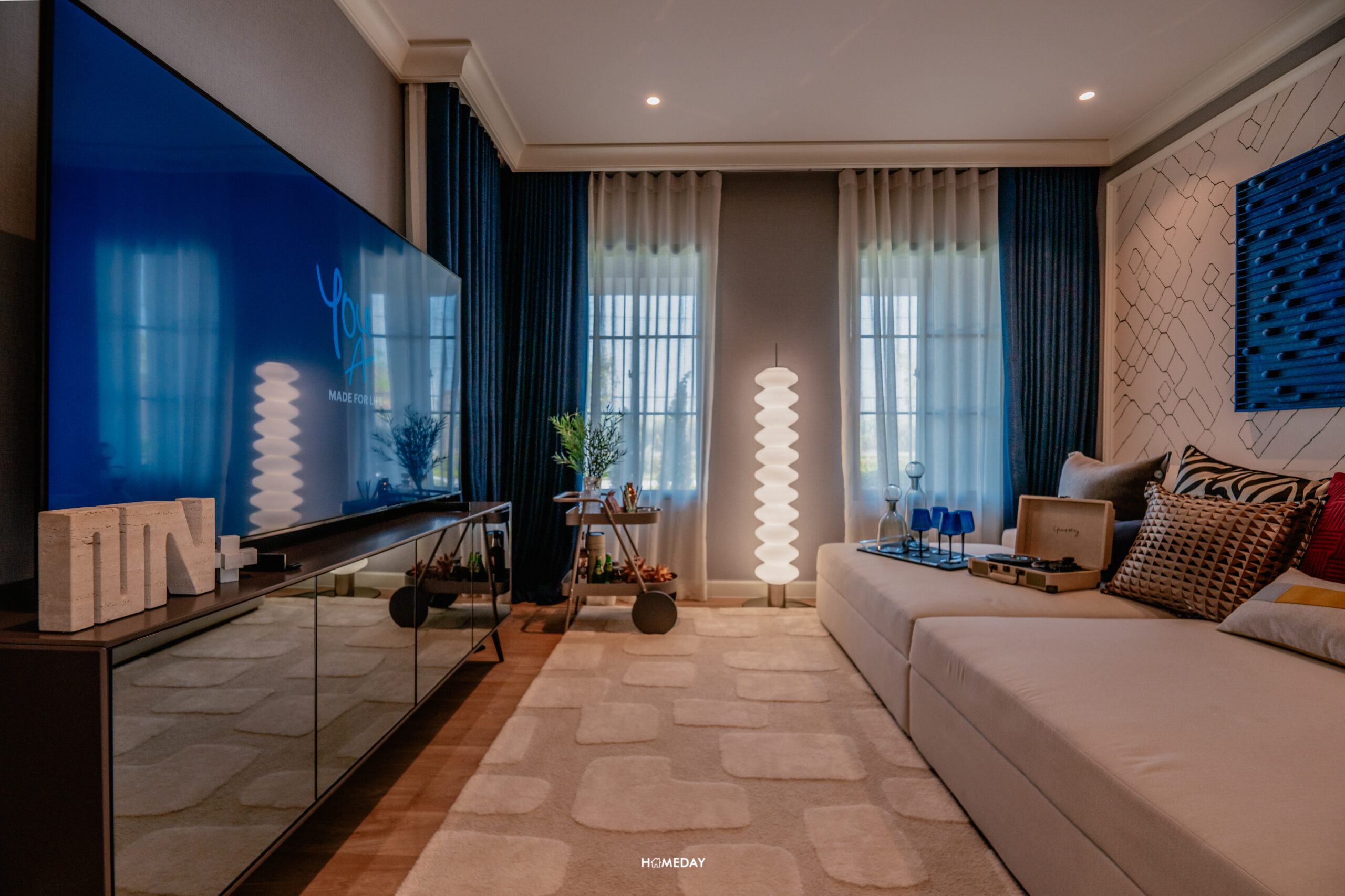หน้ากว้างของพื้นที่บริเวณนี้ยังถือว่าใหญ่อยู่นะครับ สามารถวางโต๊ะกลางหรือโต๊ะกาแฟขนาดใหญ่ได้สบาย ๆ ไม่ติดขัดทางเดินเข้า-ออก สำหรับชั้นวางทีวีก็พร้อมรองรับงานบิลต์อินได้เต็มพื้นที่ หรือจะวางเป็นแบบลอยตัวเหมือนกันกับบ้านตัวอย่างก็สวยงามไปอีกแบบ ทีวีรองรับขนาดใหญ่ได้ครับ ไม่ถือว่าใกล้จอ ระยะห่างถือว่าได้มาตรฐานการรับชมที่เหมาะสมครับ