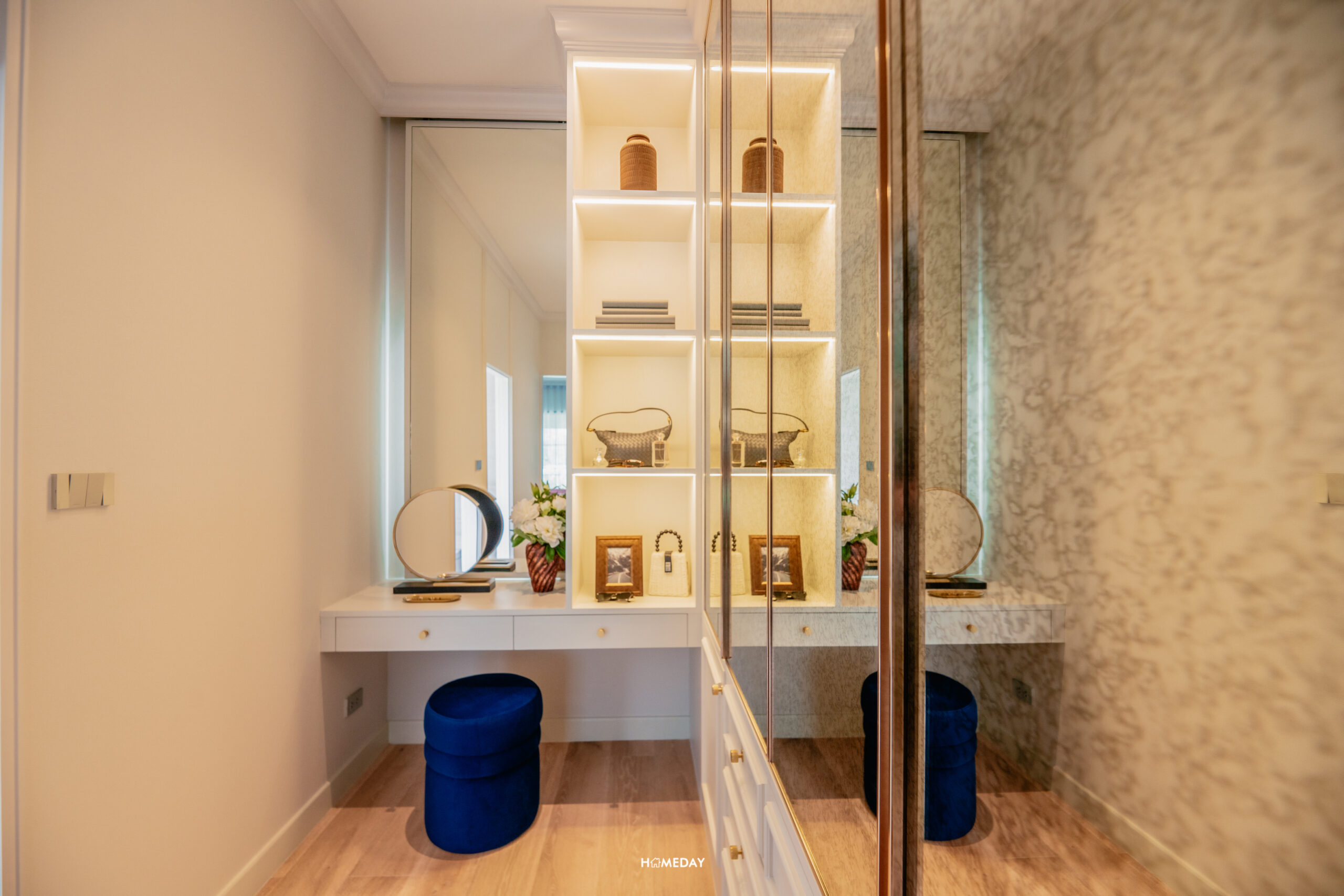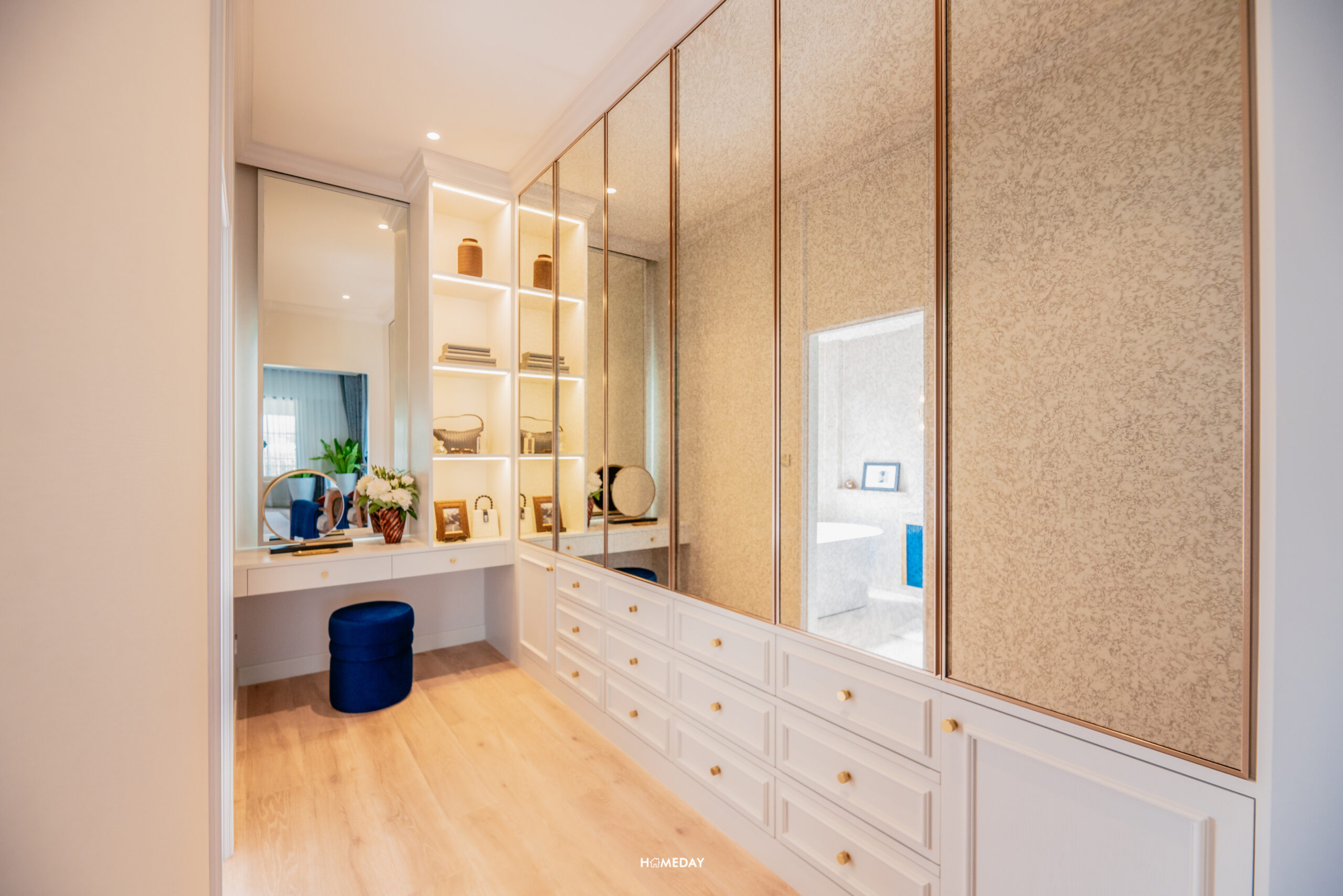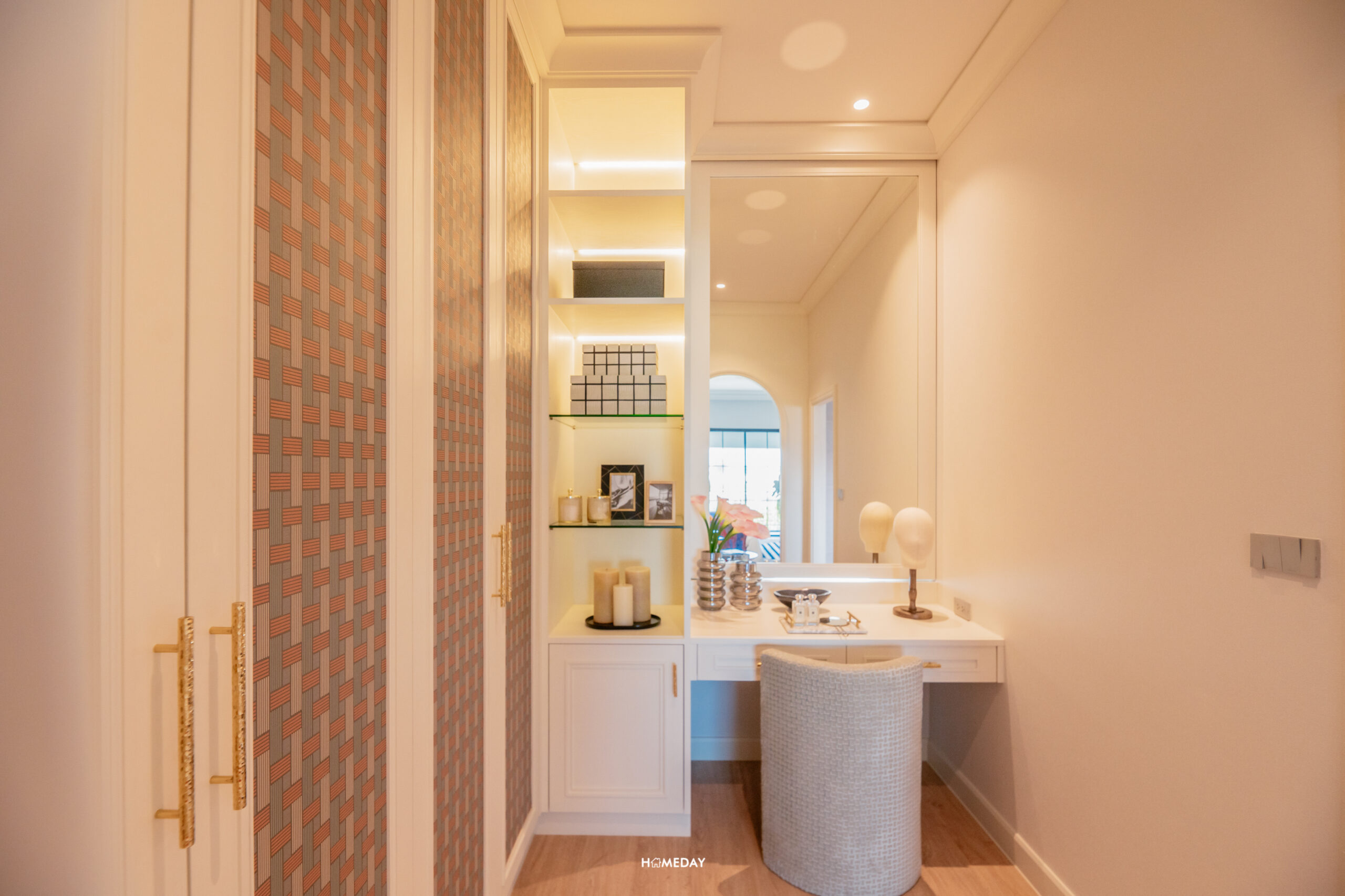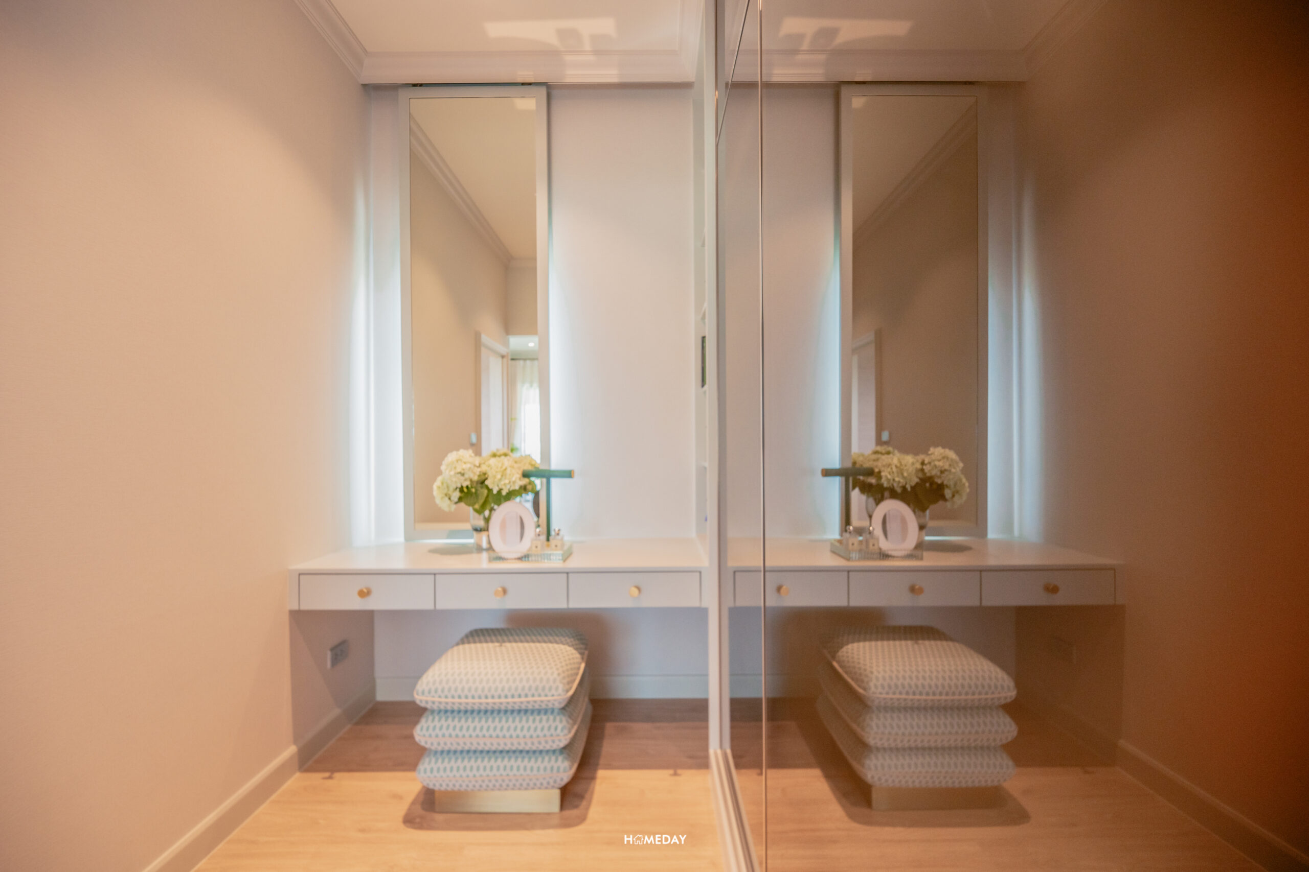 สำหรับมุม Walk-in Closet สามารถบิลต์อินตู้เสื้อผ้าขนาดใหญ่พร้อมโต๊ะเครื่องแป้งได้เลยครับ ฝั่งนี้มีกระจกรับแสงด้านนอกมาให้ด้วยนะครับ แต่บ้านตัวอย่างทางโครงการออกแบบกระจกเงาให้สามารถเลื่อนเข้า-ออกได้ สำหรับใครที่อยู่เป็นคู่ พื้นที่นี้ใช้เก็บชุดเสื้อผ้าสำหรับ 2 ท่านได้เพียงพอแน่นอน