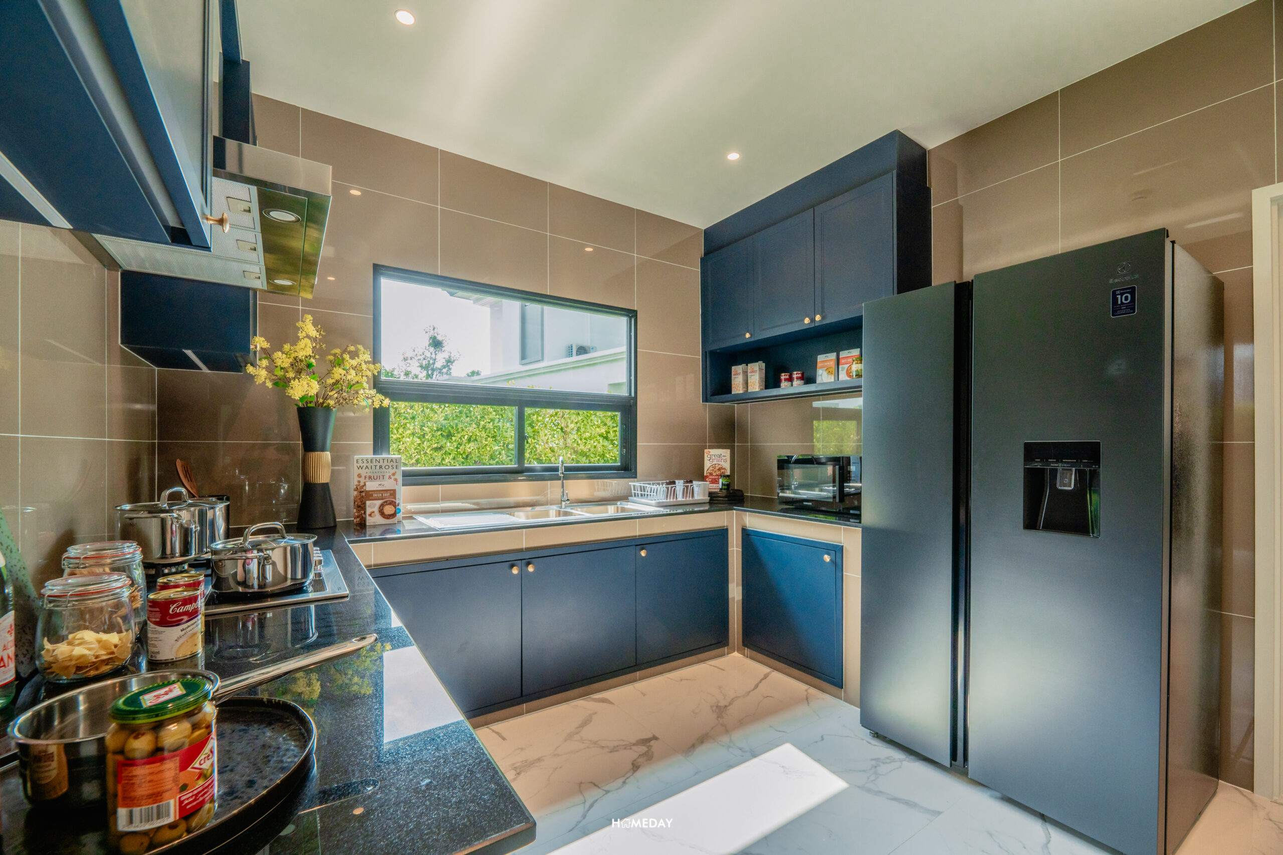 มาดูที่พื้นที่สำหรับเตรียมอาหารกันบ้าง มุมนี้มีบานหน้าต่างมาให้เหมือนเช่นเคยครับ บ้านตัวอย่างออกแบบเคาน์เตอร์ทรงตัว L ขนาดใหญ่ ให้พอได้เห็นขนาดพื้นที่ใช้สอย บ้านจริงมุมนี้ใส่ตู้เย็น เตาไฟฟ้า เตาอบต่าง ๆ ได้สบายครับ เอาไว้เป็นมุมทำอาหารเช้า อบขนม จะชงกาแฟก็เหมาะ หรือจะออกแบบเป็นฟังก์ชันอื่นก็ปรับตามไลฟ์สไตล์ของเราได้เลย ด้านหลังจะเป็นครัวปิดของตัวบ้านนะครับ ทางโครงการบิลต์อินเคาน์เตอร์ครัวพร้อมบานตู้เก็บของมาให้เหมือนเช่นเคย ขนาดเพียงพอให้วางเครื่องซักผ้าเครื่องอบผ้าในตัวได้ และมีประตูเชื่อมสวนที่อยู่ติดกับโซนของแม่บ้านอีกทีหนึ่งครับ