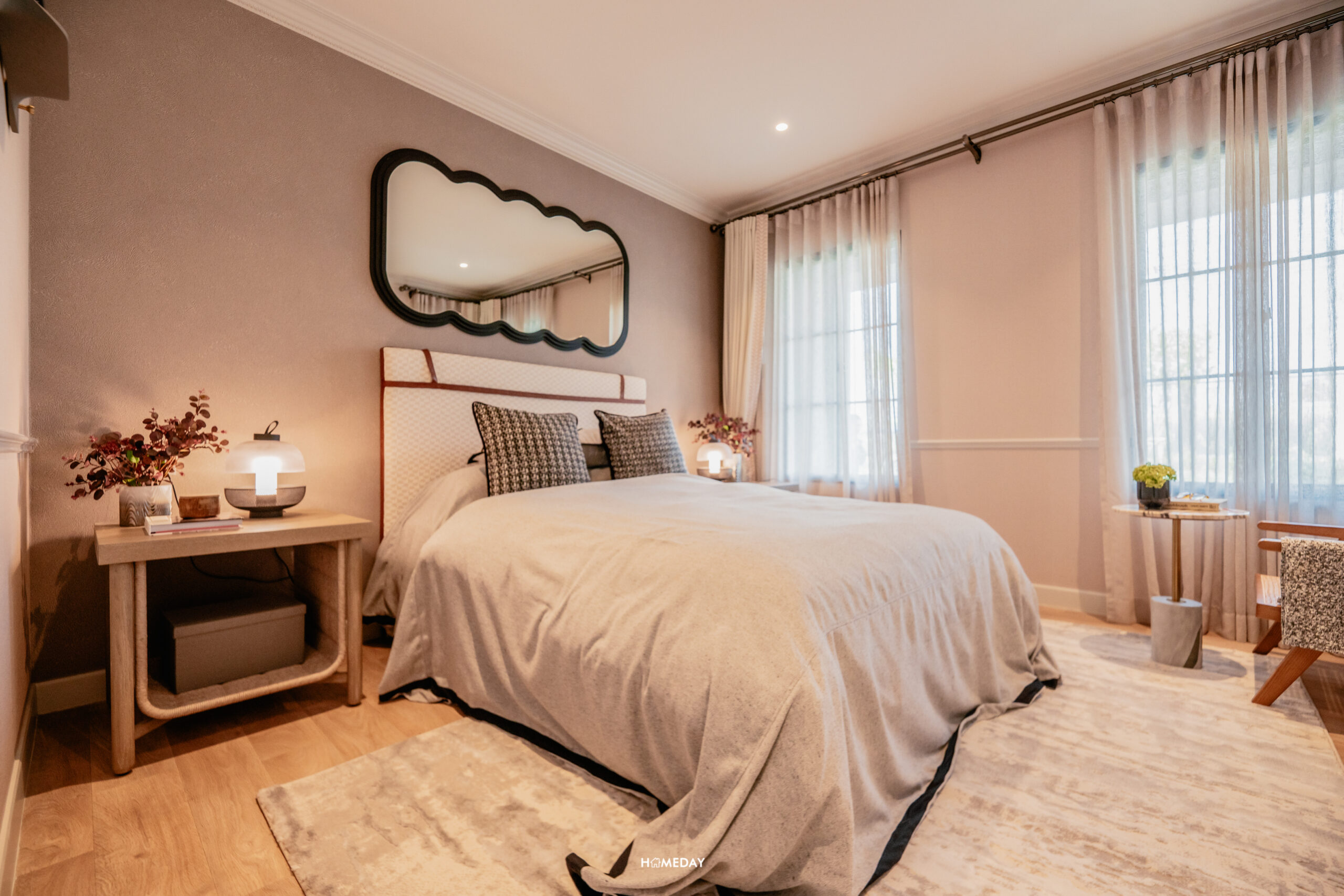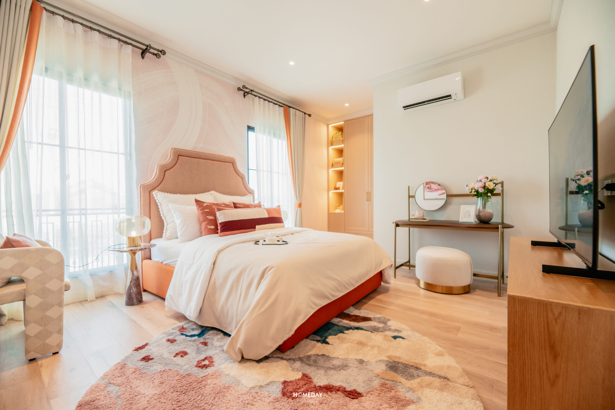 จะวางเป็นเตียง 6 ฟุตก็รองรับได้ แต่ถ้าอยากได้พื้นที่ใช้สอยอื่น ๆ เพิ่มเติมก็สามารถปรับลดขนาดของเตียงลงมาได้อีกครับ อย่างบ้านตัวอย่างห้องนี้ทางโครงการก็วางเป็นเตียงใหญ่เอาไว้ให้เราดูเป็นไอเดีย ผนังฝั่งหัวเตียงทั้งสองฝั่งได้บานหน้าต่างเข้ามุมกันพอดี วางโต๊ะหัวเตียงเพิ่มได้ทั้งสองฝั่งครับ พื้นที่ปลายเตียงของห้องนี้ค่อนข้างกว้าง ทำเป็นโต๊ะอเนกประสงค์ตัวยาวที่รองรับฟังก์ชันโต๊ะเครื่องแป้ง, โต๊ะทำงาน และแขวนทีวีได้ในตัว จะวางม้านั่งปลายเตียงเพิ่มก็ยังได้ครับ