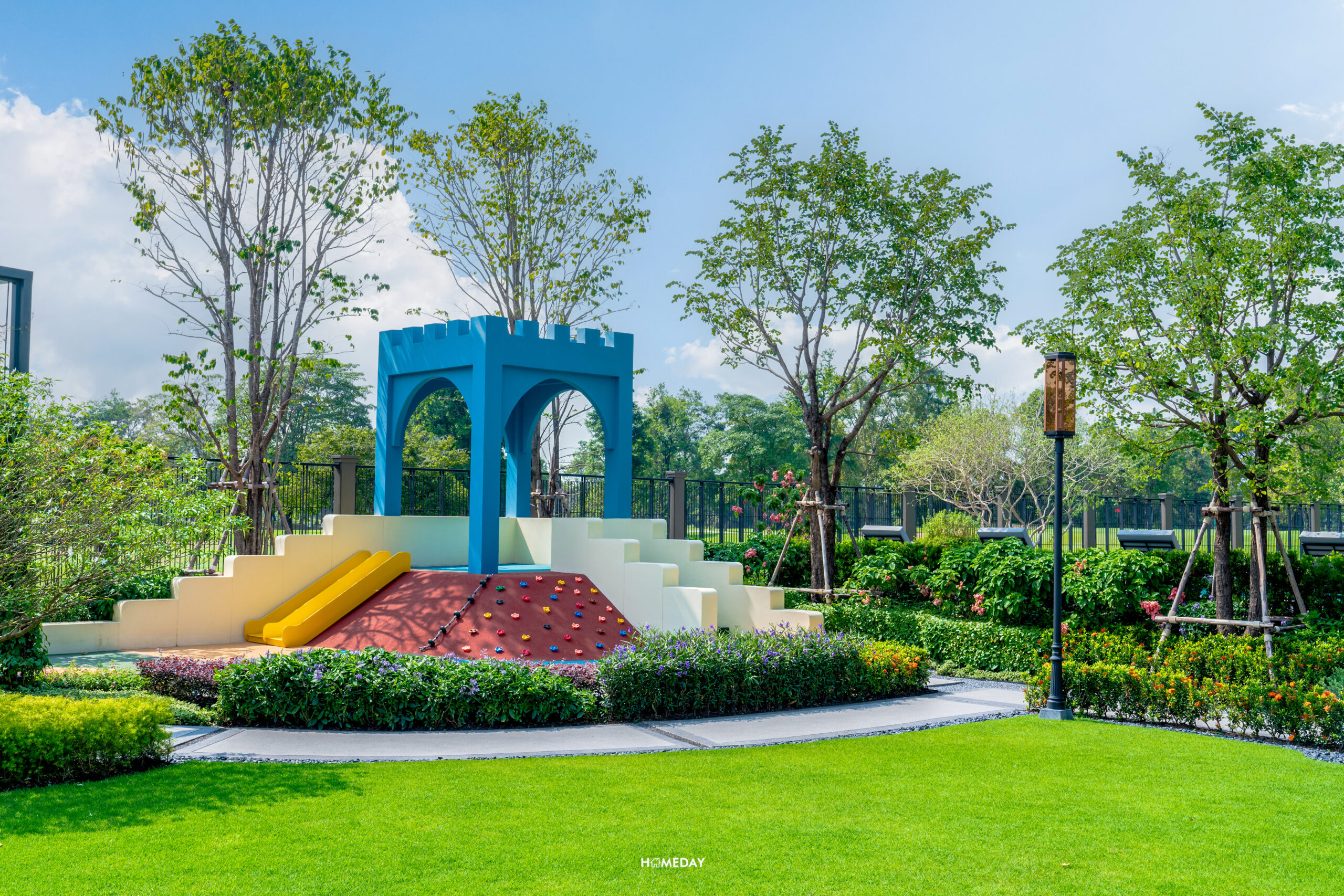 มาดูต่อกันที่สวนส่วนกลางร่มรื่นบนพื้นที่ขนาดใหญ่กันบ้าง จุดแรกติดกับสระว่ายน้ำคือ Educational Playground สนามเด็กเล่นเสริมพัฒนาการ ที่ออกแบบมาให้เด็ก ๆ สามารถเล่นได้อย่างปลอดภัยครับ