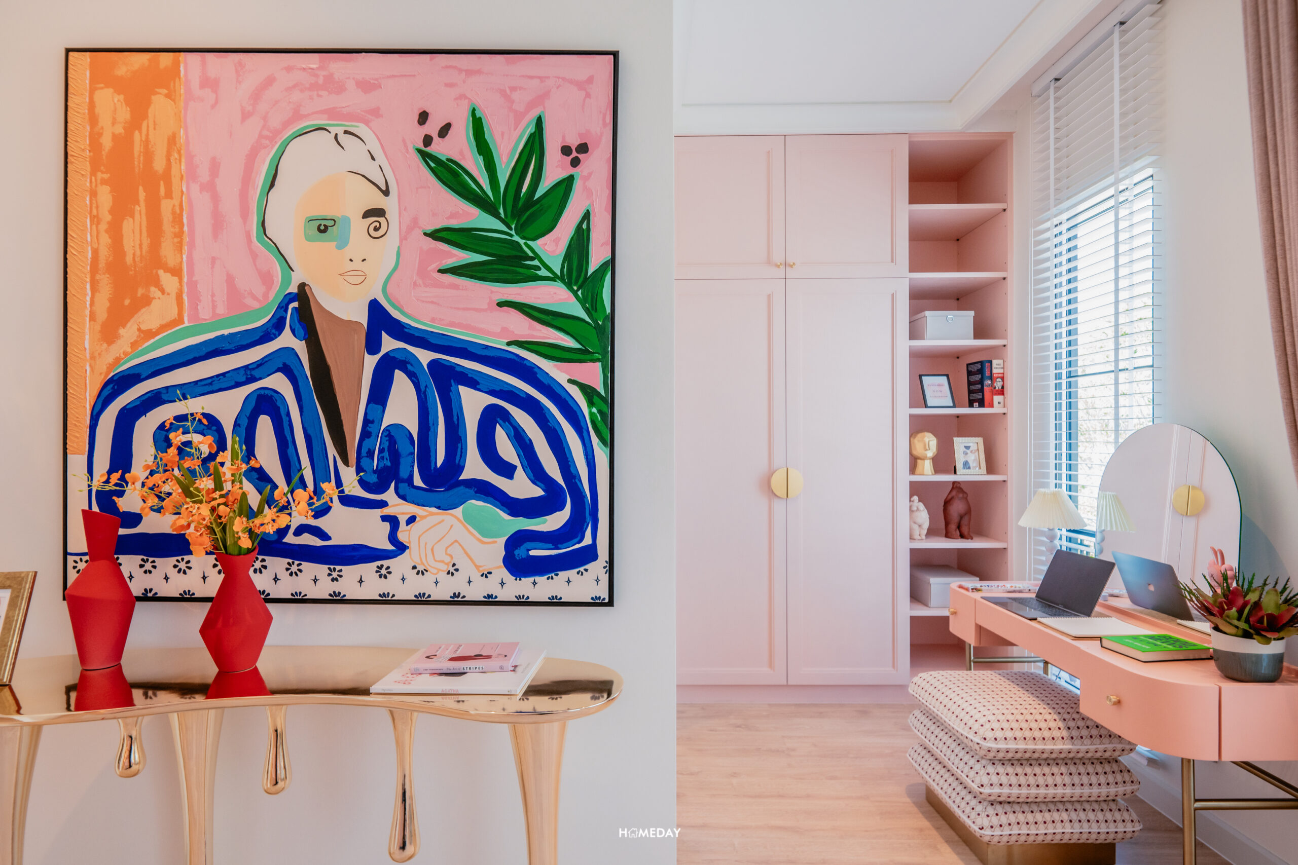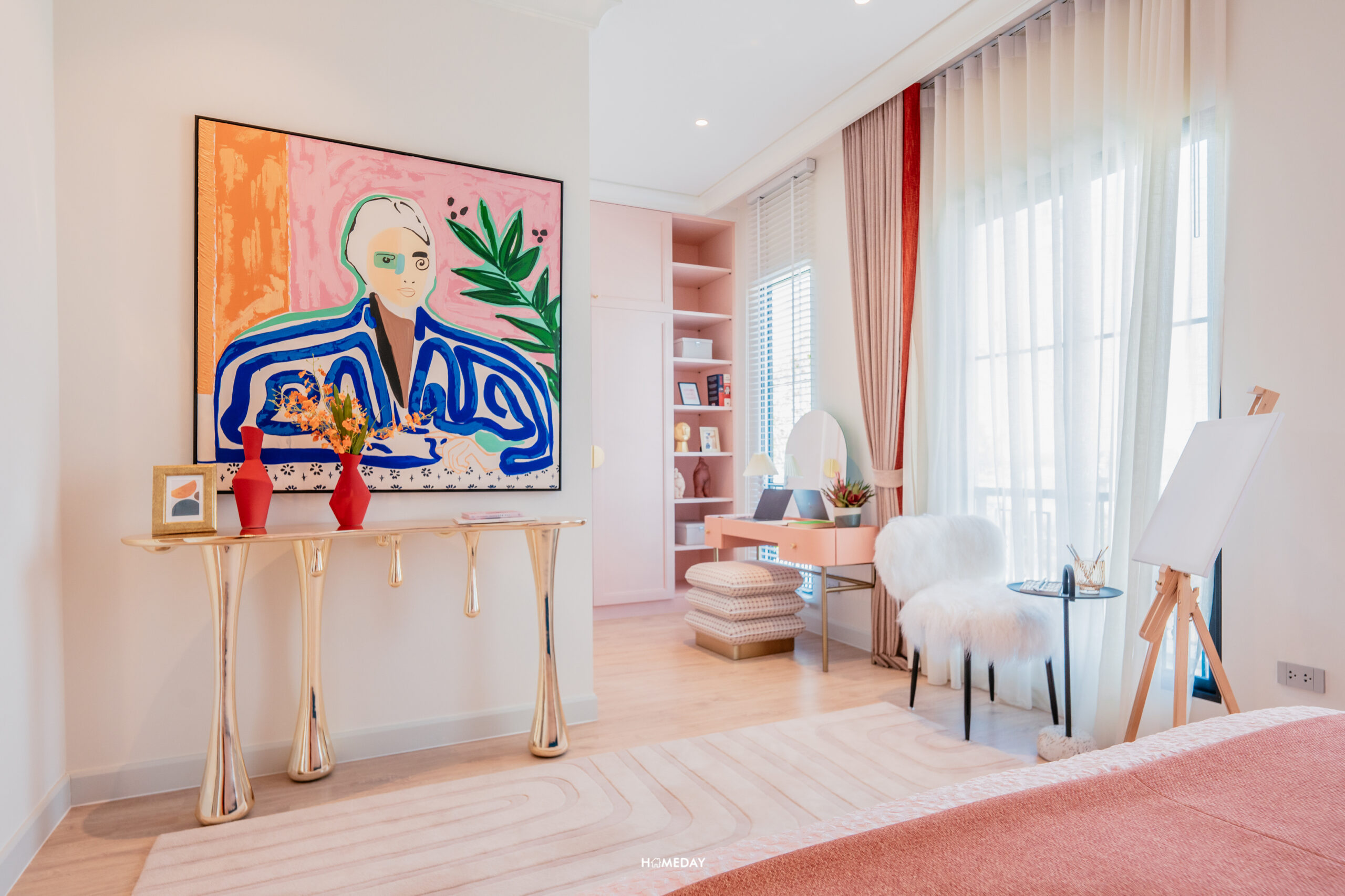 ซ้ายมือจากทางเข้า พื้นที่ฝั่งปลายเตียง จะเป็นโซนที่เชื่อมไปยัง Walk-in Closet และห้องน้ำ มีพื้นที่เหลือกว้างให้สามารถใส่ฟังก์ชันเพิ่มเติมอื่น ๆ ได้เลยครับ อย่างห้องนี้บ้านตัวอย่างทำเป็นมุมนั่งวาดรูป มีชั้นวางของและงานศิลปะอยู่ที่บริเวณทางเข้าฝั่งผนังห้องน้ำ สวยงามลงตัว พื้นที่ด้านหน้าห้องน้ำรองรับ Walk-in Closet และโต๊ะเครื่องแป้งได้ขนาดพอดีสำหรับ 1 ท่าน มีช่องแสงรอบห้อง ได้บรรยากาศที่โปร่งสบายทีเดียวครับ