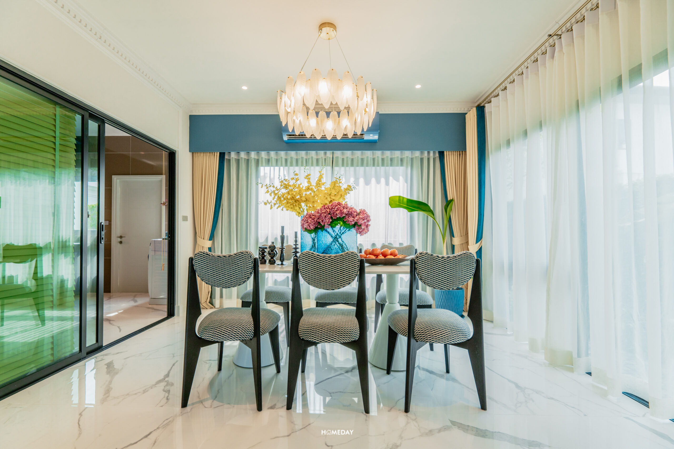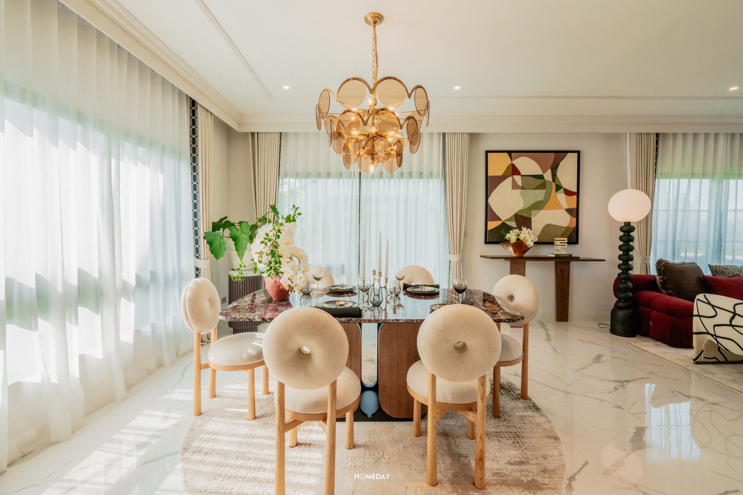ถัดเข้ามาในส่วนของพื้นที่วางโต๊ะรับประทานอาหาร บ้านตัวอย่างตกแต่งให้ดูเป็นโต๊ะทรงโค้งมนพร้อมด้วยเก้าอี้ 6 ที่นั่ง จะเห็นได้เลยว่าพื้นที่รอบข้างยังเหลืออยู่พอสมควรเลยครับ ถ้ามีสมาชิกเยอะ หรือจัดปาร์ตี้บ่อย ๆ เพิ่มเป็น 8 ที่นั่งก็ยังเหลือพื้นที่ให้เลื่อนเก้าอี้เข้า-ออกได้สบายคล่องตัว พื้นที่ผนังฝั่งเดียวกับโซฟาเหลือให้เราตกแต่งประดับต้นไม้เพิ่มเติมได้ จะใส่เป็นชั้นหรือตู้โชว์ก็เหมาะลงตัวครับ บริเวณนี้มีประตูกระจกสไลด์เปิดออกไปเชื่อมยังบริเวณสวนข้างบ้านได้ด้วย