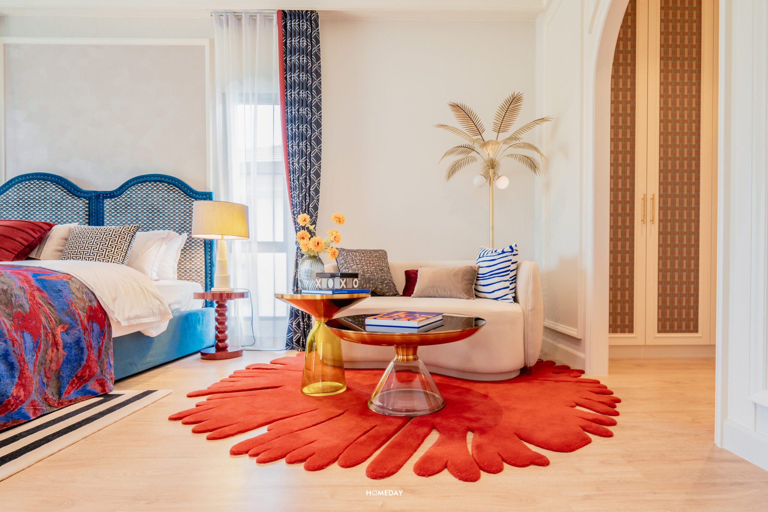 พื้นที่ฝั่งขวามือส่วนหน้าบ้านจะเป็นพื้นที่เชื่อมระเบียงที่ออกแบบไว้ให้สำหรับวางเตียงครับ แน่นอนว่าเตียง 6 ฟุตรองรับได้สบาย ๆ อยู่แล้วครับสำหรับห้องนี้ พื้นที่ด้านข้างหัวเตียงทั้ง 2 ฝั่ง บ้านตัวอย่างวางเป็นโต๊ะหัวเตียงขนาดใหญ่เอาไว้ ห้องจริงเราอาจจะปรับเป็นพื้นที่สำหรับติดตั้งชั้นหรือตู้เก็บของเพิ่มเติมก็ได้เลยครับ