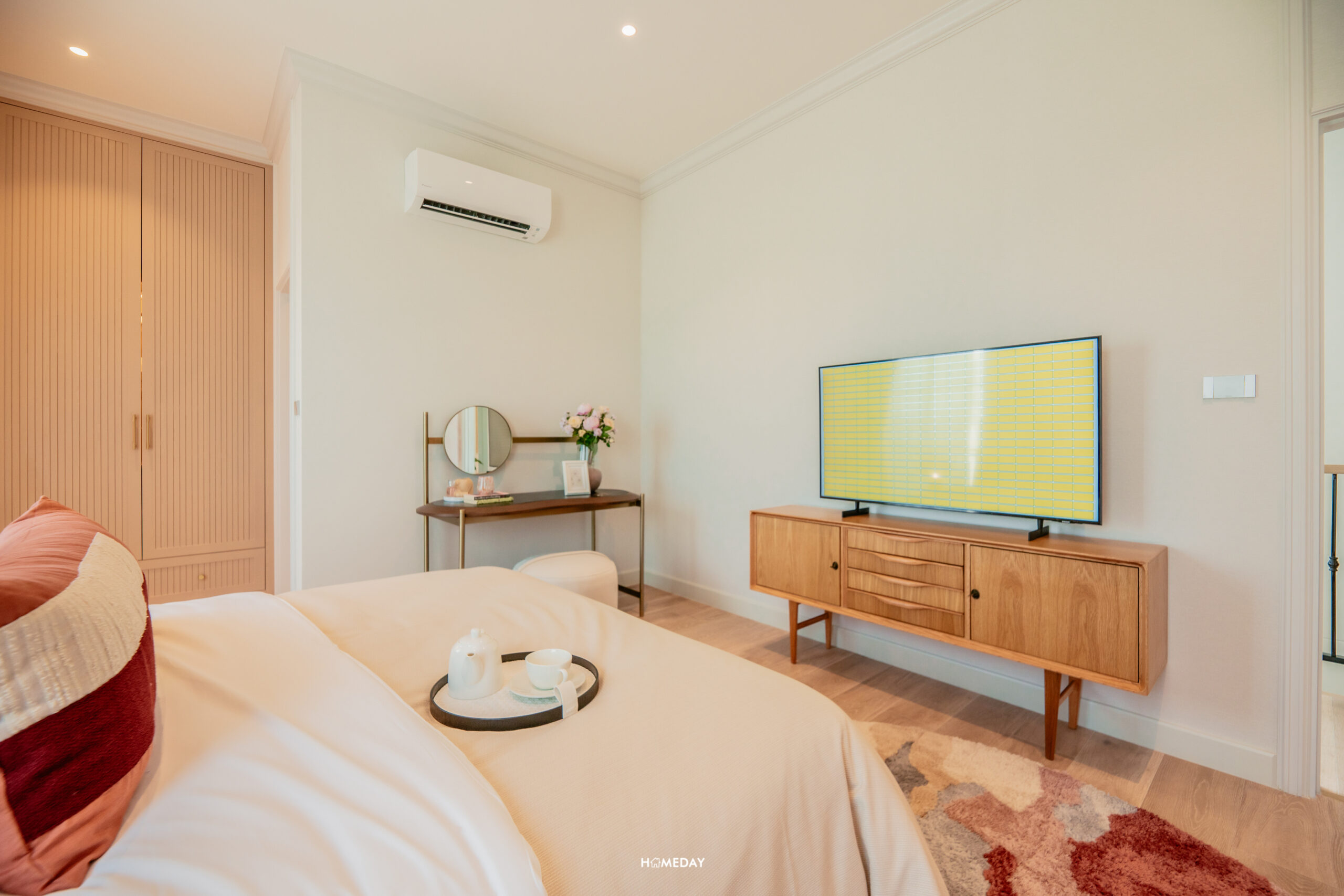 พื้นที่ปลายเตียงสามารถวางม้านั่งพร้อมชั้นทีวีได้เลย หรือใครจะปรับเป็นโต๊ะทำงานก็ได้เหมือนกันครับ บ้านตัวอย่างไม่ได้ใส่ฟังก์ชันให้ดูแน่นจนเกินไป เพื่อให้เห็นความโฟลว์ของห้องที่ดูสบาย ๆ มีการประดับต้นไม้เอาไว้ให้ดูด้วย ใครชอบปลูกต้นไม้หรืออยากได้บรรยากาศสบายตาก็นำมาตกแต่งได้เช่นเดียวกันครับ