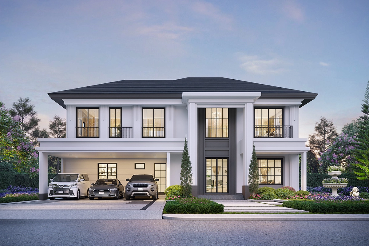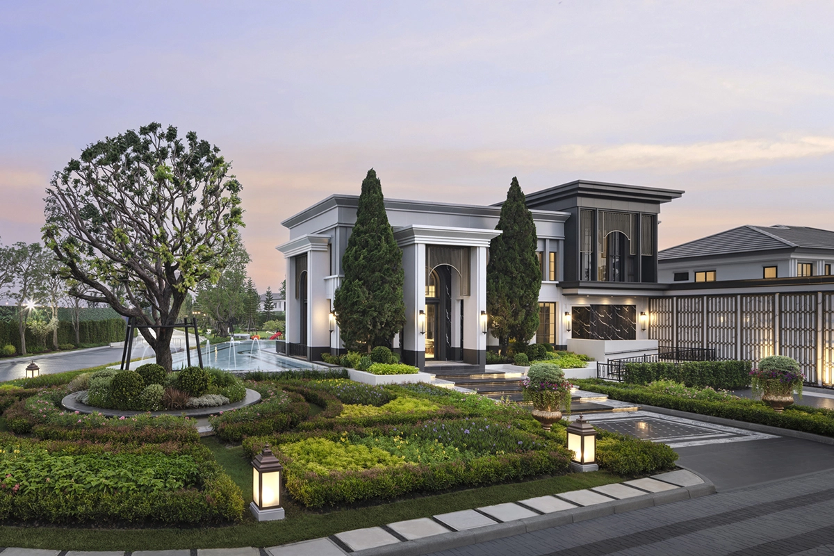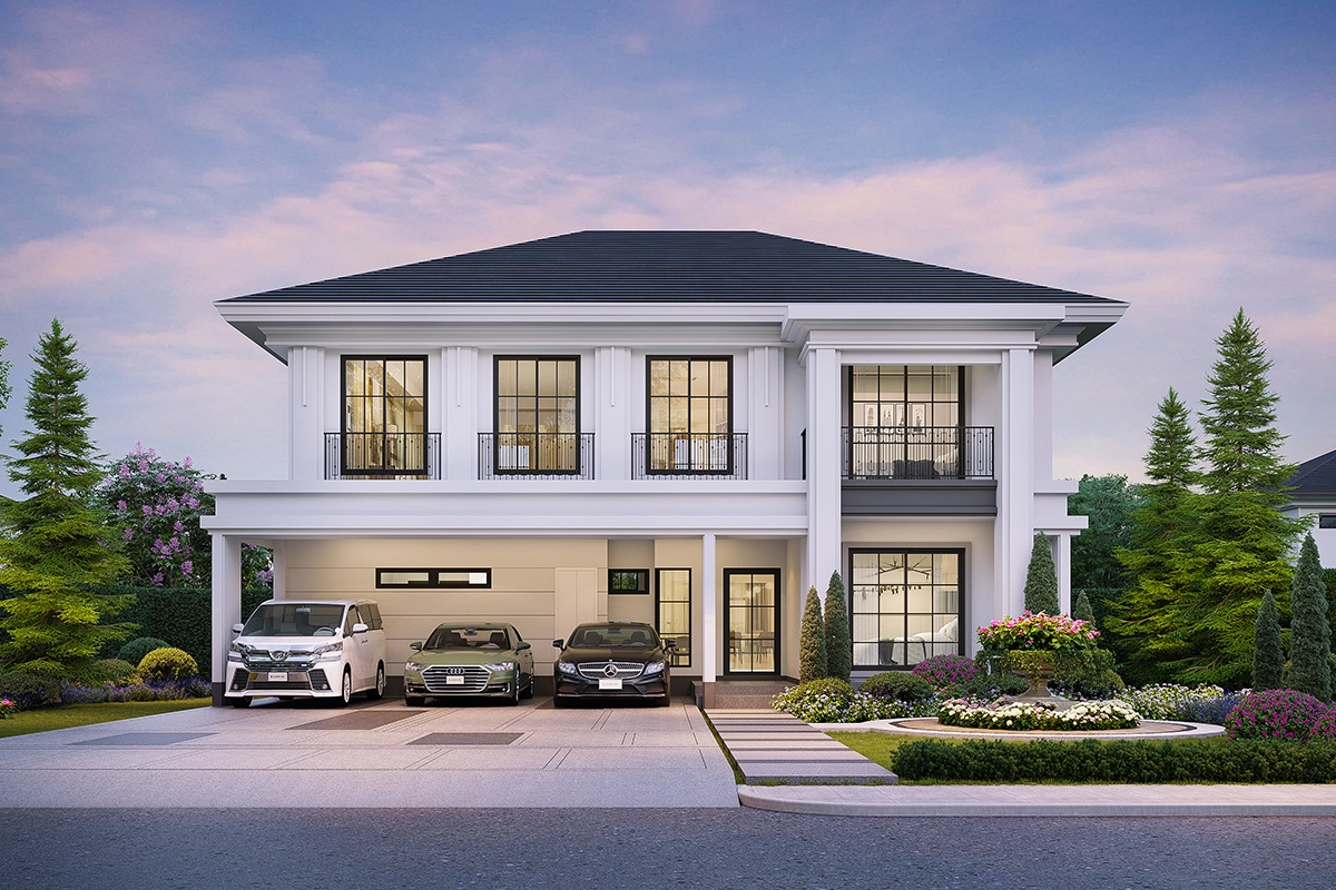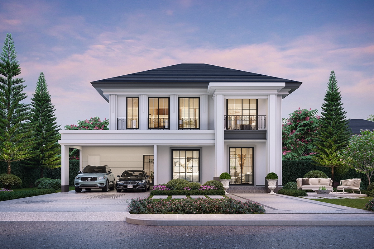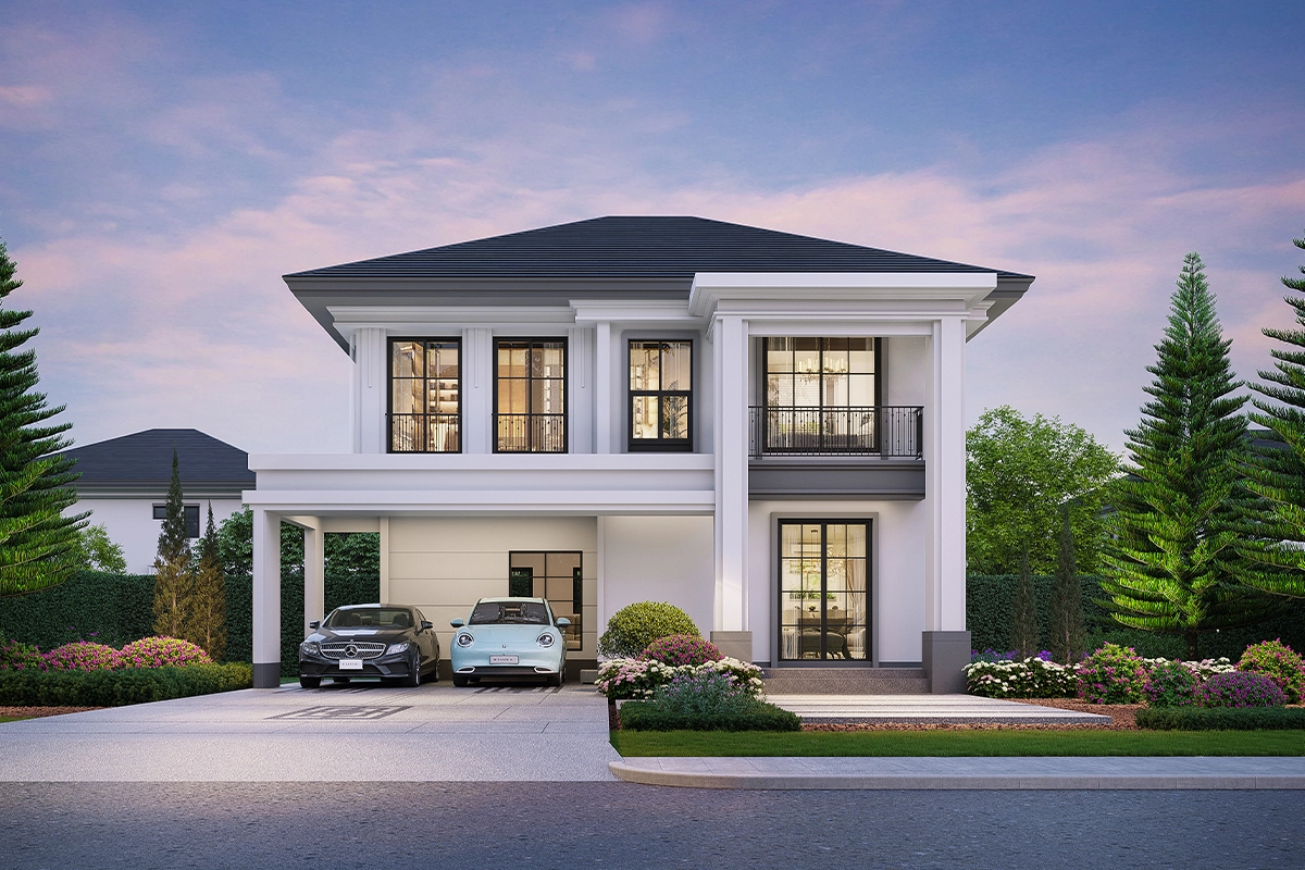แบบบ้าน แบบบ้าน : Type C (Vivace) ที่ดินเริ่มต้น 61.3 ตร.วา พื้นที่ใช้สอย 243 ตร.ม. 4 ห้องนอน 4 ห้องน้ำ 1 ห้องรับแขก 1 ห้องแม่บ้าน 1 ห้องครัวและพื้นที่จัดเตรียมอาหาร 2 ที่จอดรถ