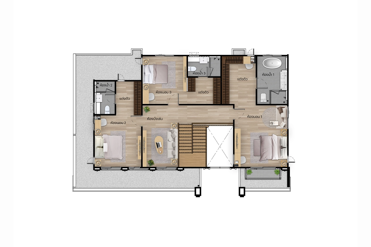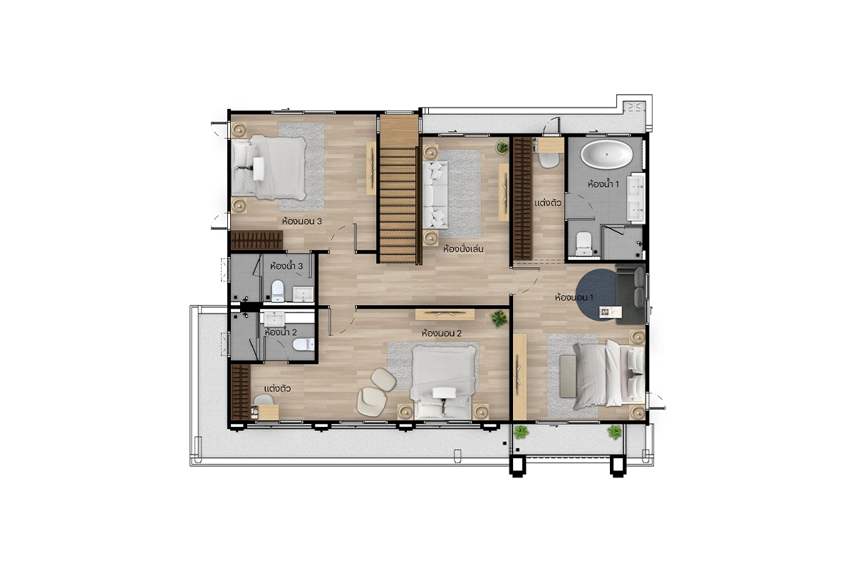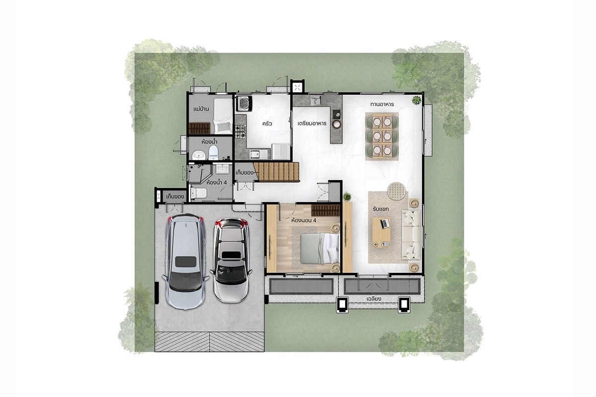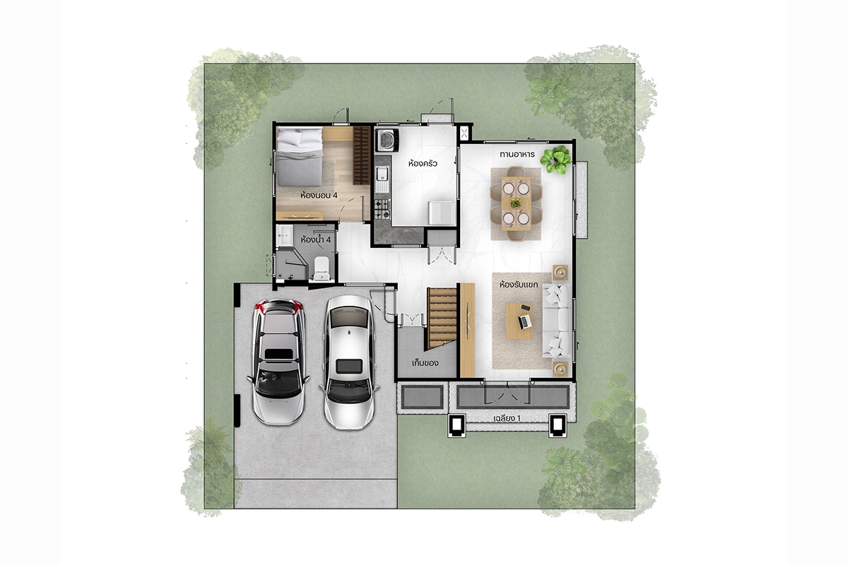 แบบบ้าน แบบบ้าน : Type C (Vivace) ที่ดินเริ่มต้น 61.3 ตร.วา พื้นที่ใช้สอย 243 ตร.ม. 4 ห้องนอน 4 ห้องน้ำ 1 ห้องรับแขก 1 ห้องแม่บ้าน 1 ห้องครัวและพื้นที่จัดเตรียมอาหาร 2 ที่จอดรถ