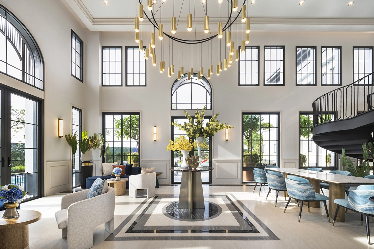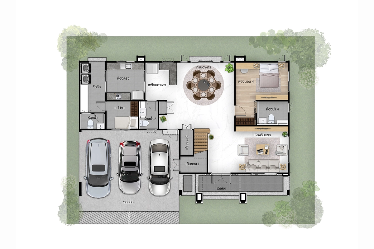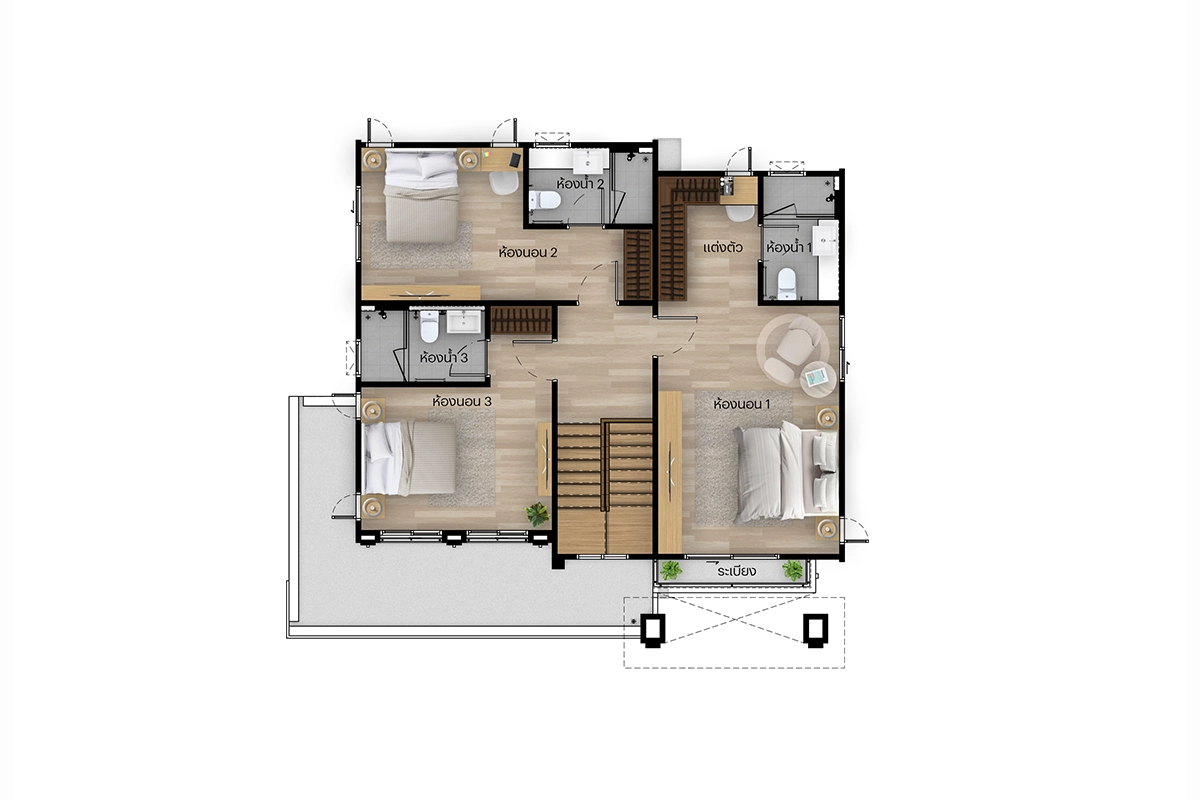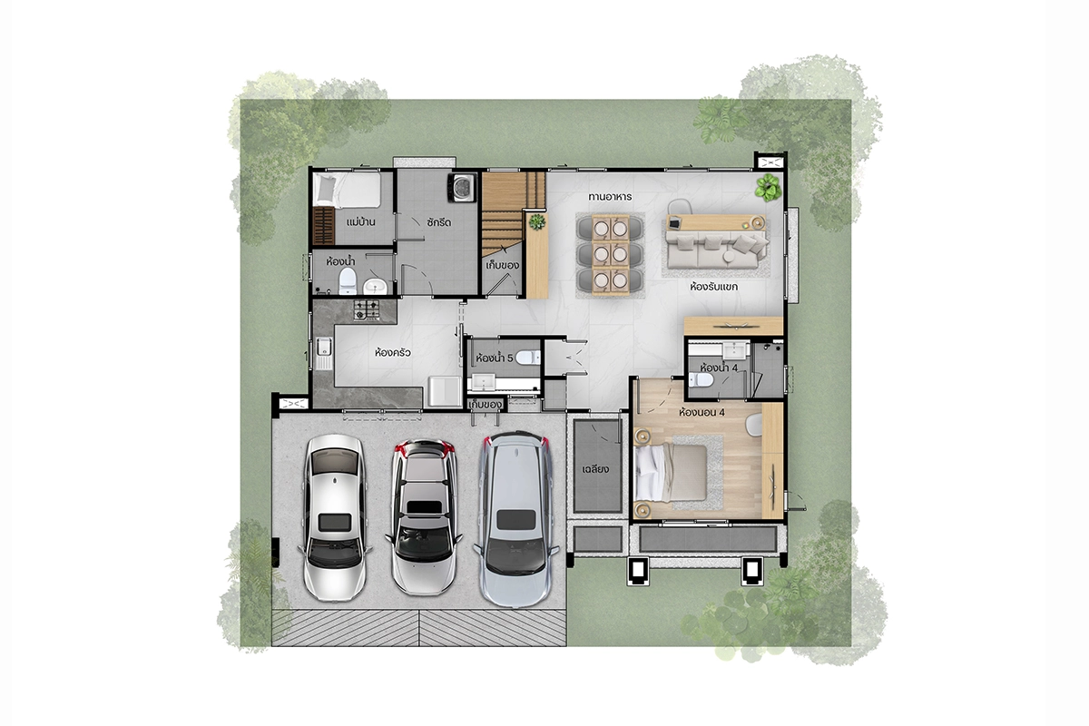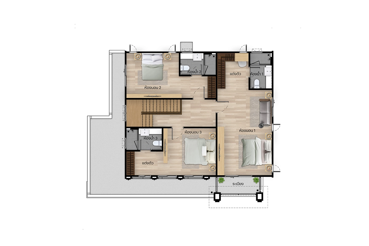 แบบบ้าน แบบบ้าน : Type C (Vivace) ที่ดินเริ่มต้น 61.3 ตร.วา พื้นที่ใช้สอย 243 ตร.ม. 4 ห้องนอน 4 ห้องน้ำ 1 ห้องรับแขก 1 ห้องแม่บ้าน 1 ห้องครัวและพื้นที่จัดเตรียมอาหาร 2 ที่จอดรถ