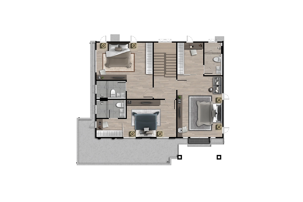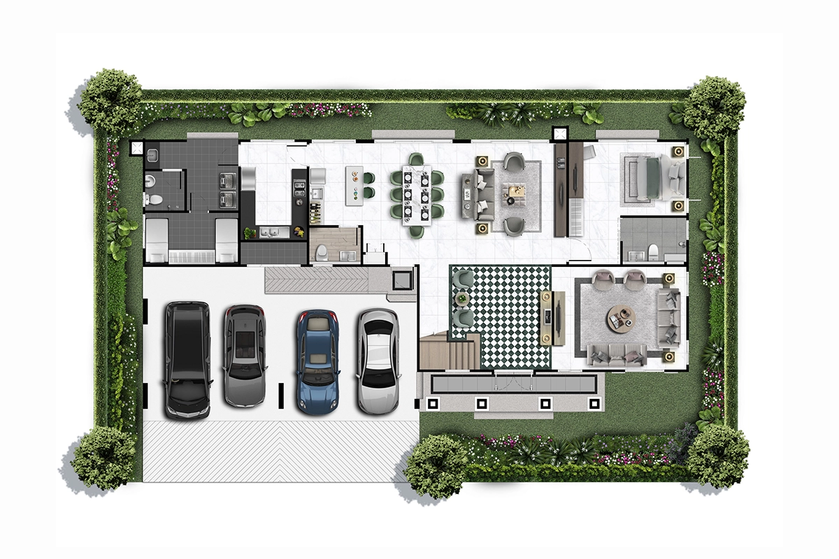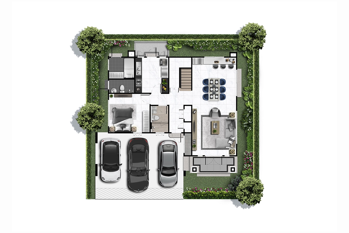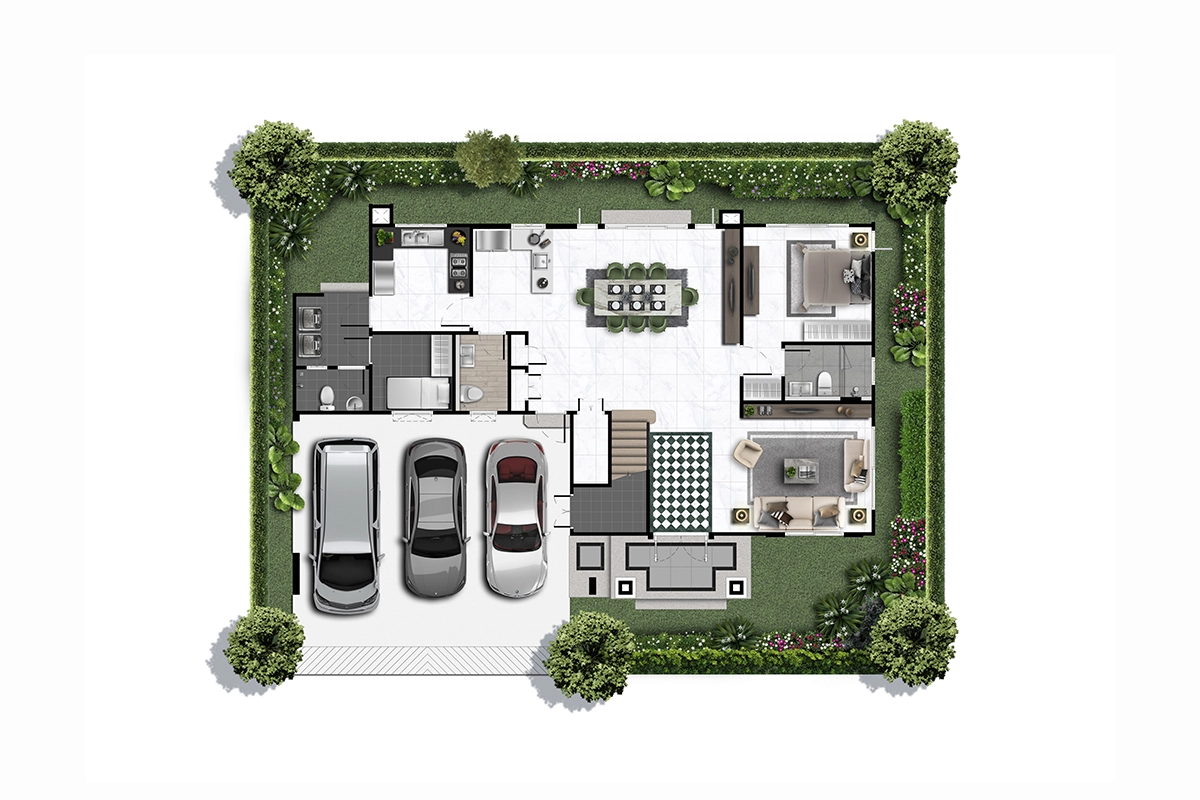 พื้นที่ใช้สอย 308 ตร.ม. 4 ห้องนอน 5 ห้องน้ำ ห้องครัว มุมพักผ่อนด้านบน 1 ห้องรับแขก ห้องแม่บ้าน ที่จอดรถ 3 คัน