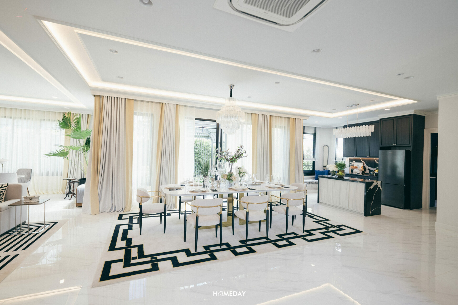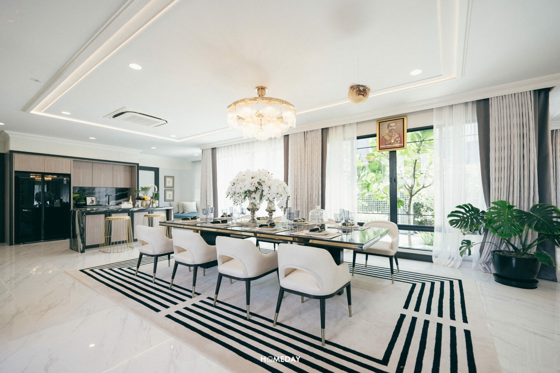 ถัดเข้ามาจากโถงต้อนรับ จะเจอกับพื้นที่ Open Space หน้ากว้างขนาดใหญ่อีกเช่นเคย แบบบ้านนี้ทางโครงการวางชุดโต๊ะรับประทานอาหารให้ดูเป็นแบบ 8 ที่นั่ง รับวิวสวนหลังบ้านจากมุมนี้ได้เลยครับ ซ้ายมือจะเป็นพื้นที่ Living Room ส่วนทางขวาตกแต่งให้ดูเป็น Pantry ครับ