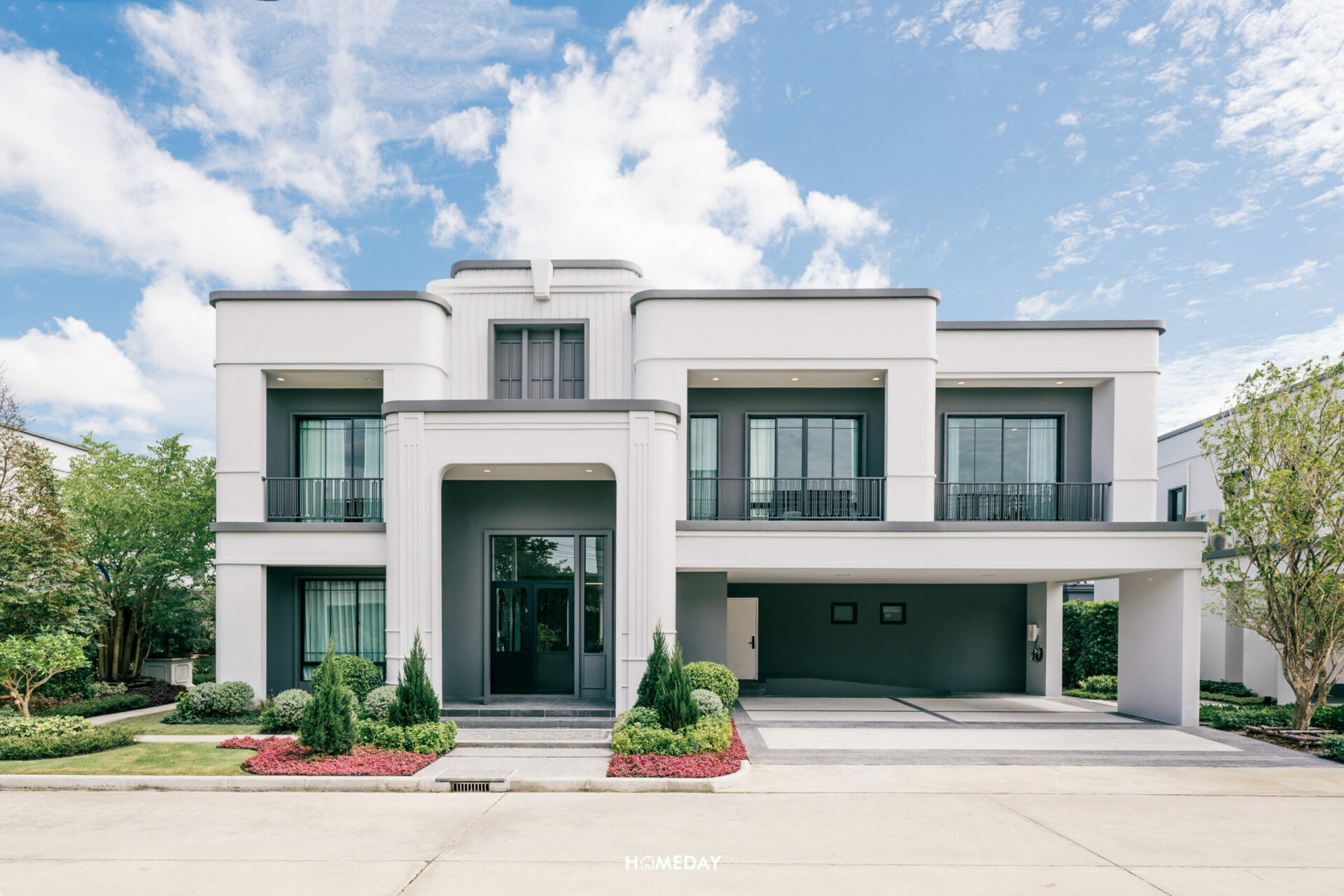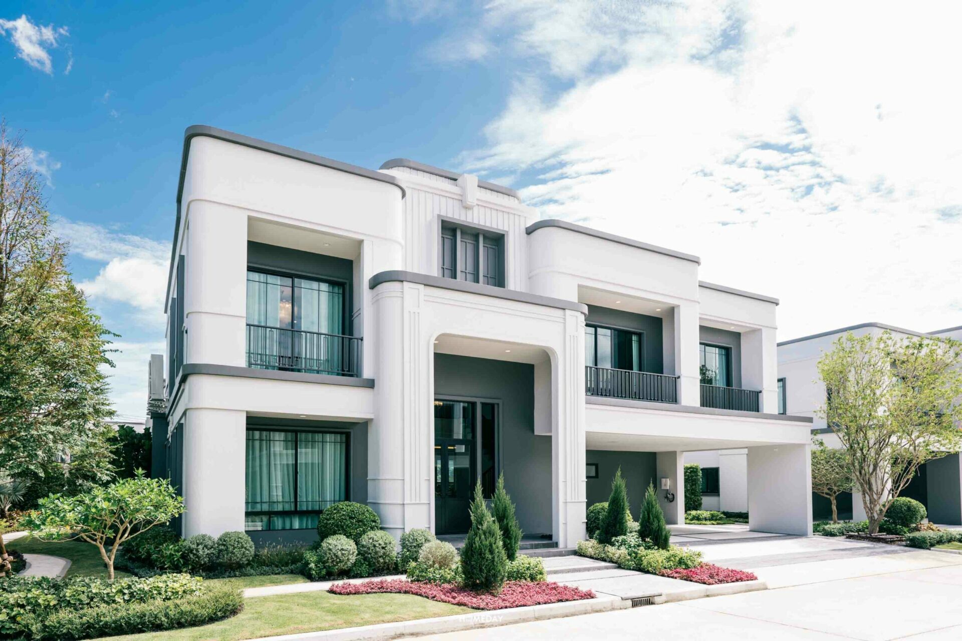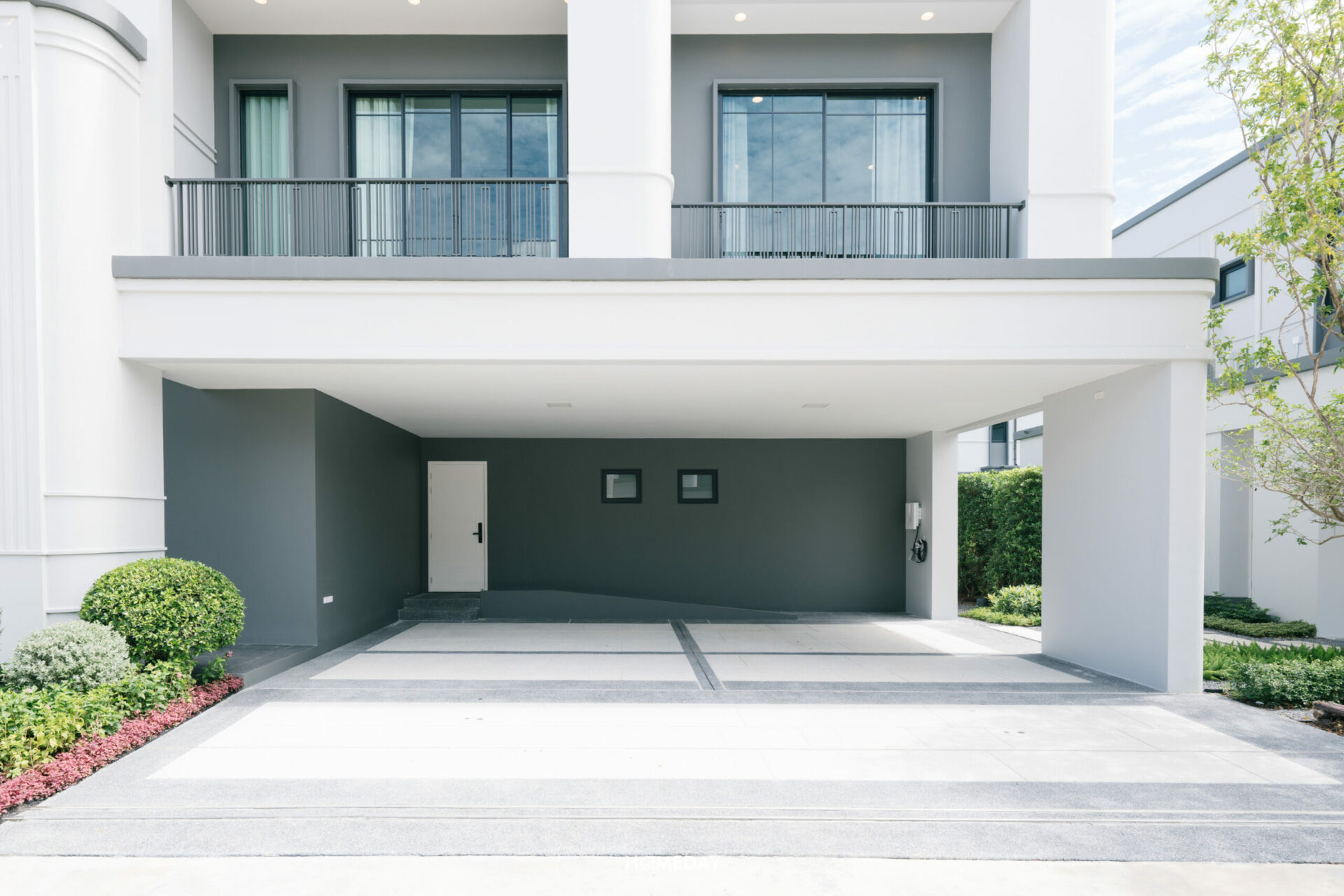 มาดูแบบบ้านขนาดรองลงมาอย่าง René 03 กันต่อเลยครับ แบบบ้านนี้ก็ขนาดใหญ่ไม่แพ้กัน มาเริ่มต้นสำรวจจากพื้นที่หน้าบ้านกันก่อนเลย