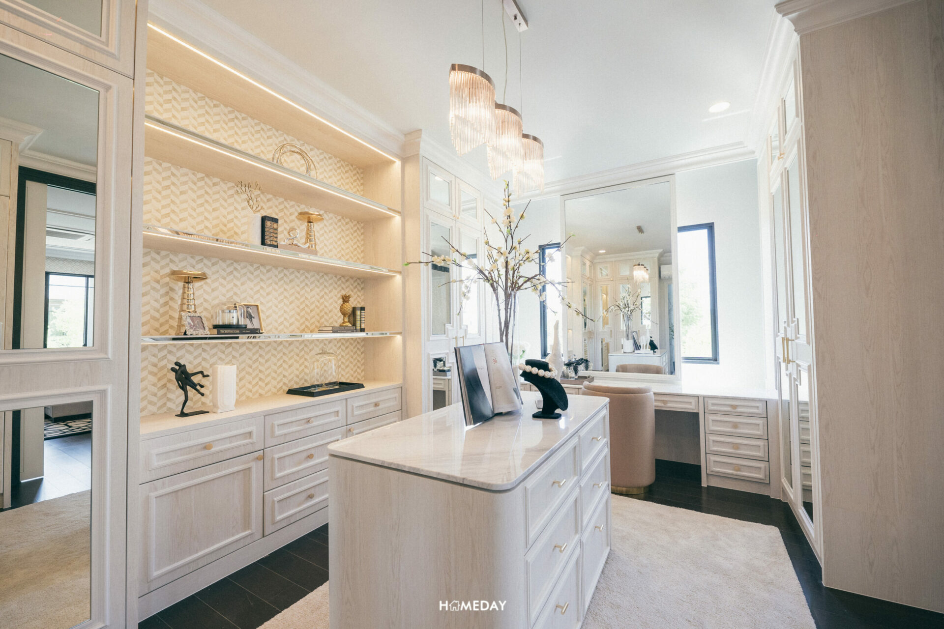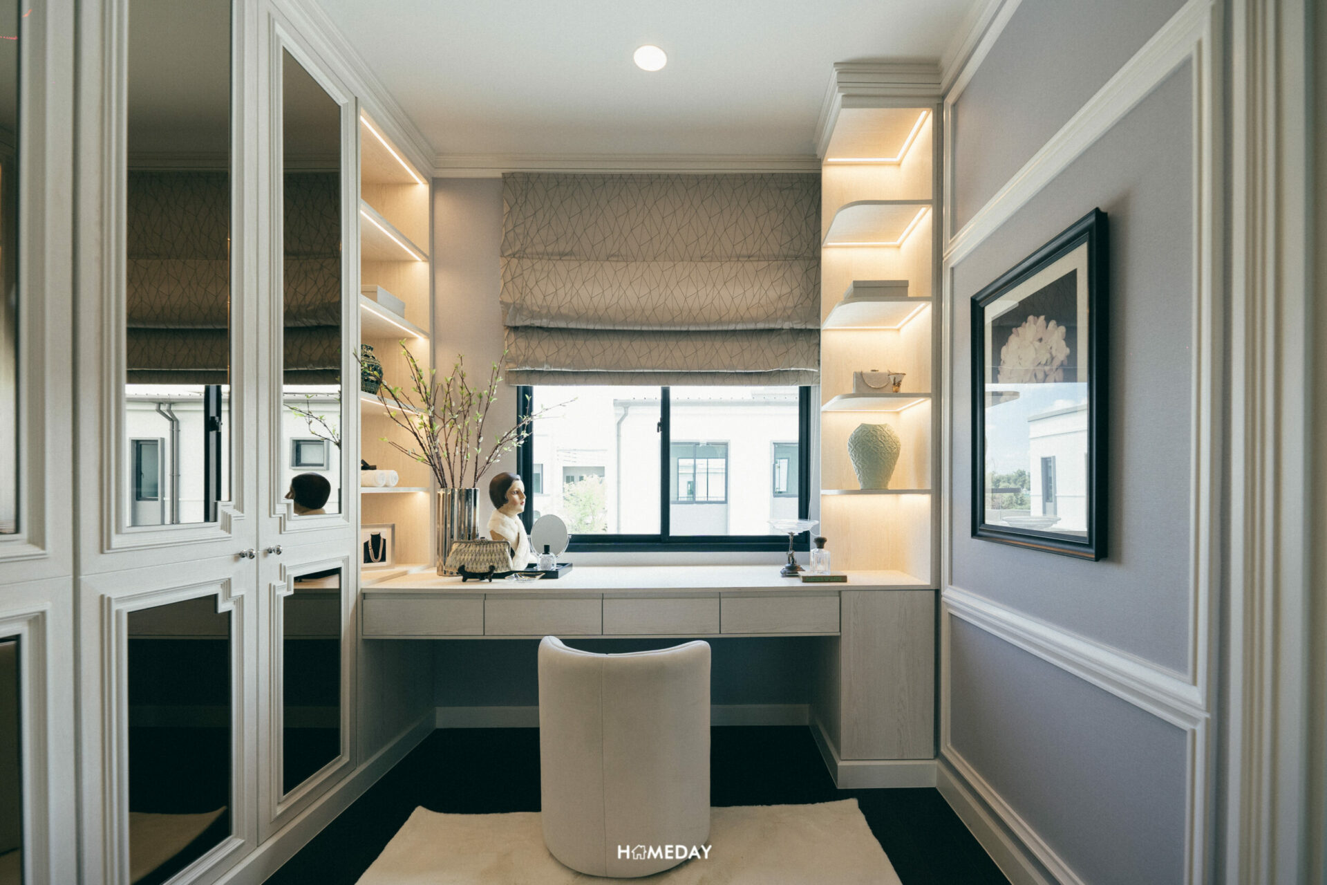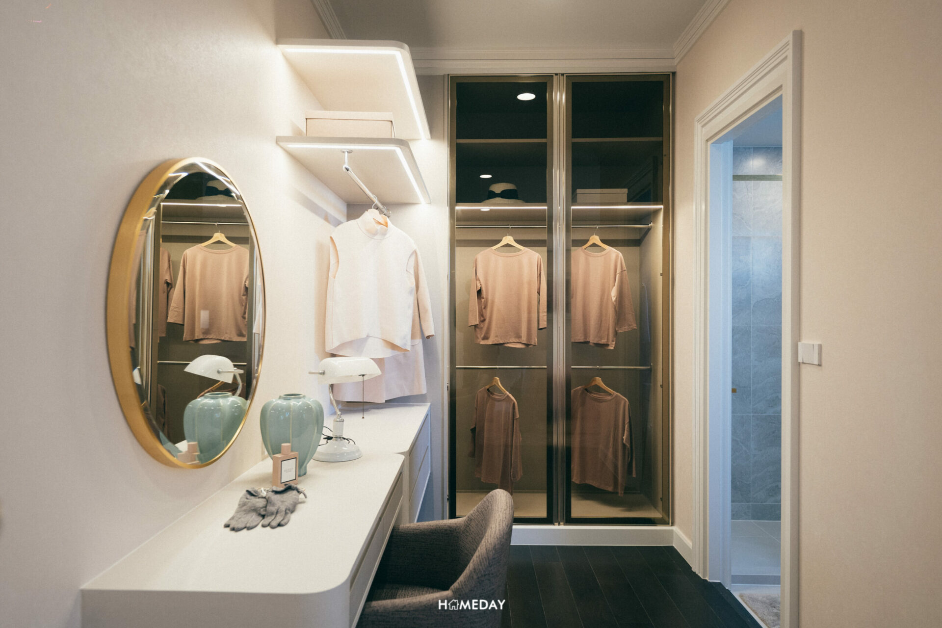 สามารถบิลต์อิน Walk-in Closet พร้อมโต๊ะอเนกประสงค์ ที่สามารถปรับเป็นโต๊ะเครื่องแป้งและโต๊ะทำงานได้ทั้งสองการใช้งาน ใครชอบไอเดียนี้ก็สามารถนำไปปรับใช้กันได้เลยครับ
