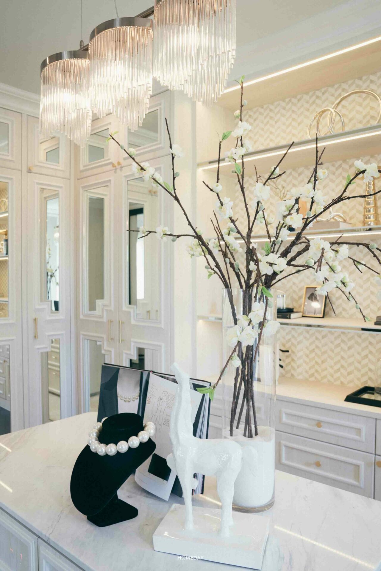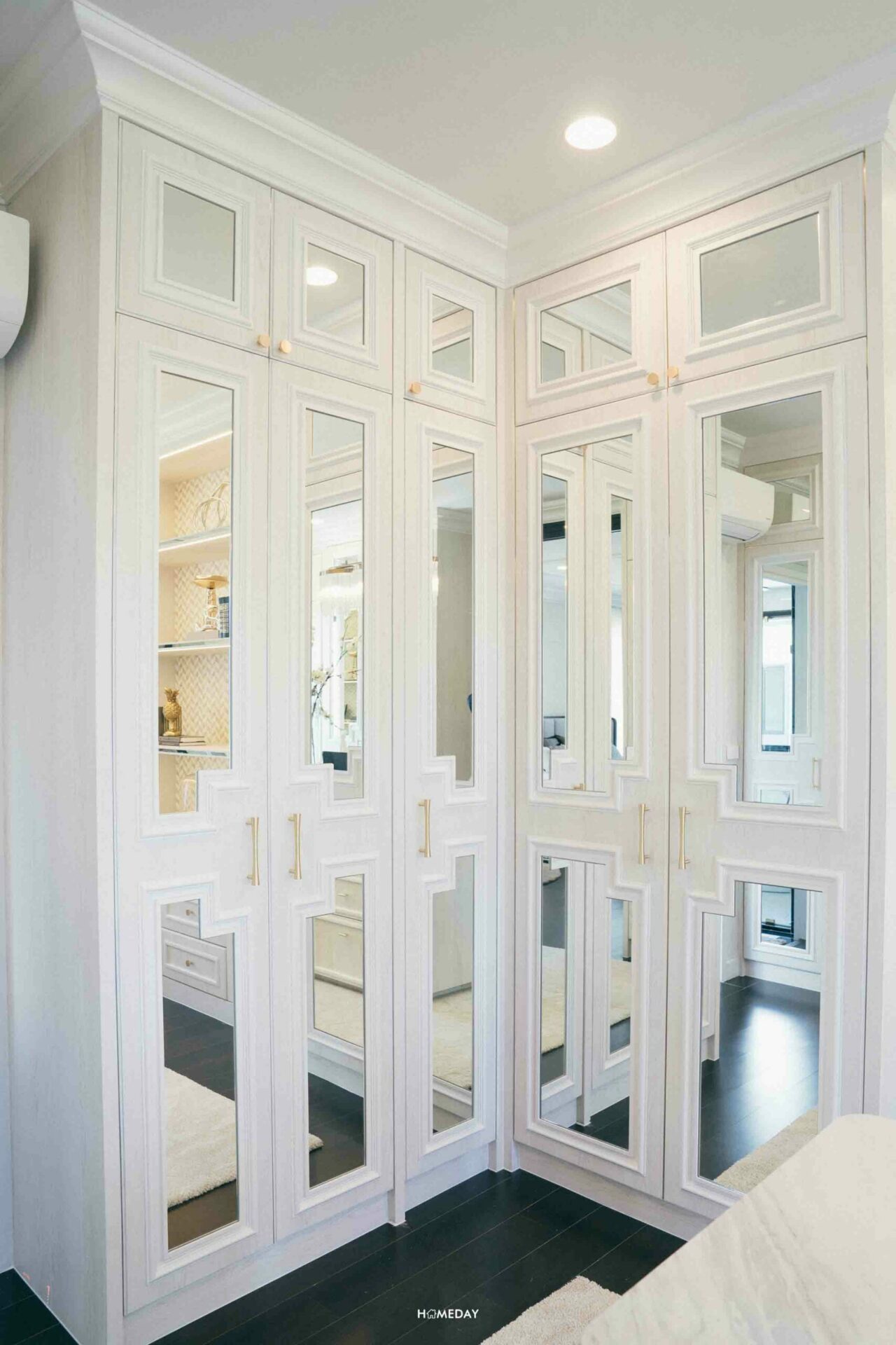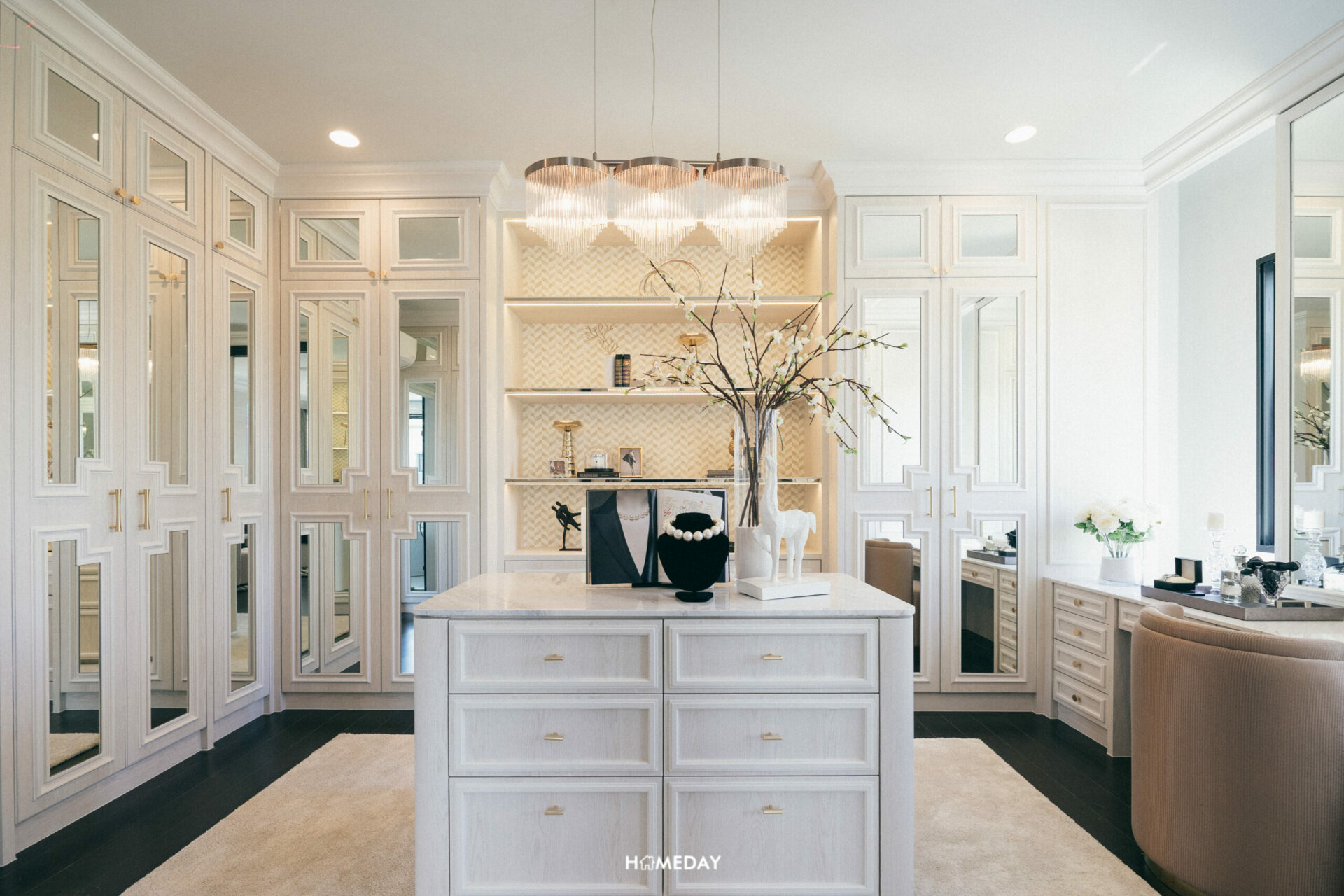 สามารถบิลต์อิน Walk-in Closet พร้อมโต๊ะอเนกประสงค์ ที่สามารถปรับเป็นโต๊ะเครื่องแป้งและโต๊ะทำงานได้ทั้งสองการใช้งาน ใครชอบไอเดียนี้ก็สามารถนำไปปรับใช้กันได้เลยครับ
