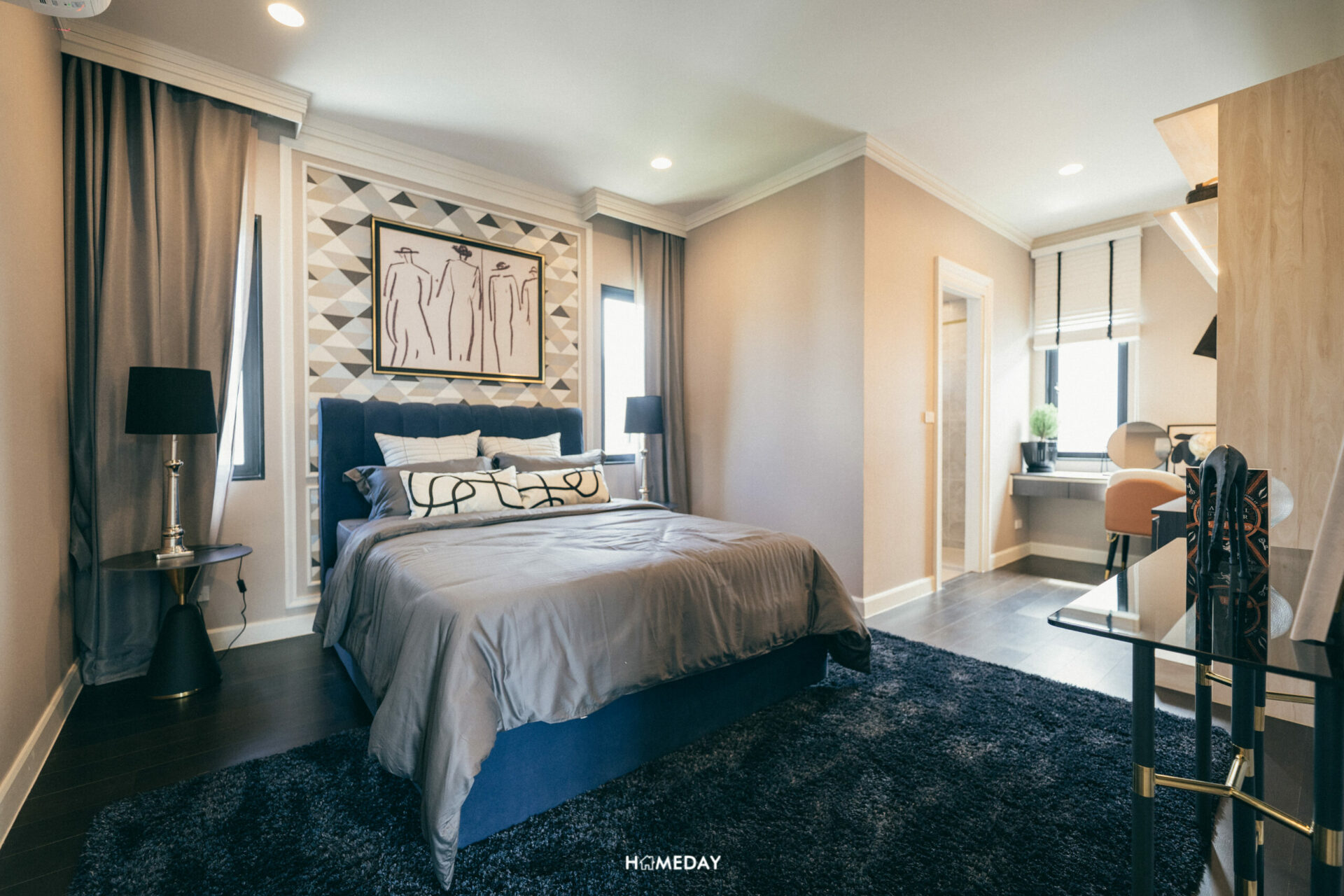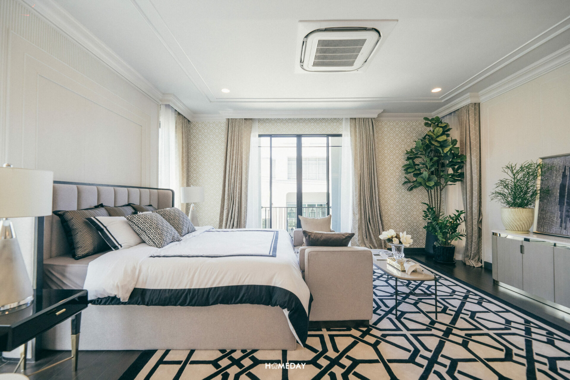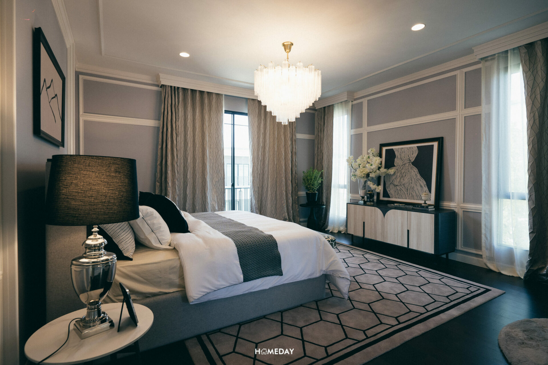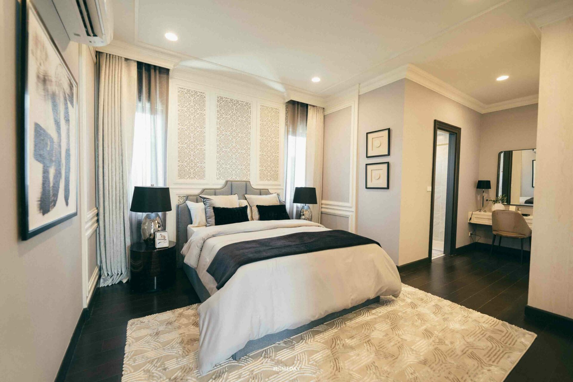 Grand Master Bedroom โอ่โถงมาก ๆ ตัวห้องอยู่ติดระเบียง ฝั่งด้านหน้าของตัวบ้าน และได้บานหน้าต่างเต็มความสูงห้องอีก 2 จุด ช่วยทำให้ห้องโปร่งได้เป็นอย่างดีเลยครับ